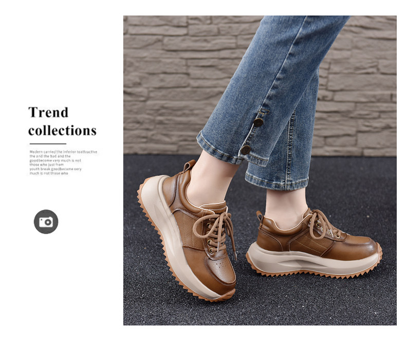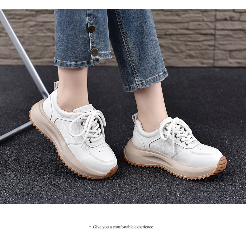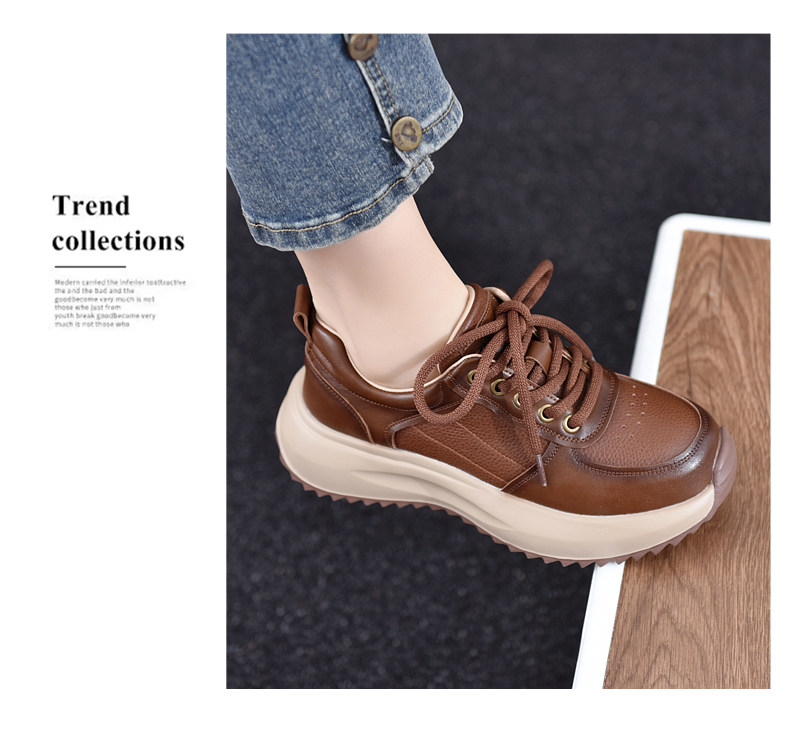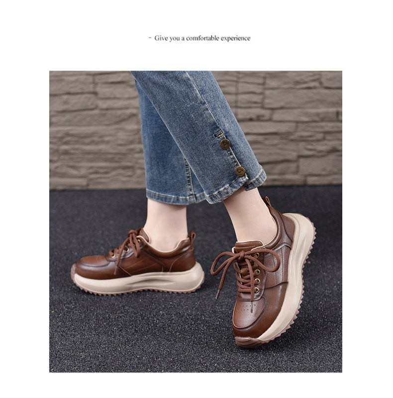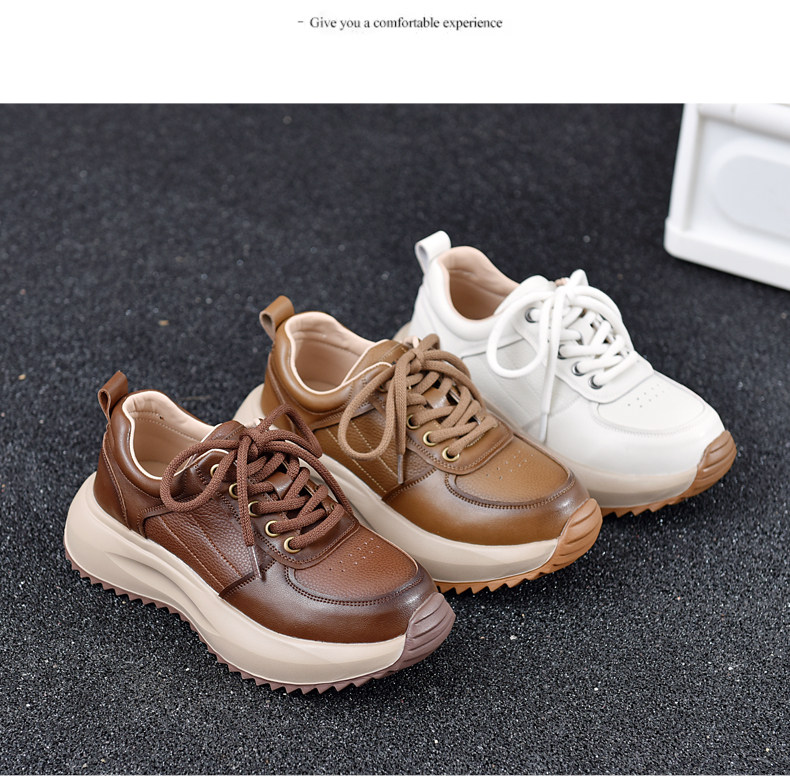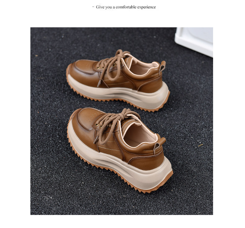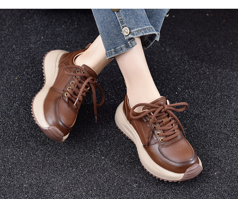 Genuine Leather Women's Shoes 2026 Spring and Autumn Thick-Soled Dad Shoes for Women in Khaki Color, Height-Increasing Versatile Sports Casual Shoes