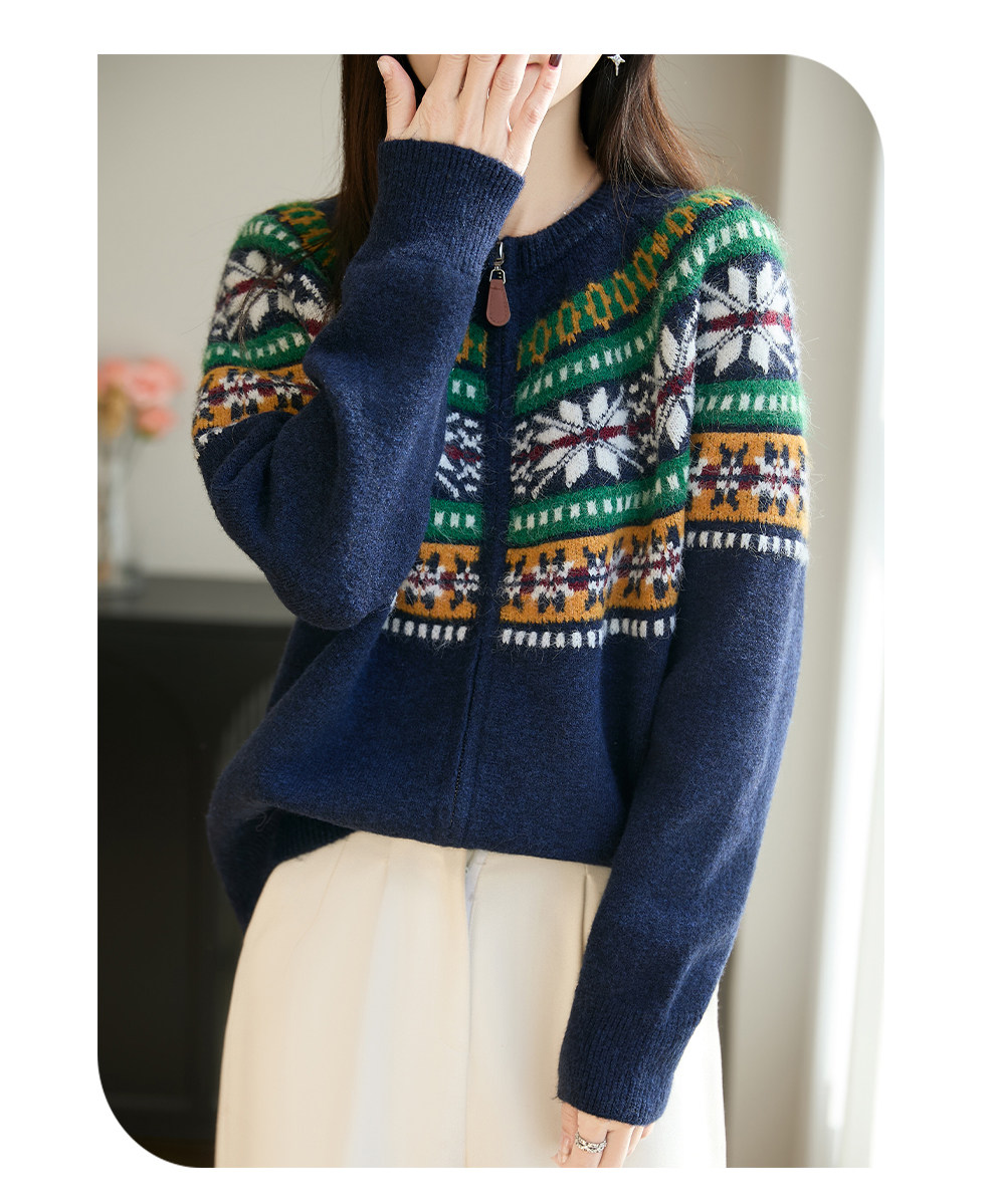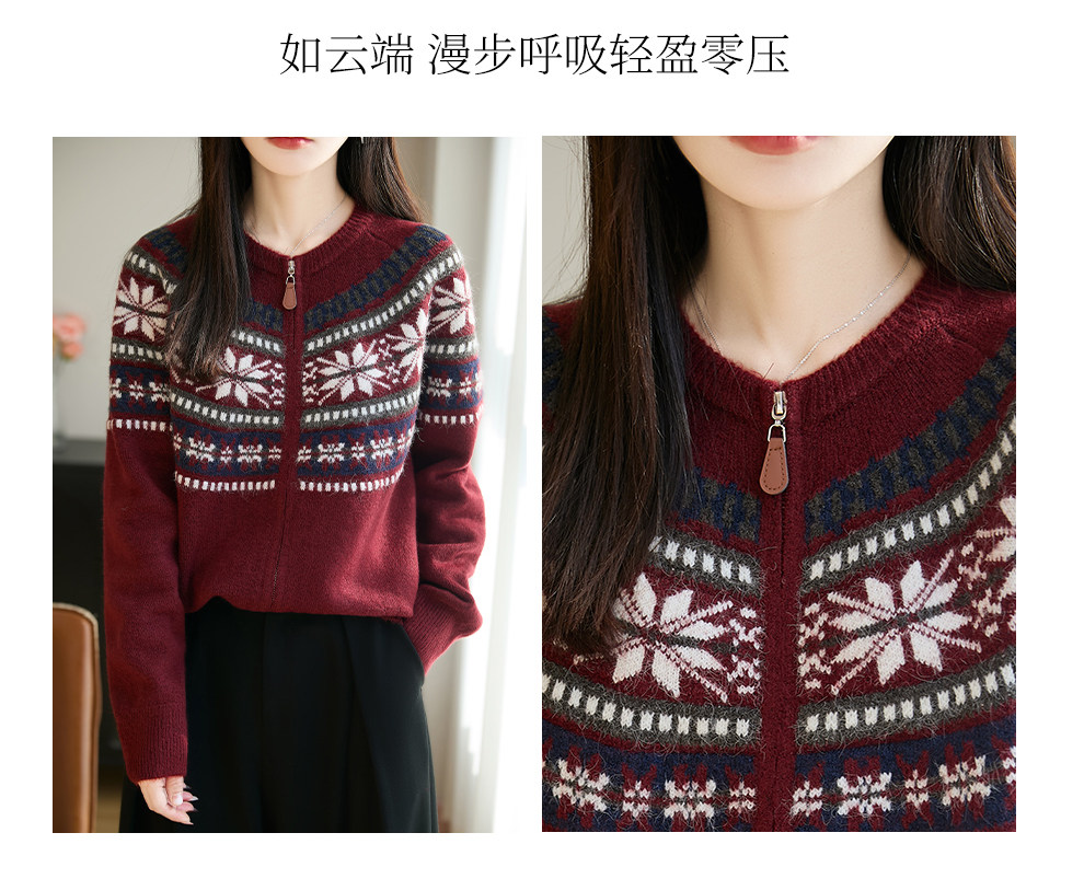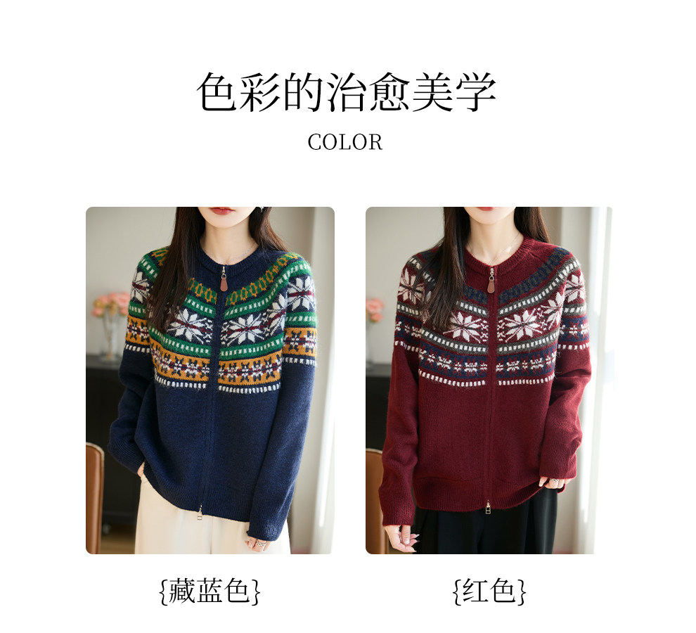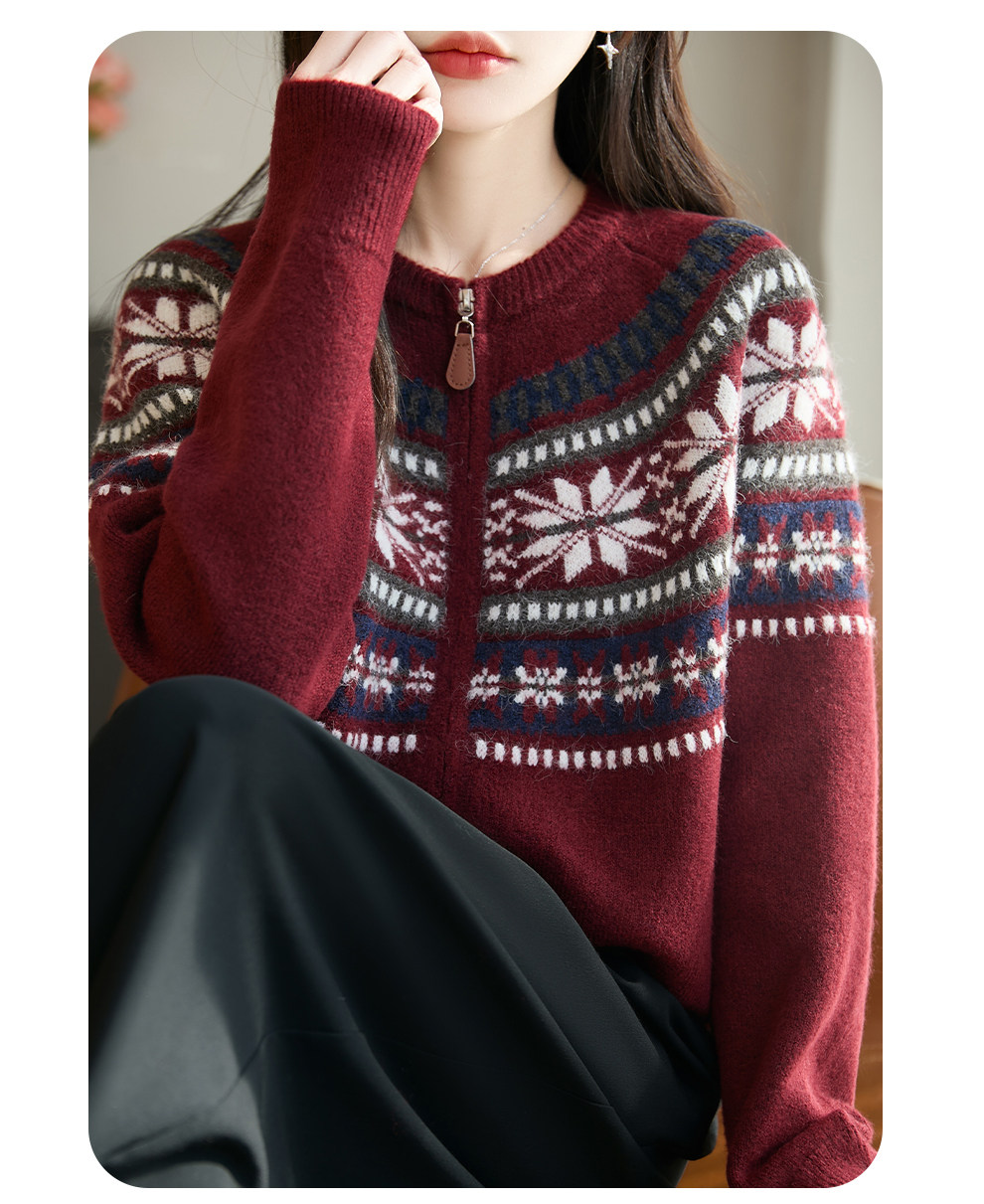 Fair Isle Style Retro Jacquard Knit Cardigan for Women, New Double-Zip Red Sweater Coat, Warm Base Layer Trendy Top