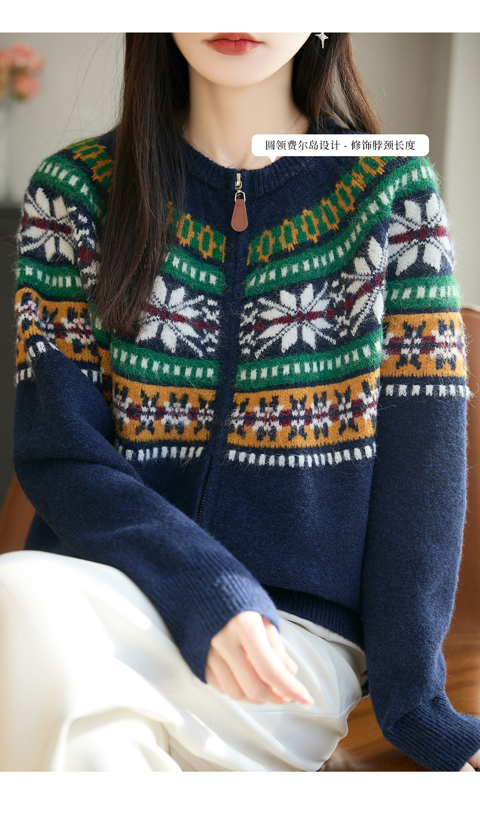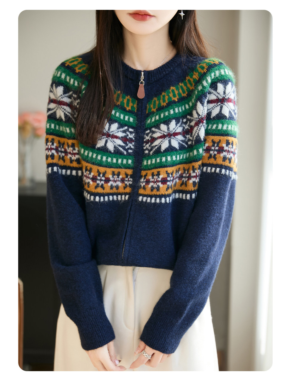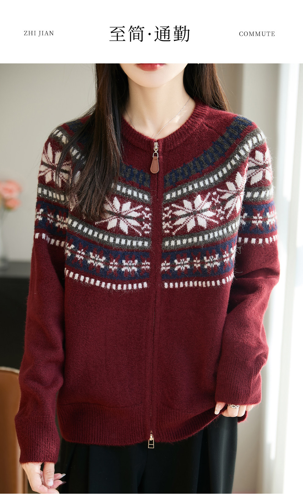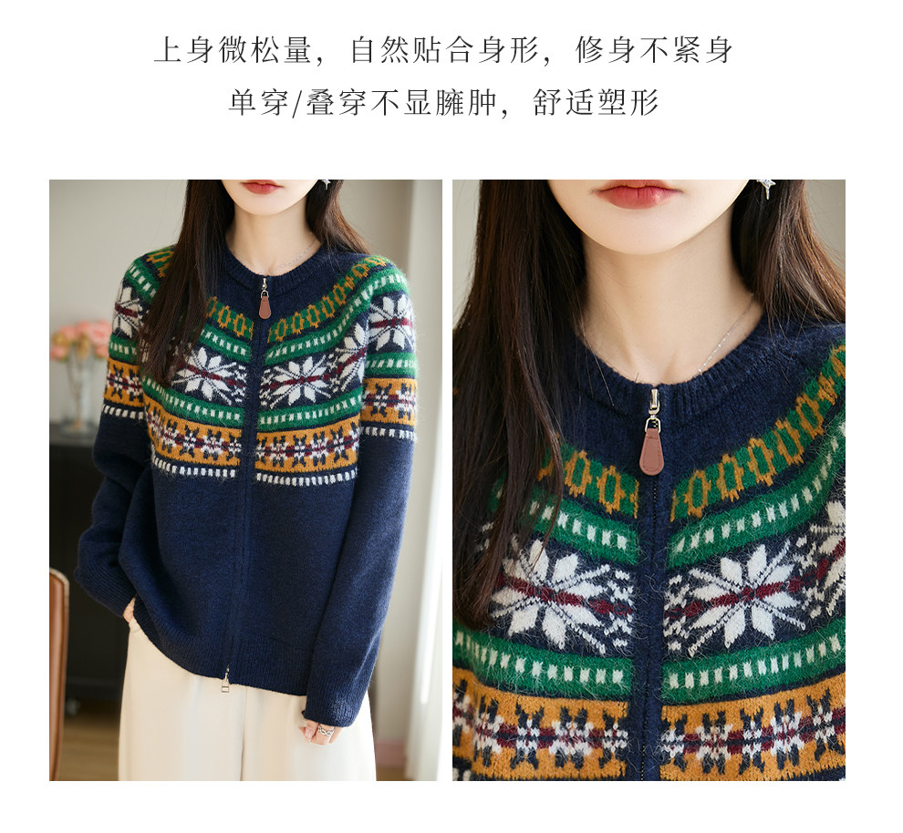 Fair Isle Style Retro Jacquard Knit Cardigan for Women, New Double-Zip Red Sweater Coat, Warm Base Layer Trendy Top