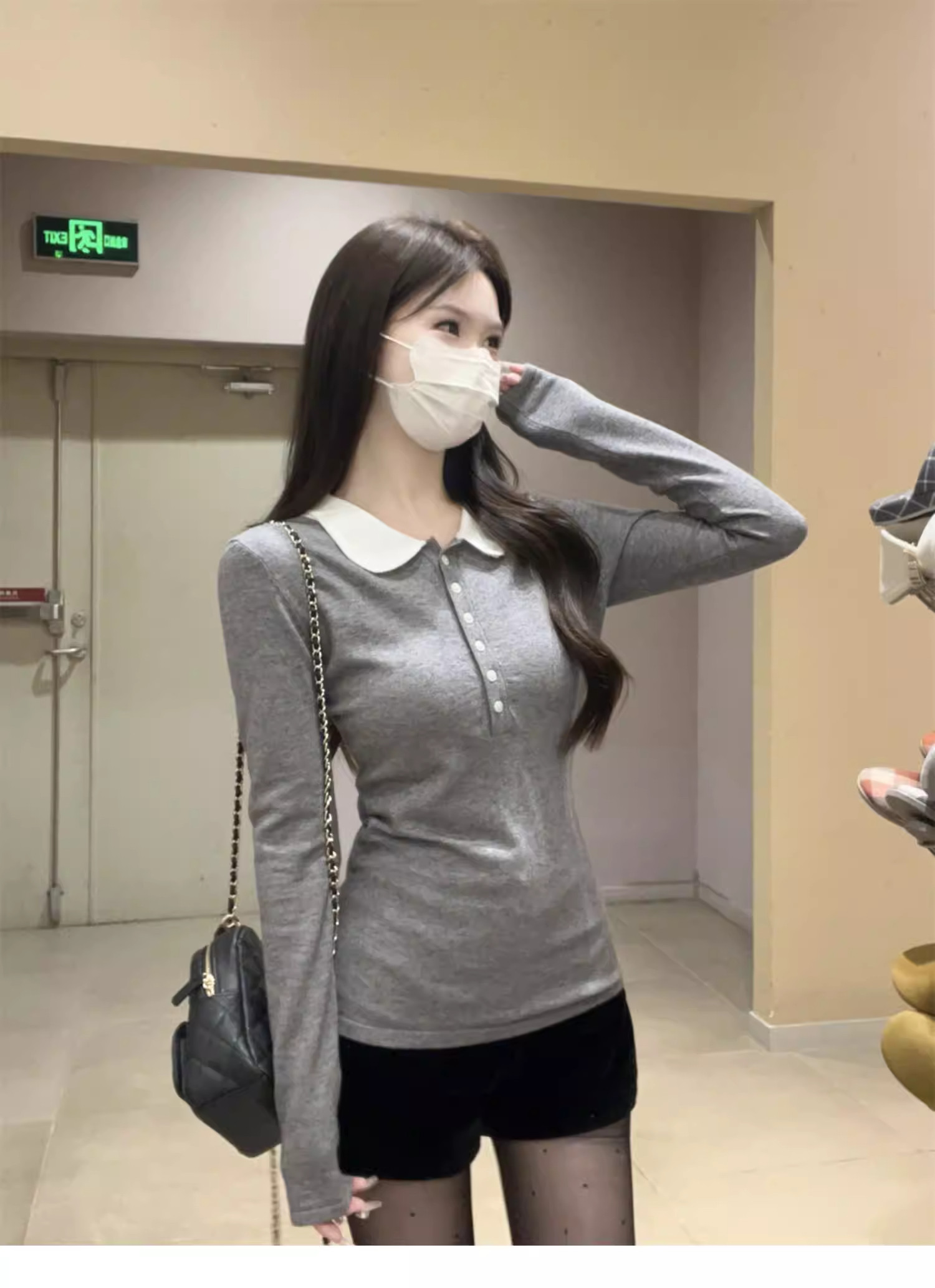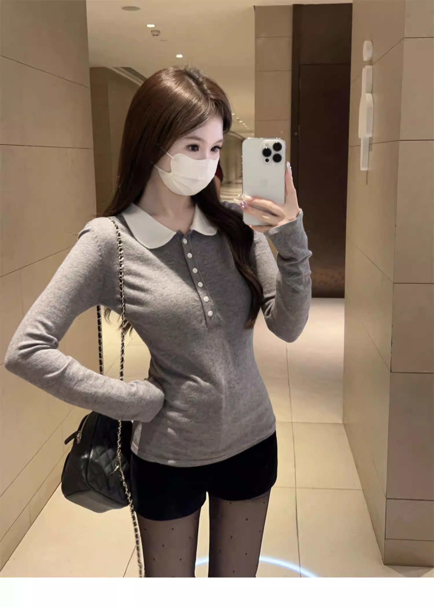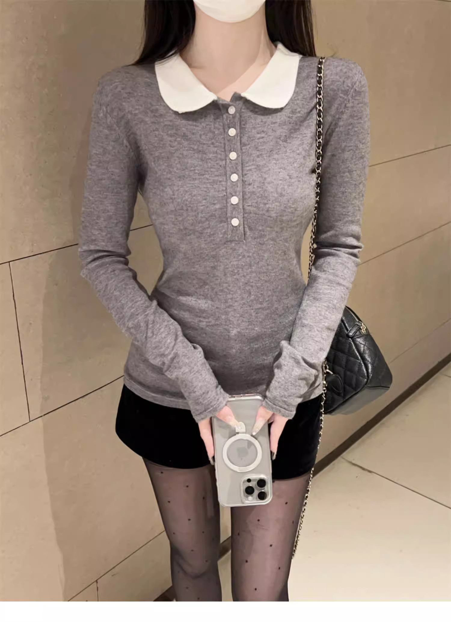 Gray Lapel Long Sleeve T-Shirt Women's 2026 Spring New Style Slim Fit Doll Collar Bottoming Shirt Top