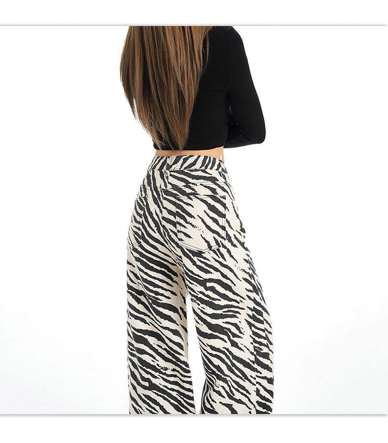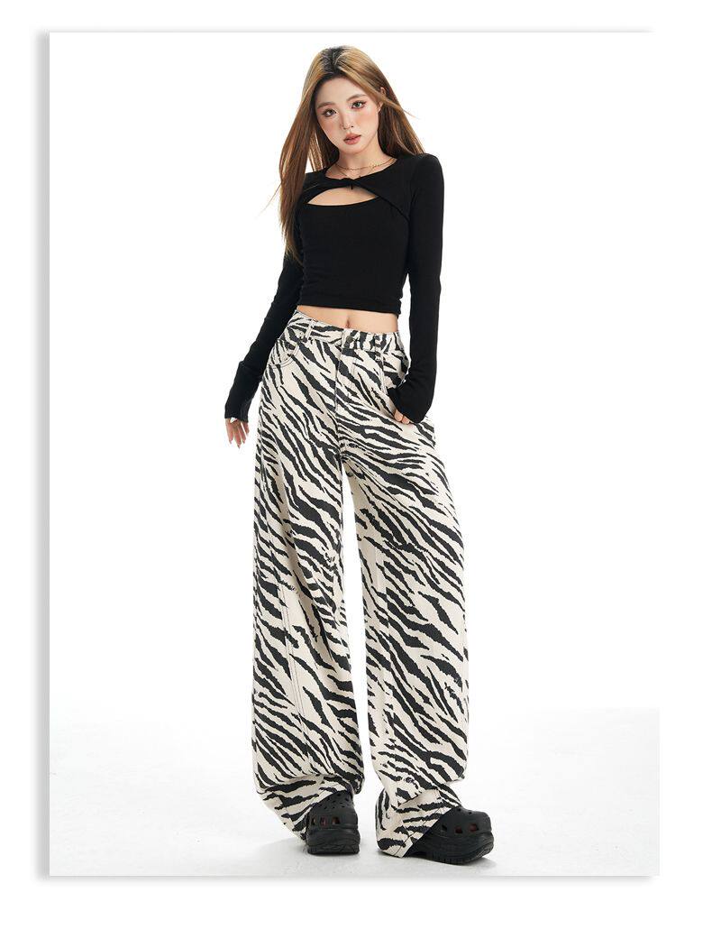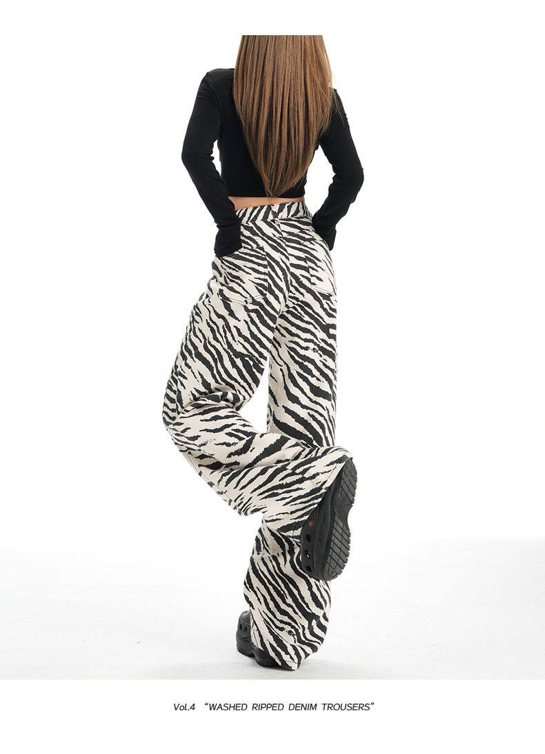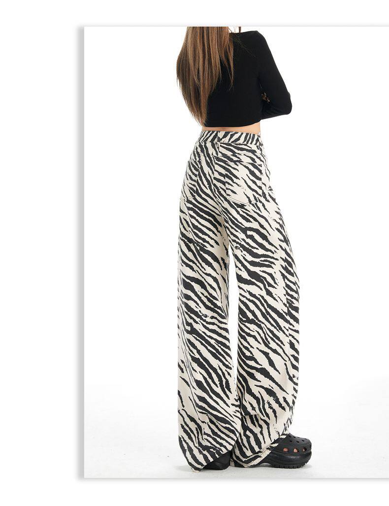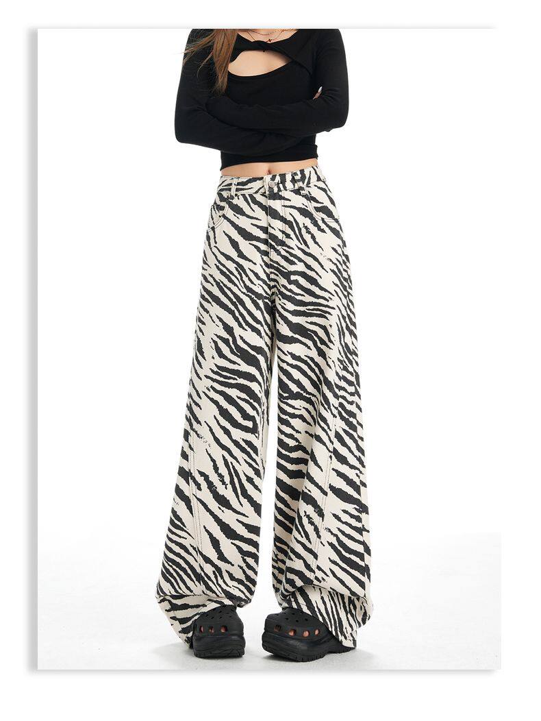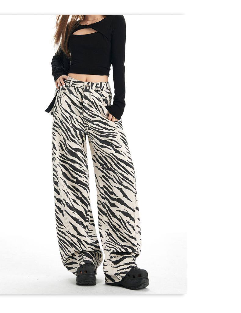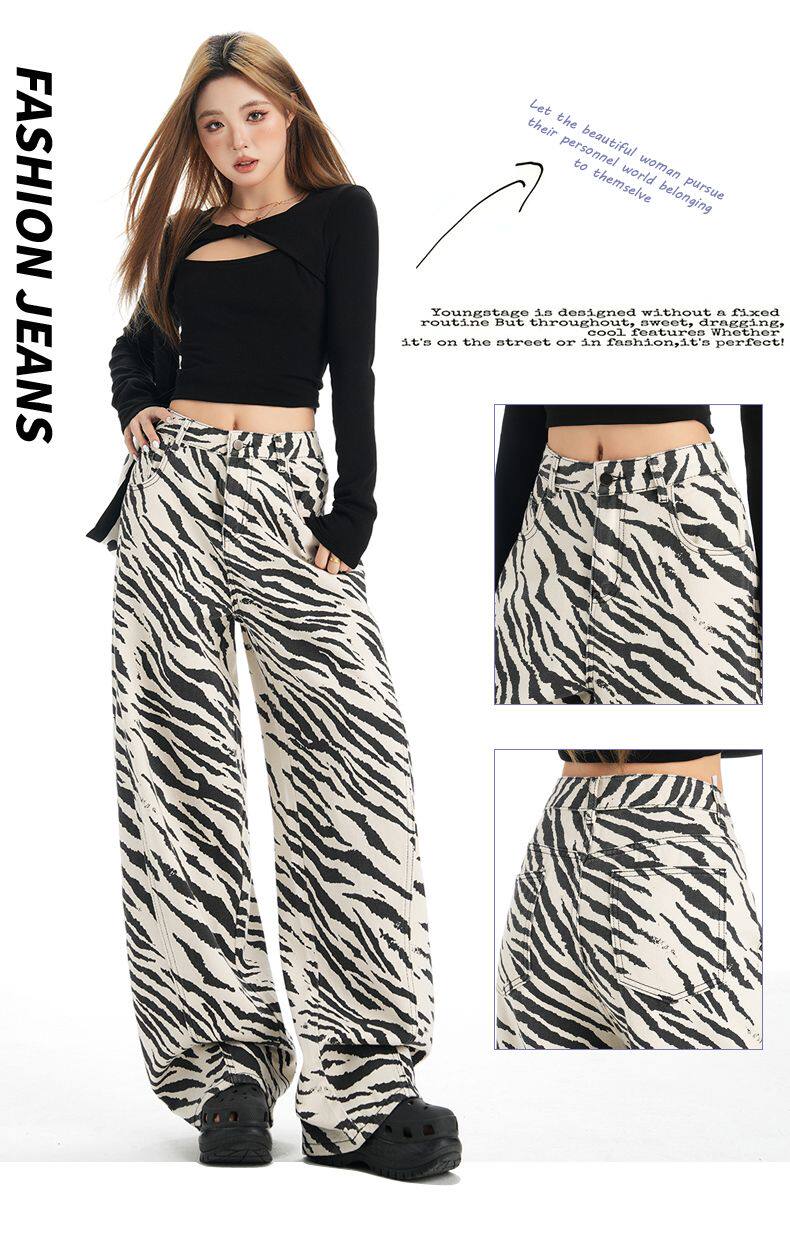 2026 New Style American Retro Zebra Print Wide-Leg Jeans for Women, High-Waisted Loose Straight-Leg Pants, Street Casual Style