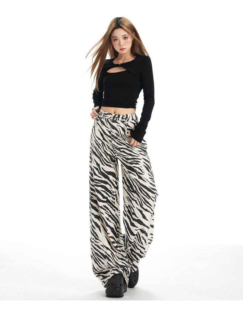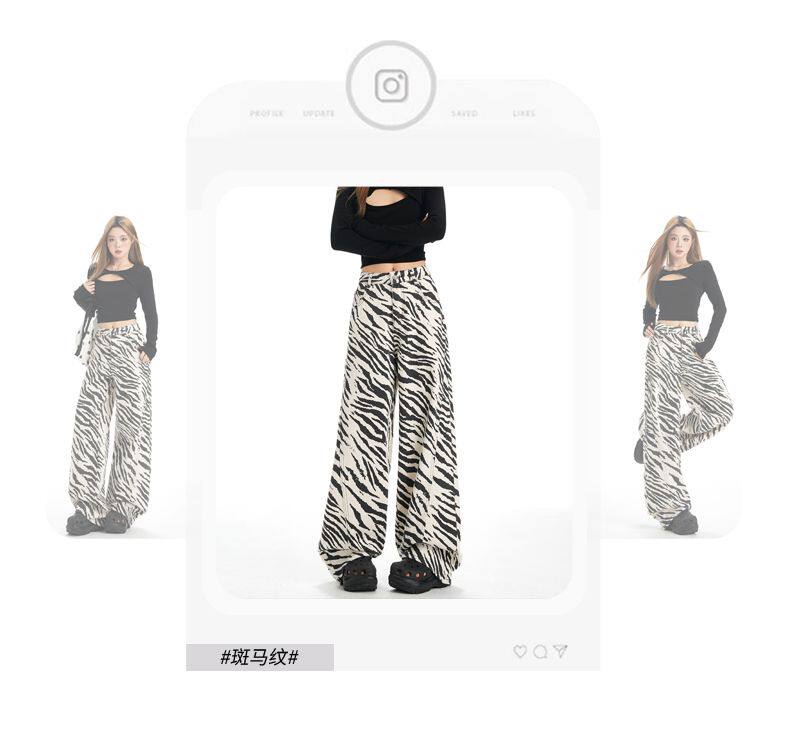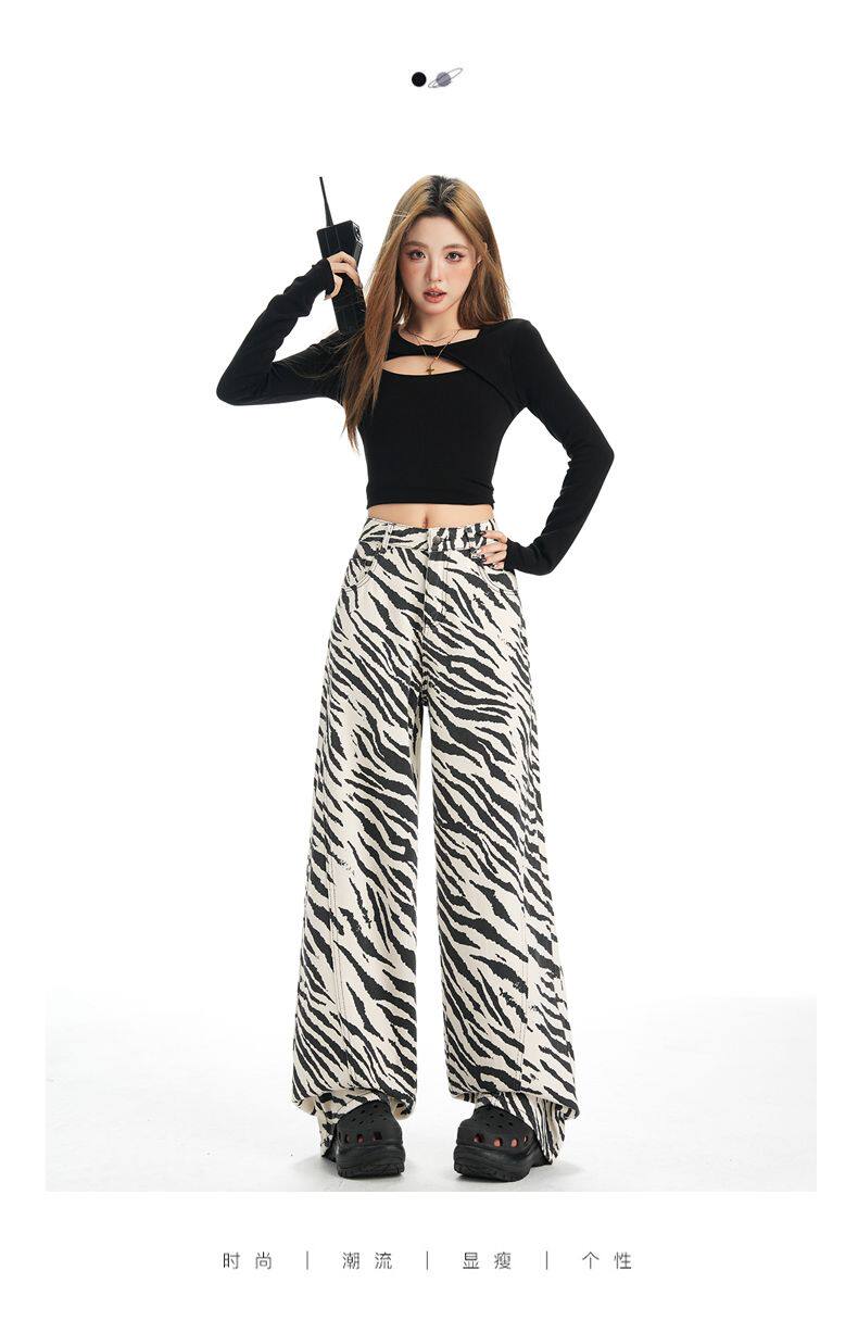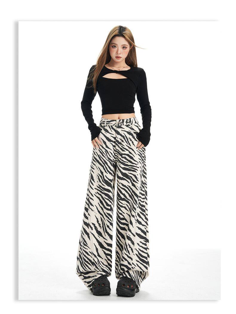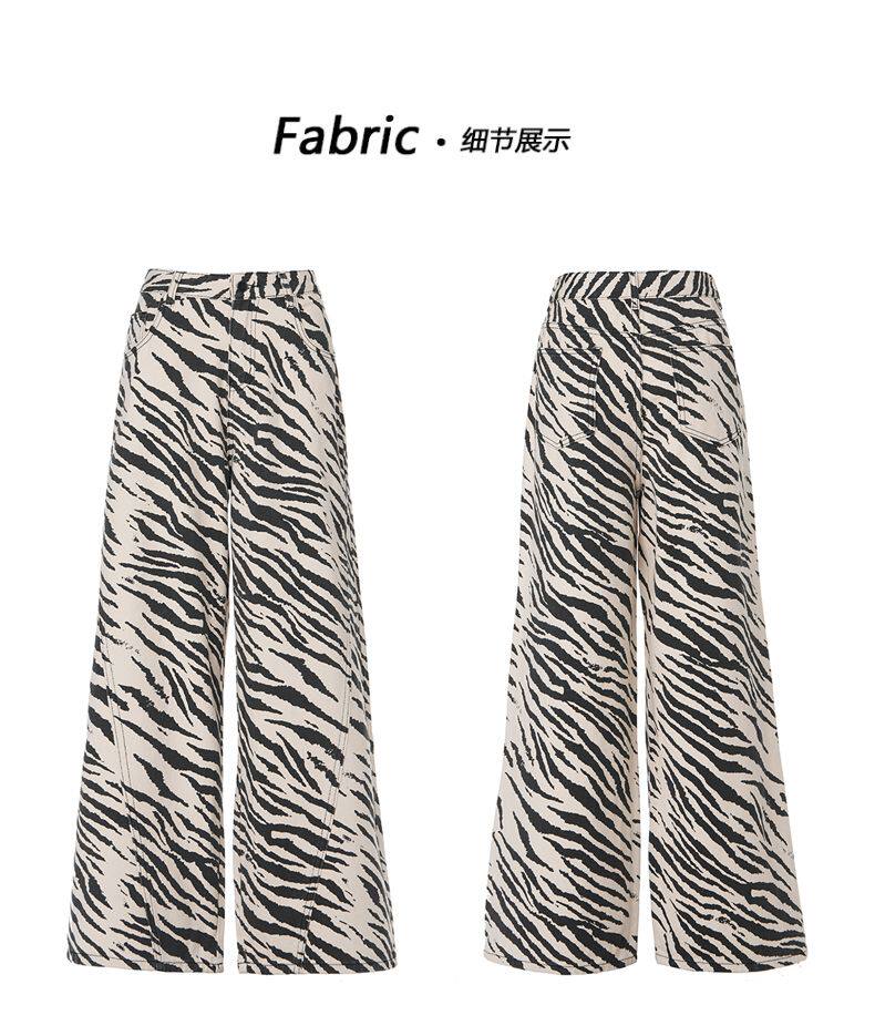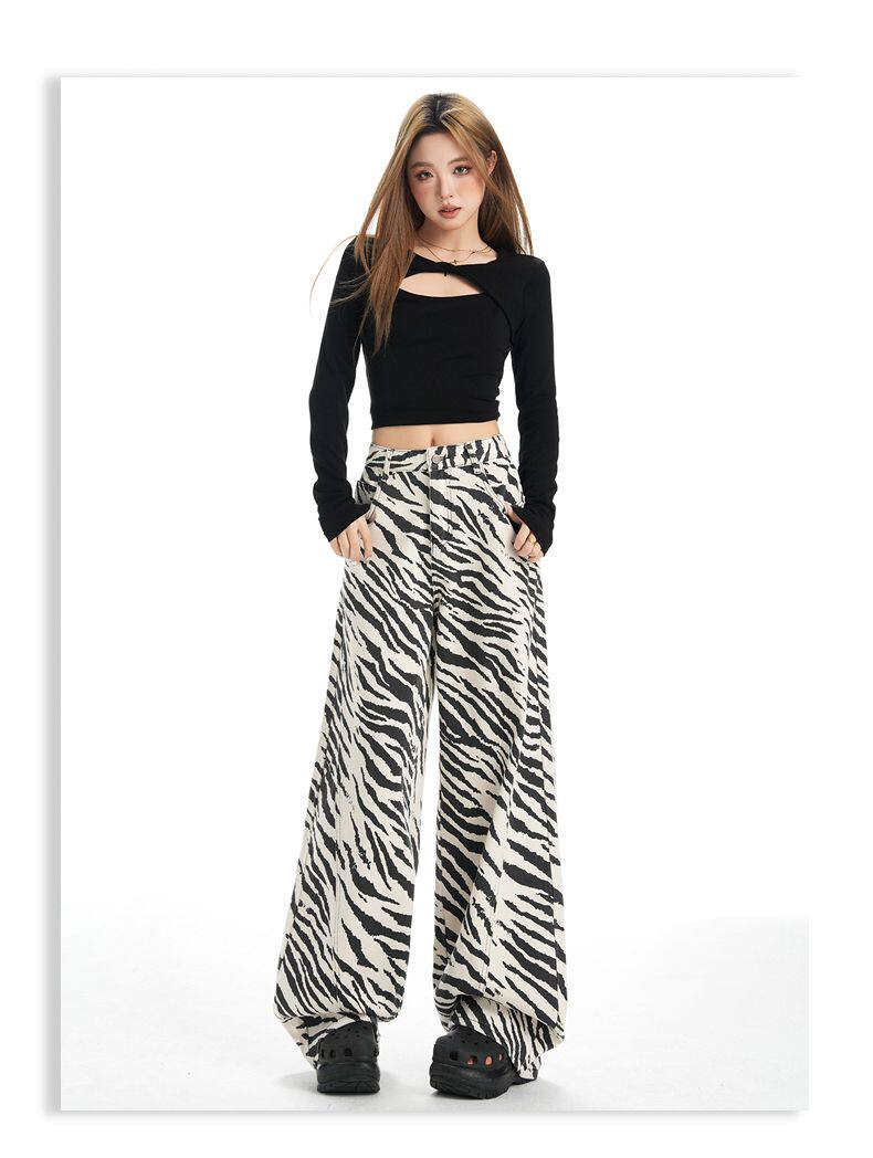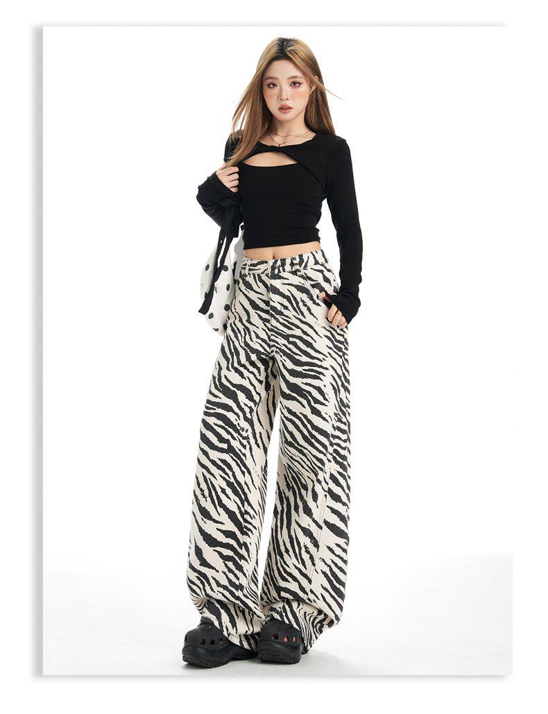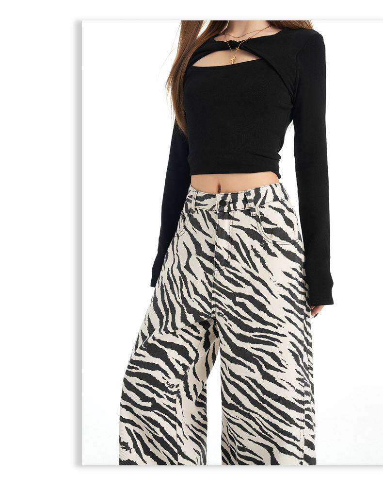 2026 New Style American Retro Zebra Print Wide-Leg Jeans for Women, High-Waisted Loose Straight-Leg Pants, Street Casual Style