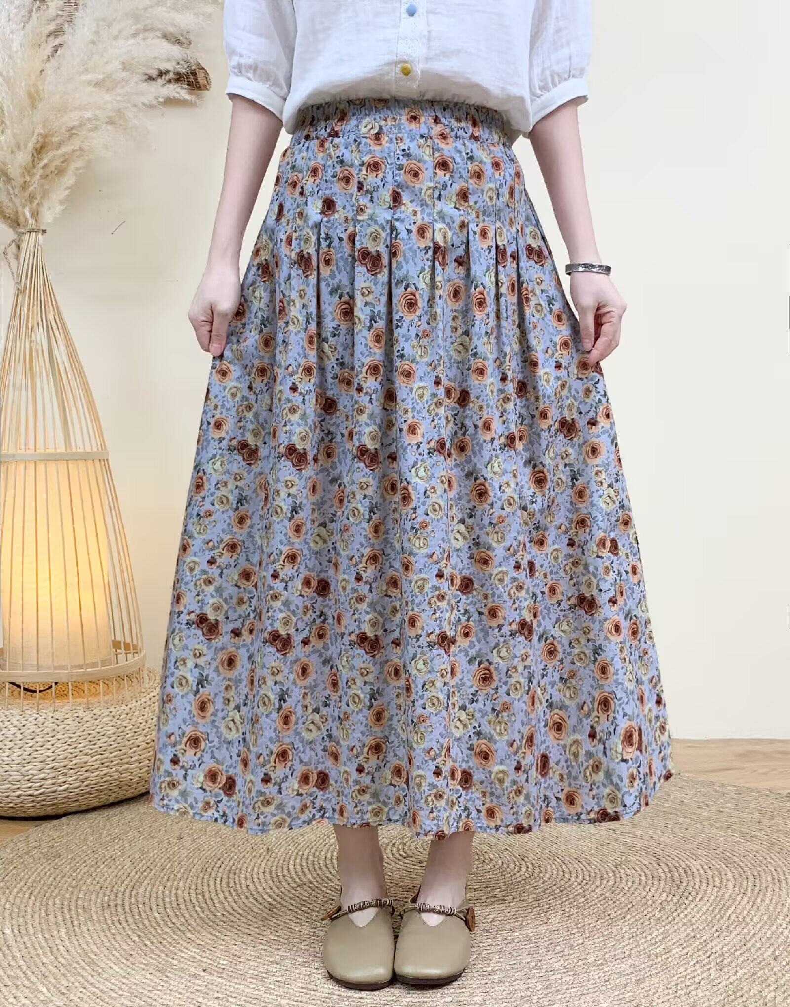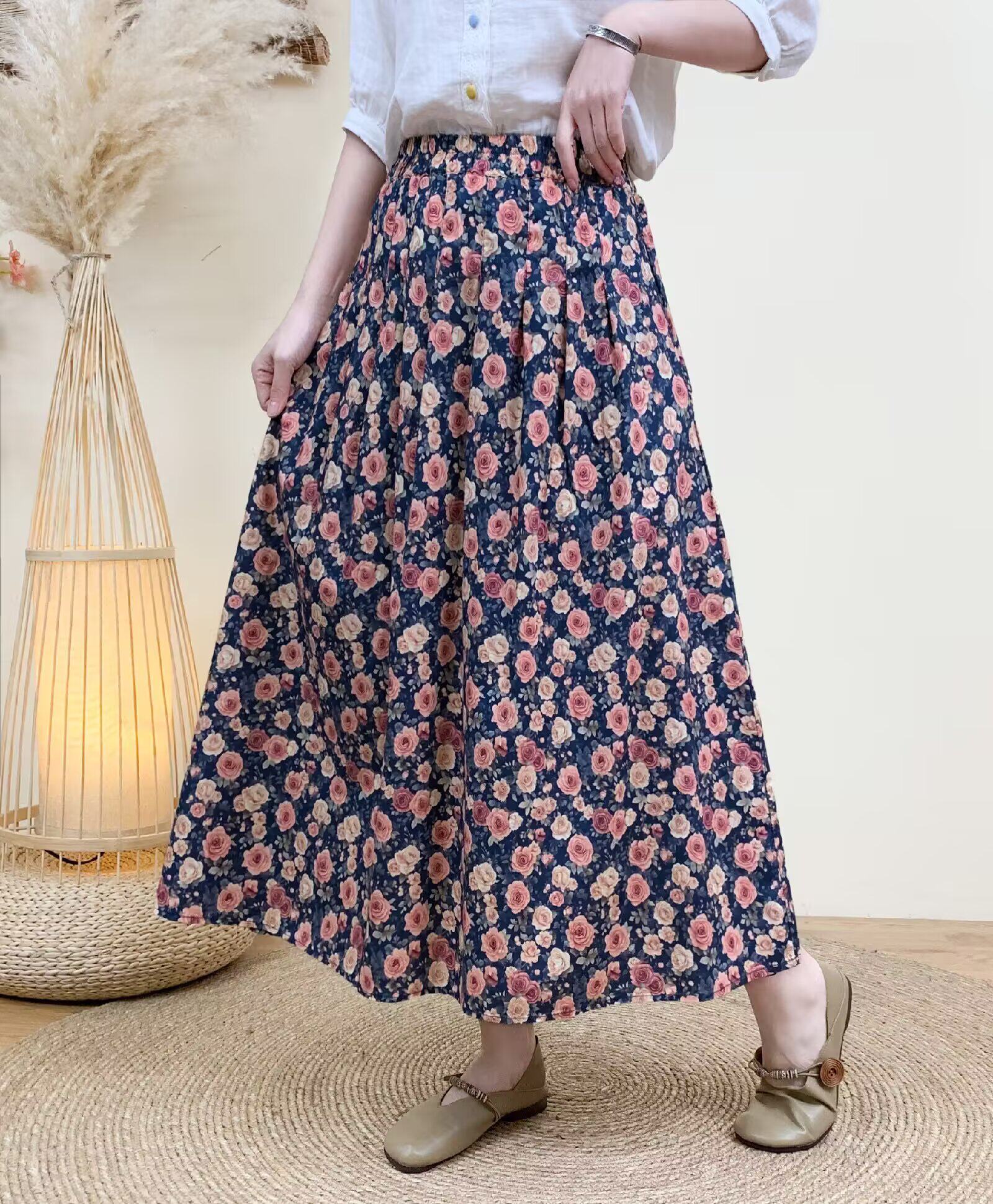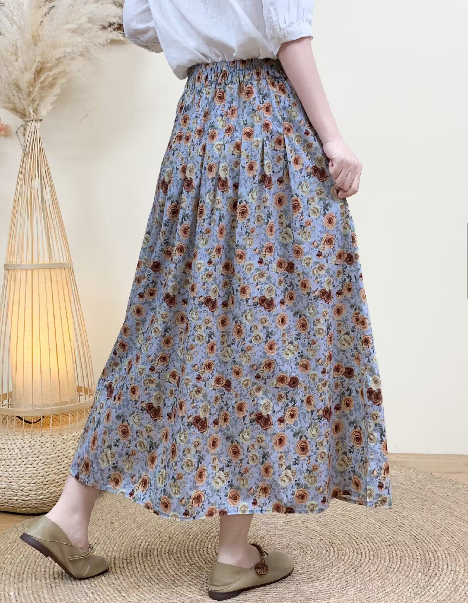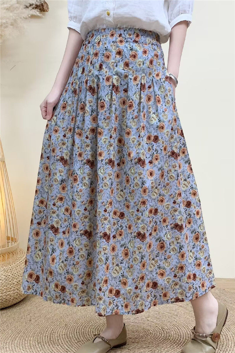2026 Early Spring Women's Pure Cotton Floral Print Skirt, Trendy Printed Long Skirt with Large Hem and Elastic Waist A-Line Skirt