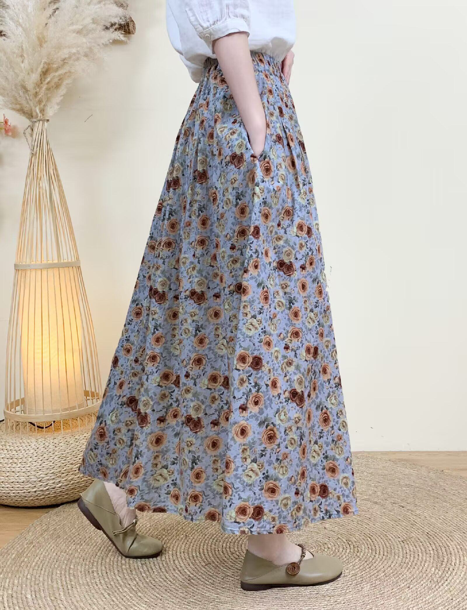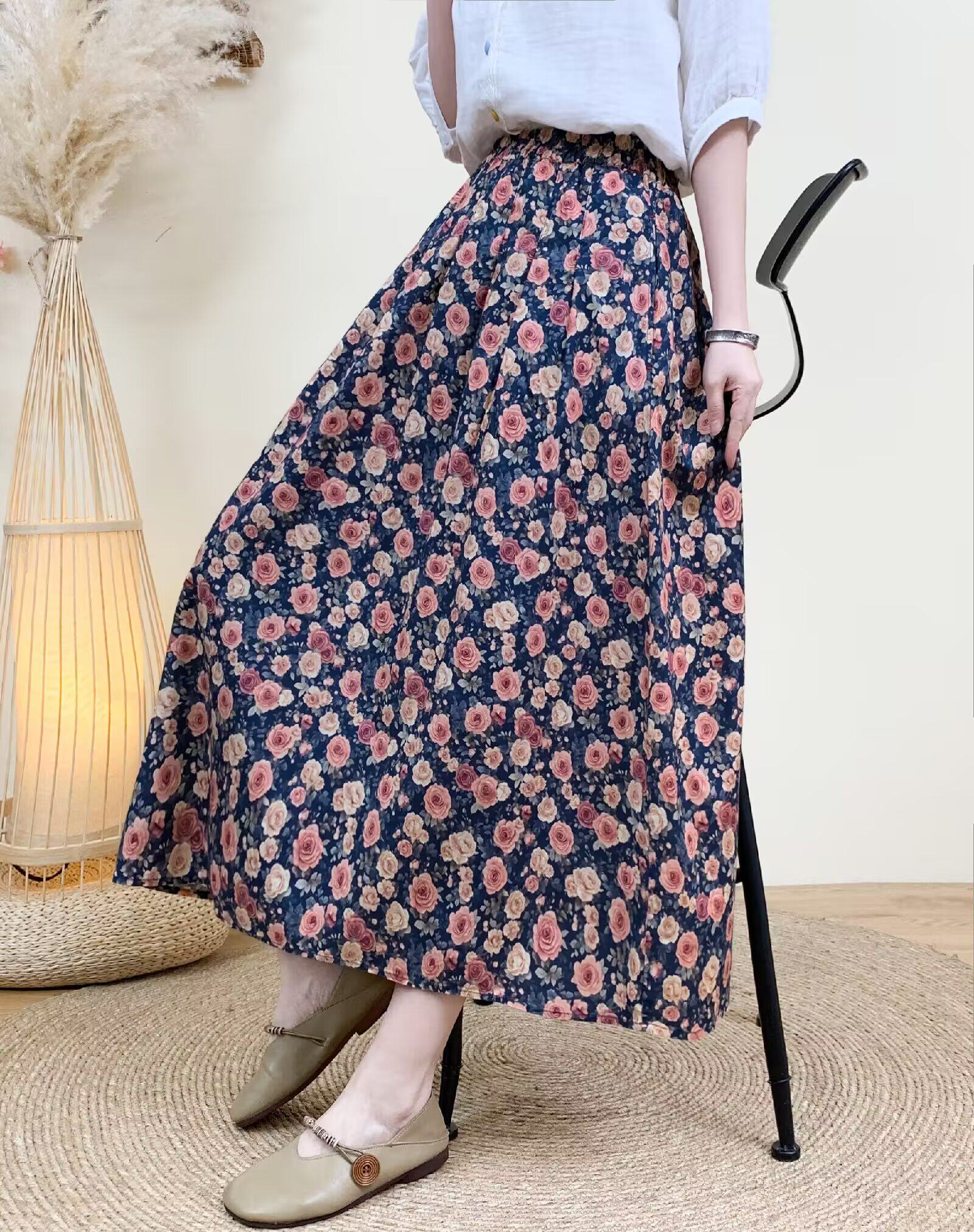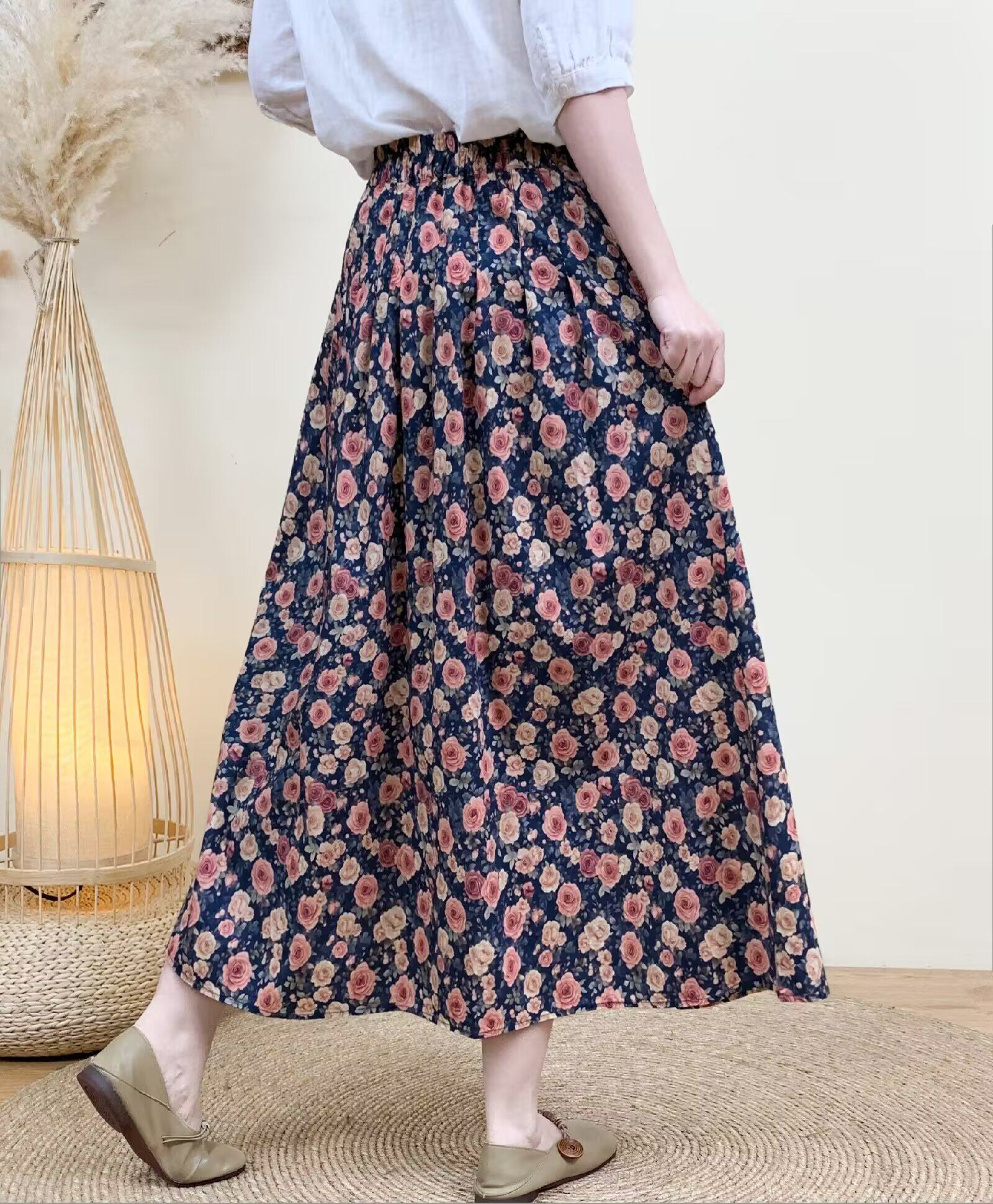2026 Early Spring Women's Pure Cotton Floral Print Skirt, Trendy Printed Long Skirt with Large Hem and Elastic Waist A-Line Skirt