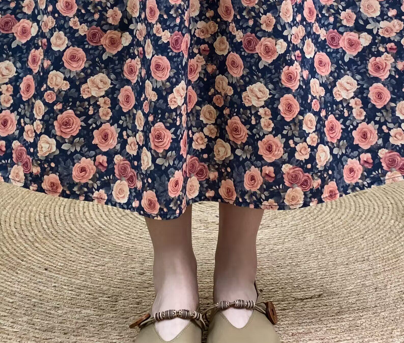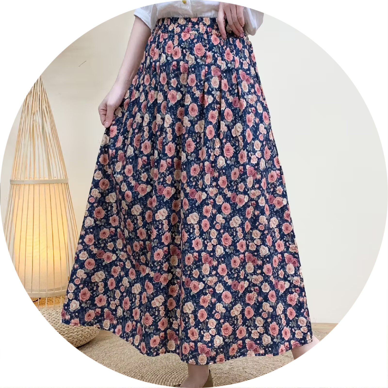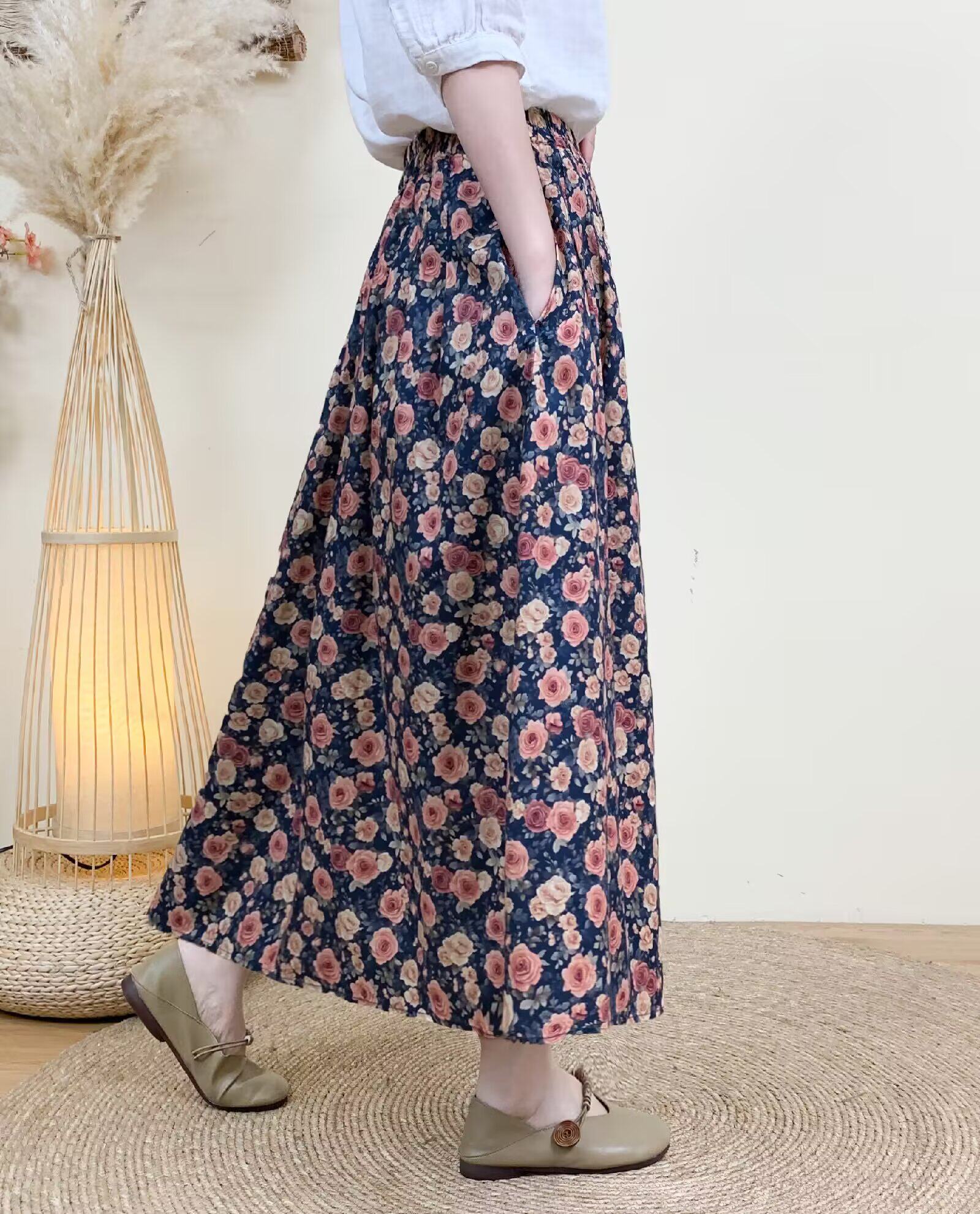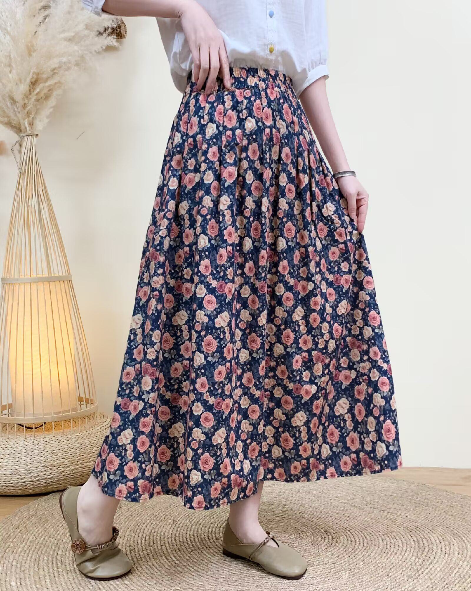 2026 Early Spring Women's Pure Cotton Floral Print Skirt, Trendy Printed Long Skirt with Large Hem and Elastic Waist A-Line Skirt