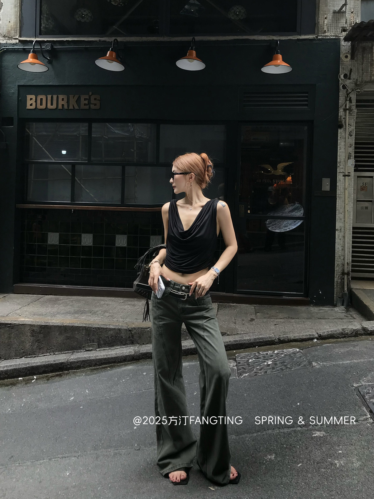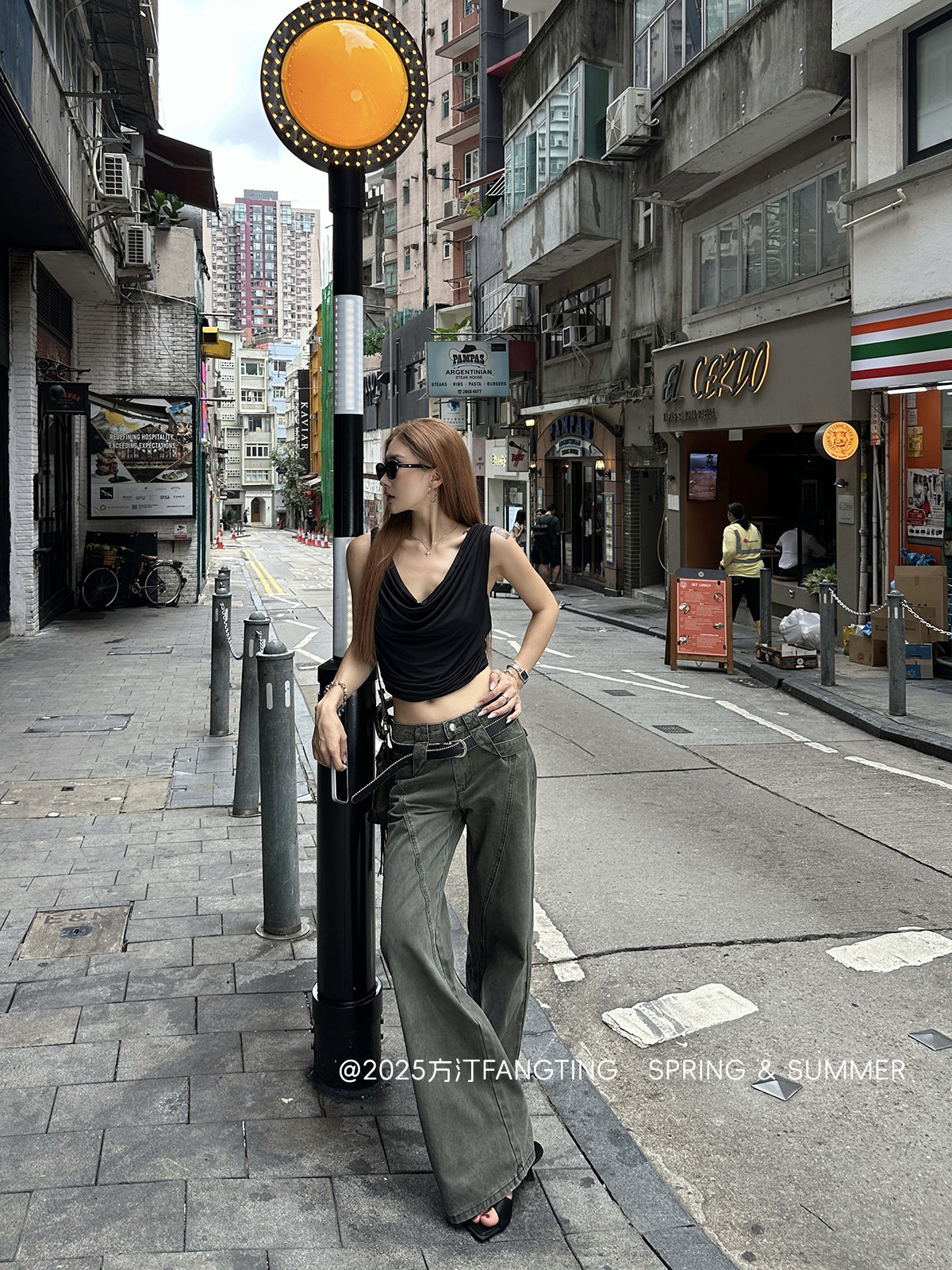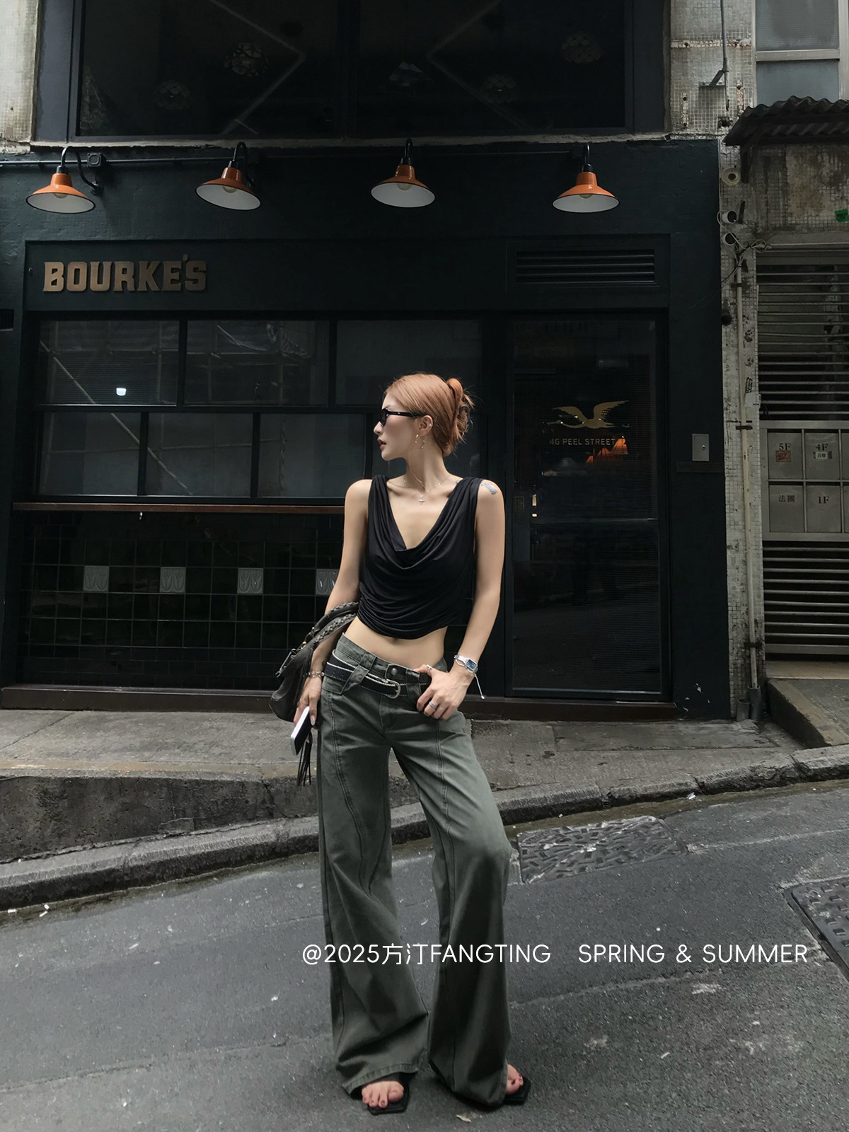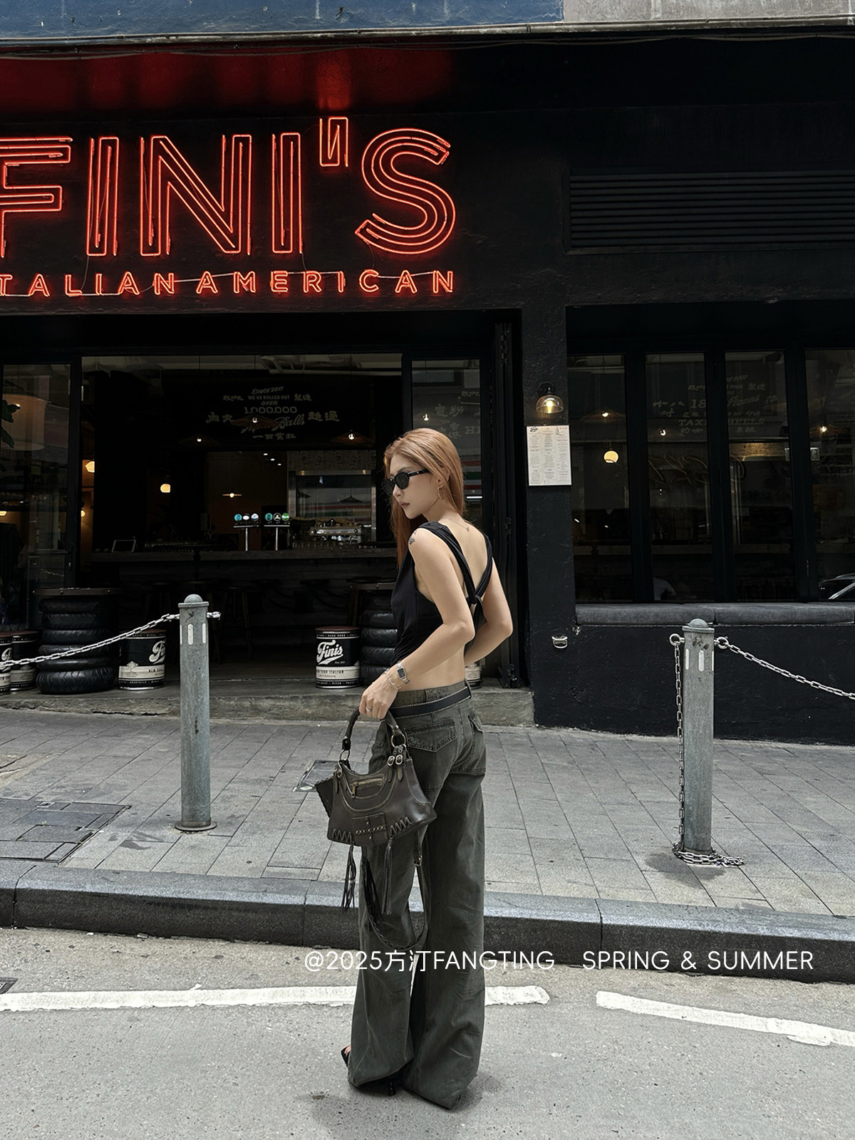 Fangting workwear army green pants women's spring and summer american retro slightly flared low waist wide leg casual pants