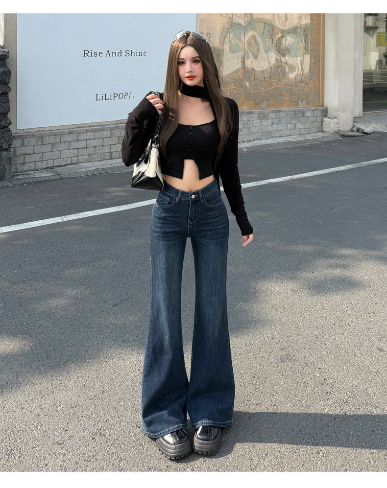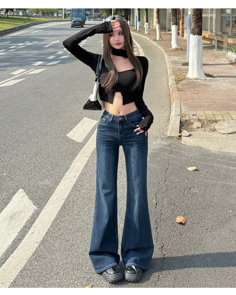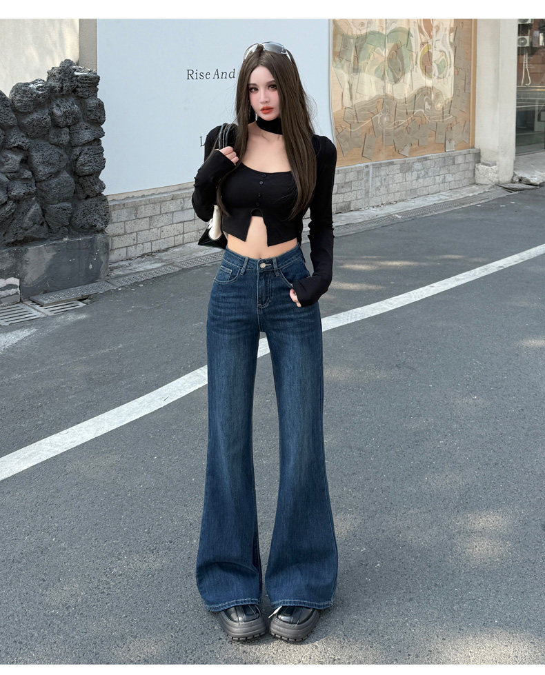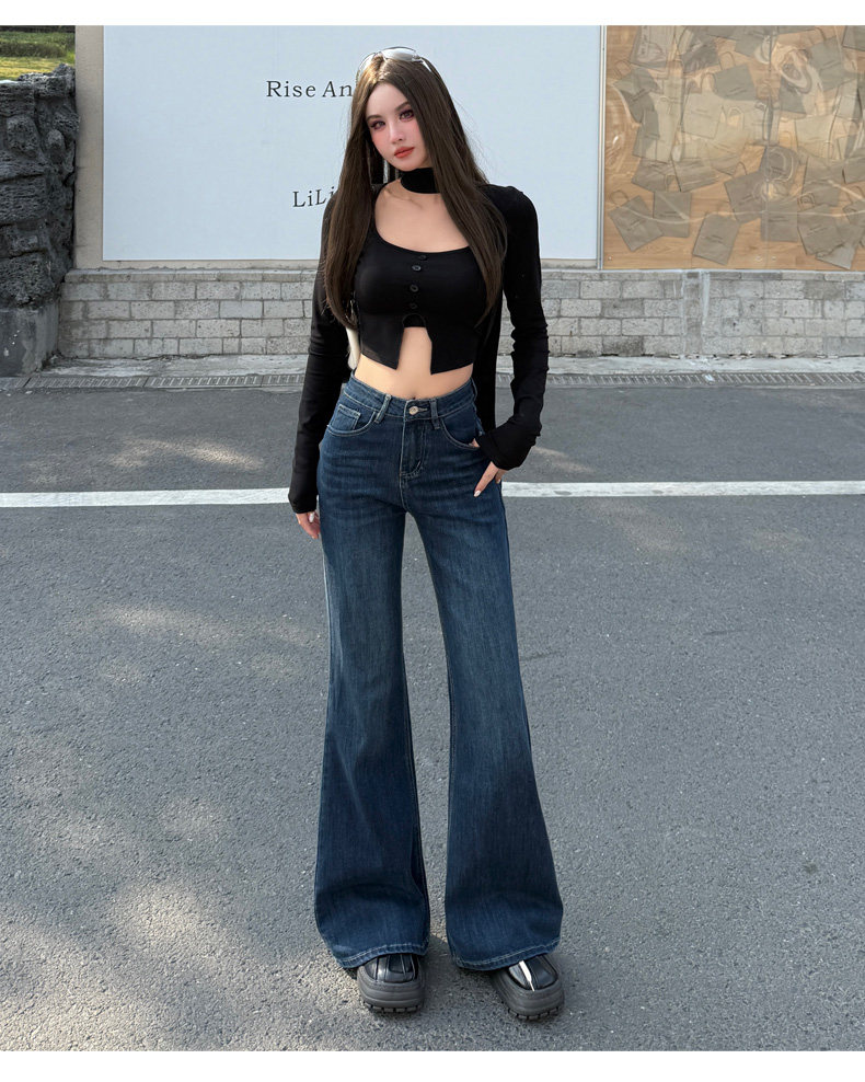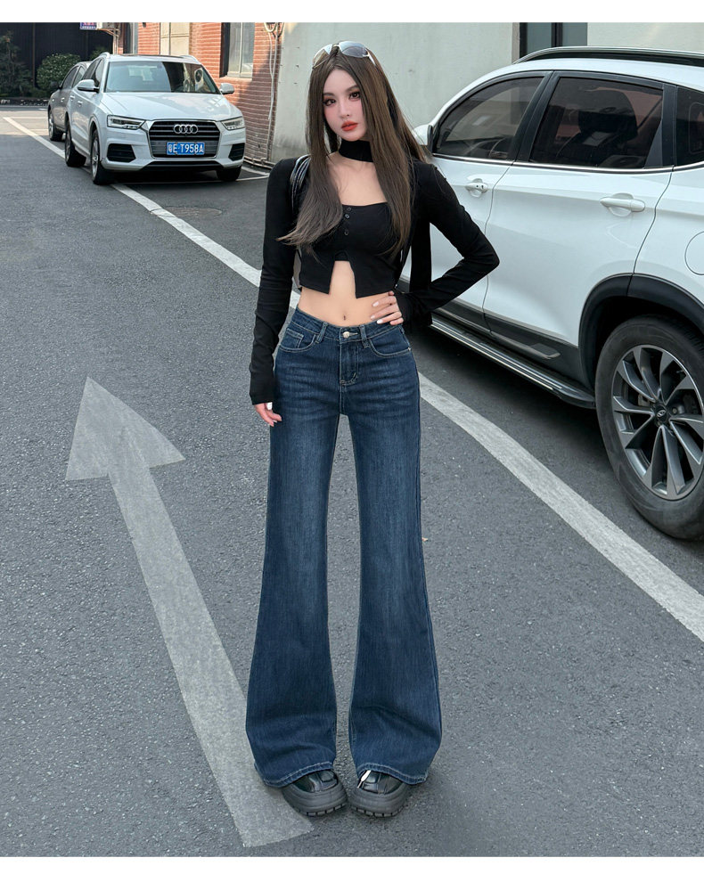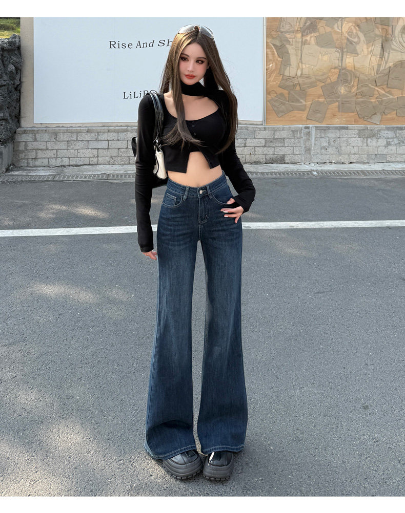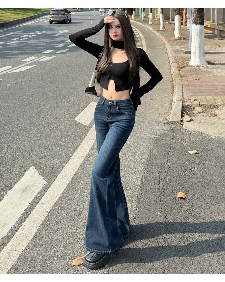 High-Waisted Stretchy Retro Blue Flared Jeans for Women, 2026 New Style, Non-Tight-Fitting, Slimming Black Floor-Length Bell-Bottom Pants