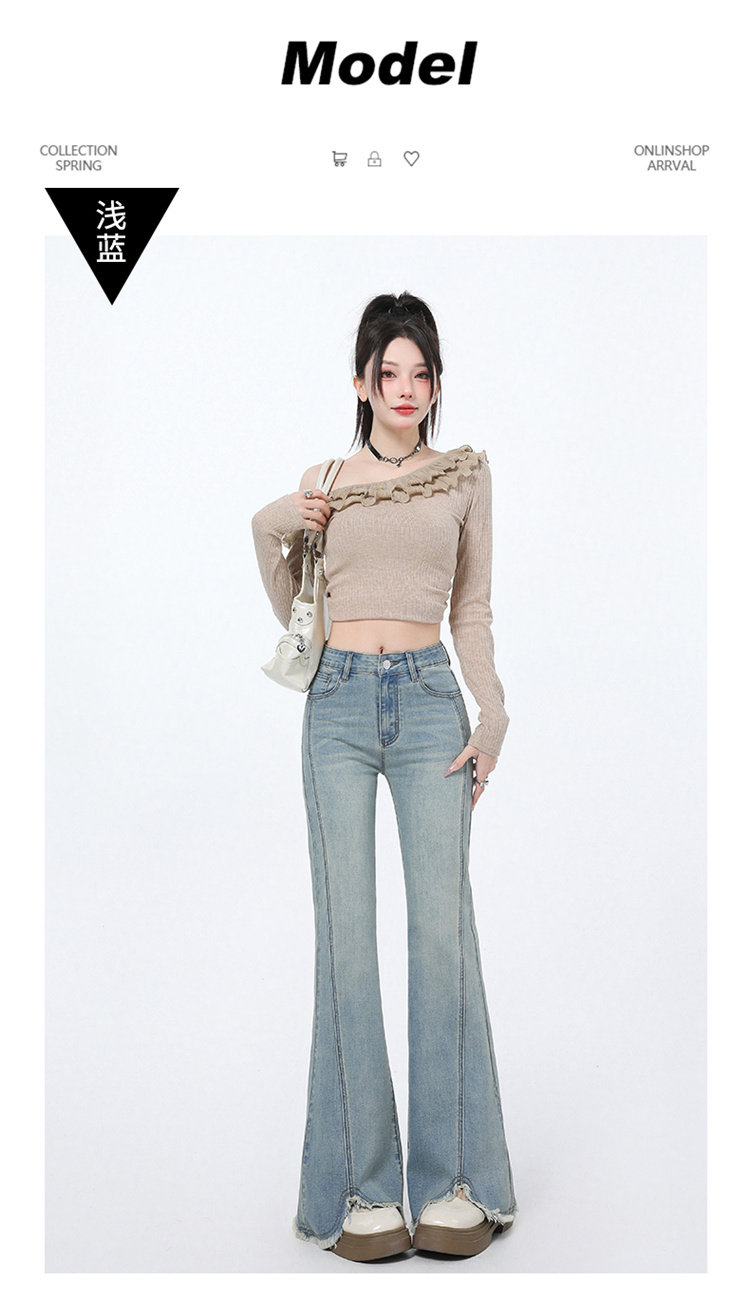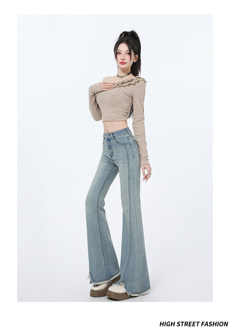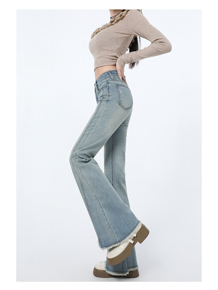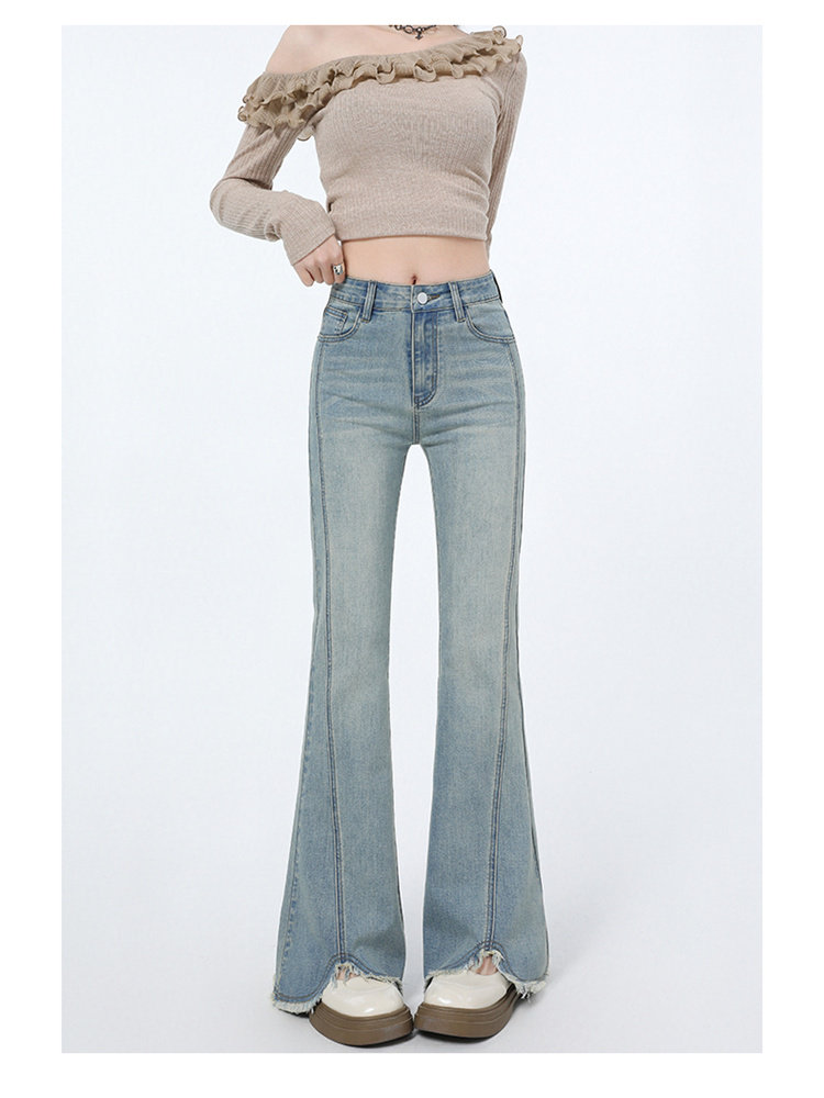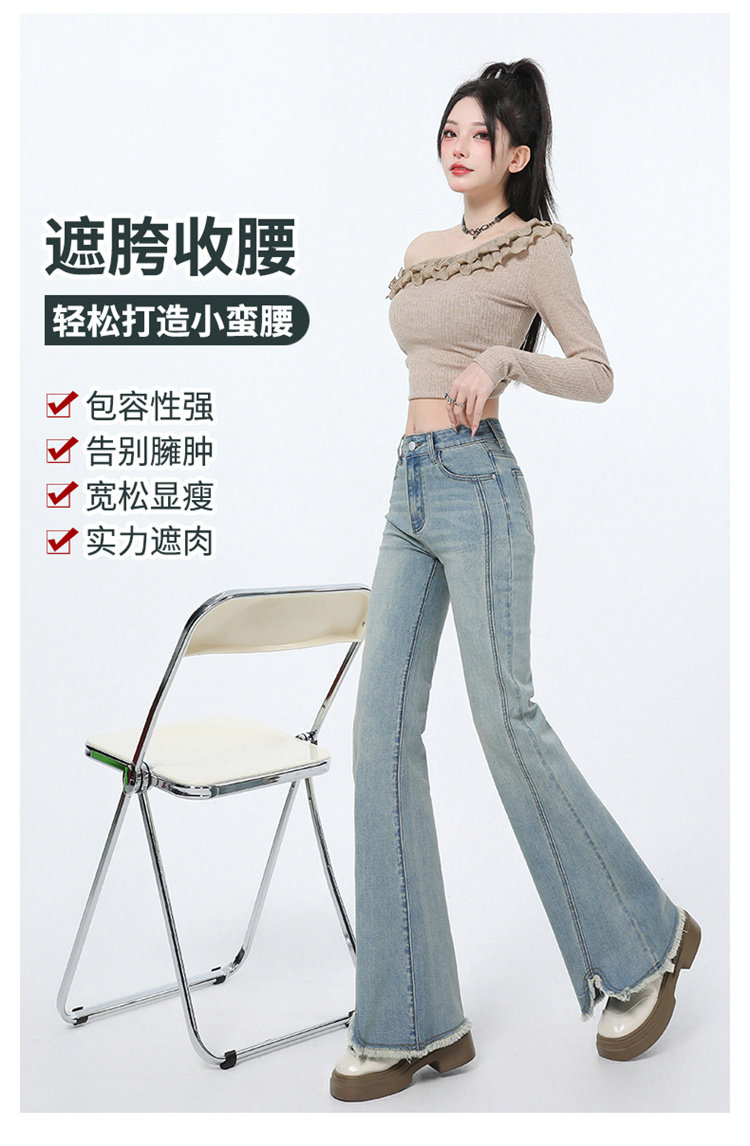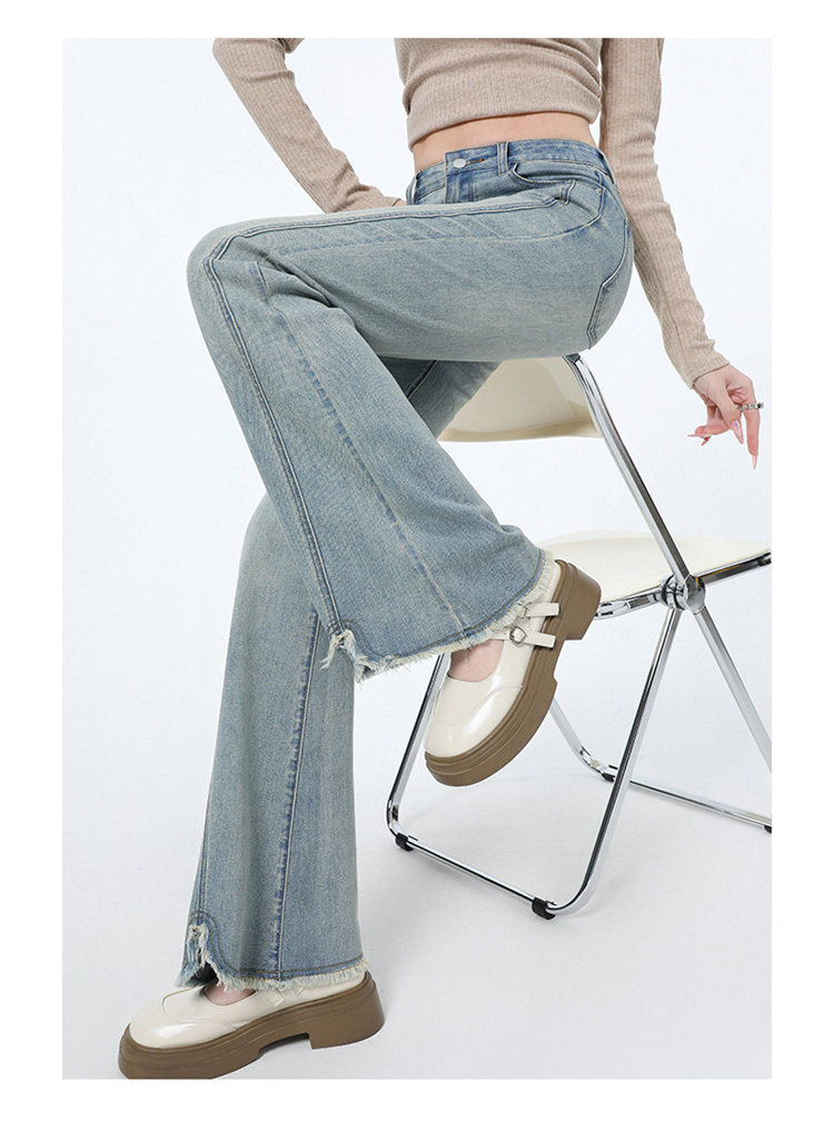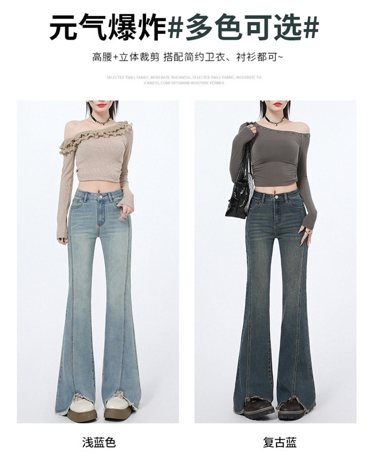2026 New Style American-Style Light Blue Flared Jeans for Women, High-Waisted, Slim-Fit, Frayed Hem, Split Hem Bootcut Pants
