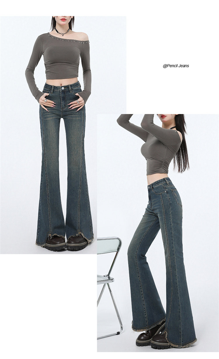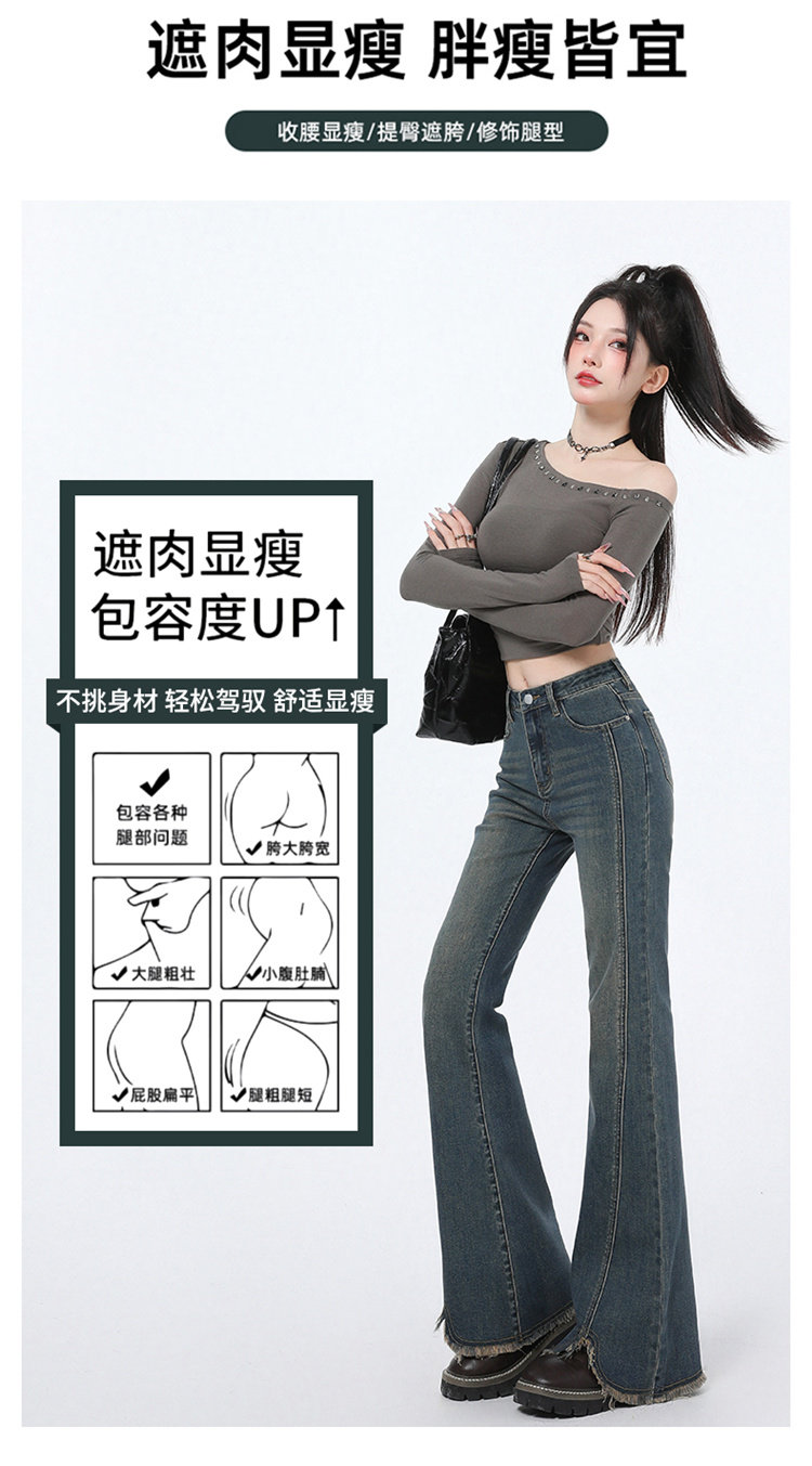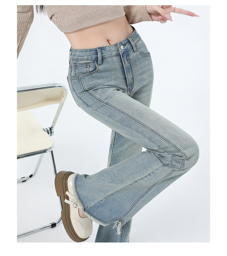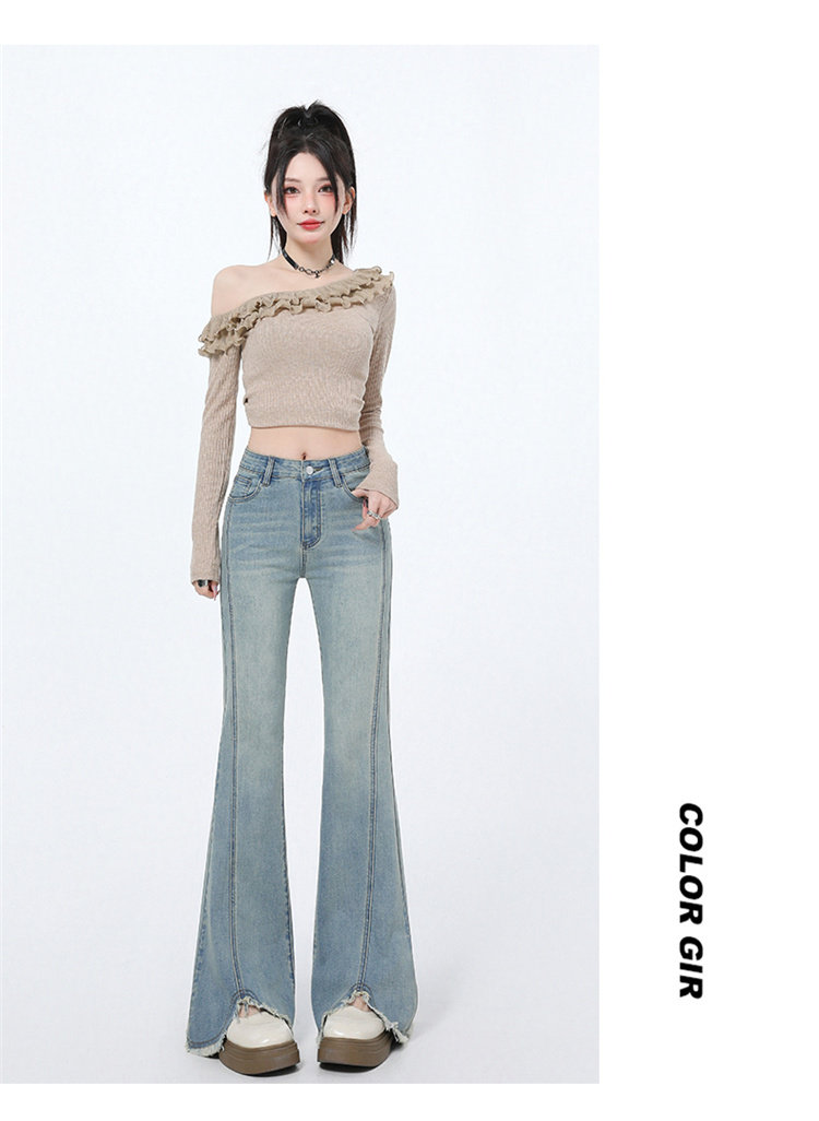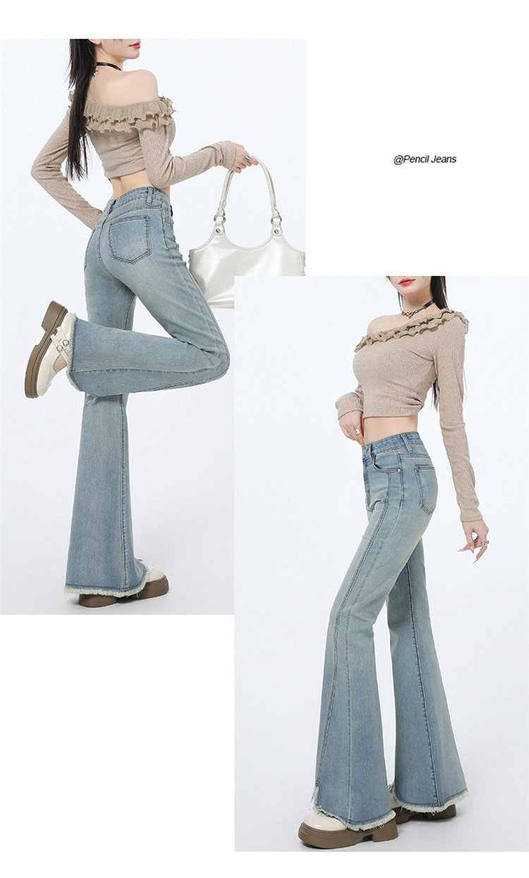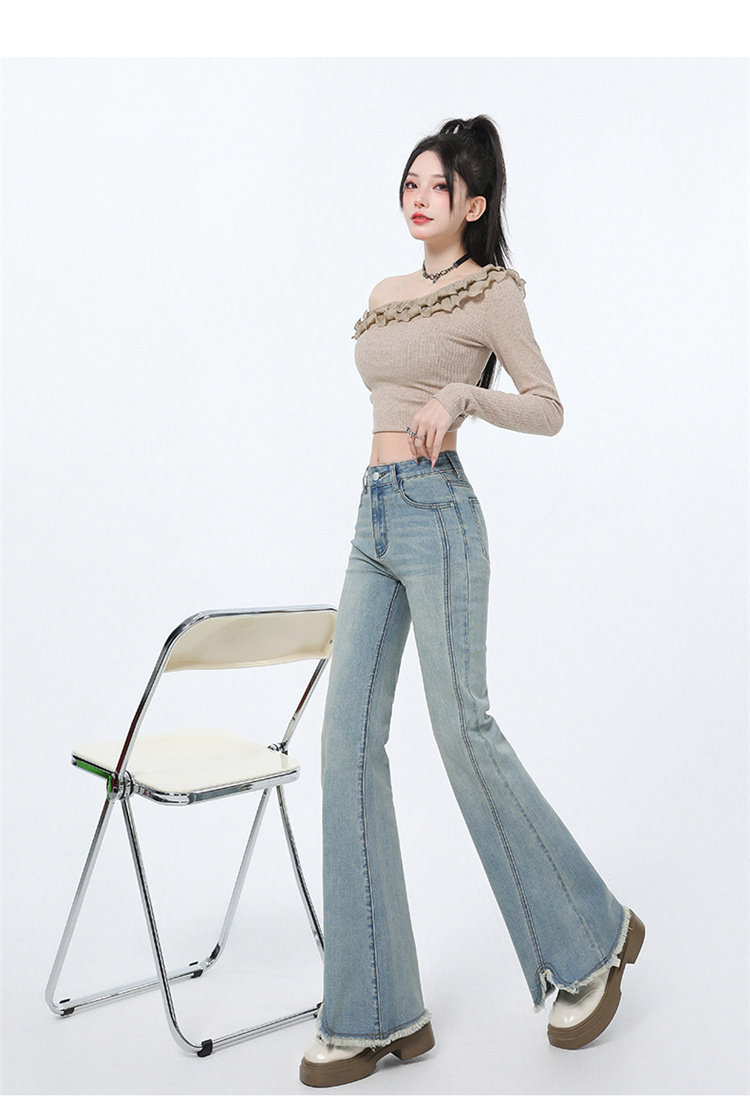 2026 New Style American-Style Light Blue Flared Jeans for Women, High-Waisted, Slim-Fit, Frayed Hem, Split Hem Bootcut Pants