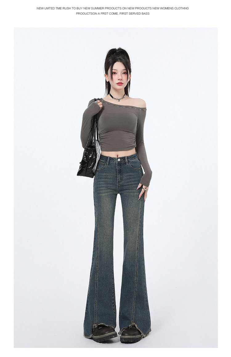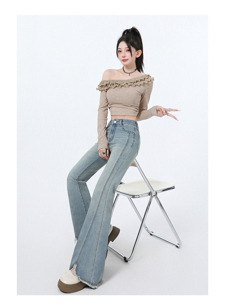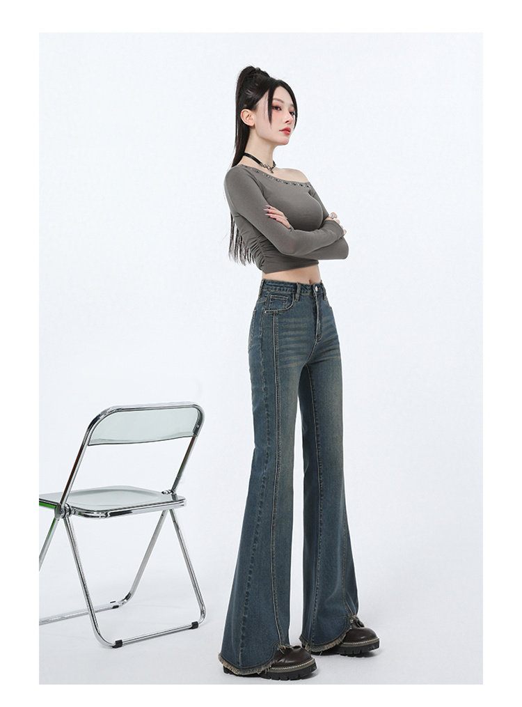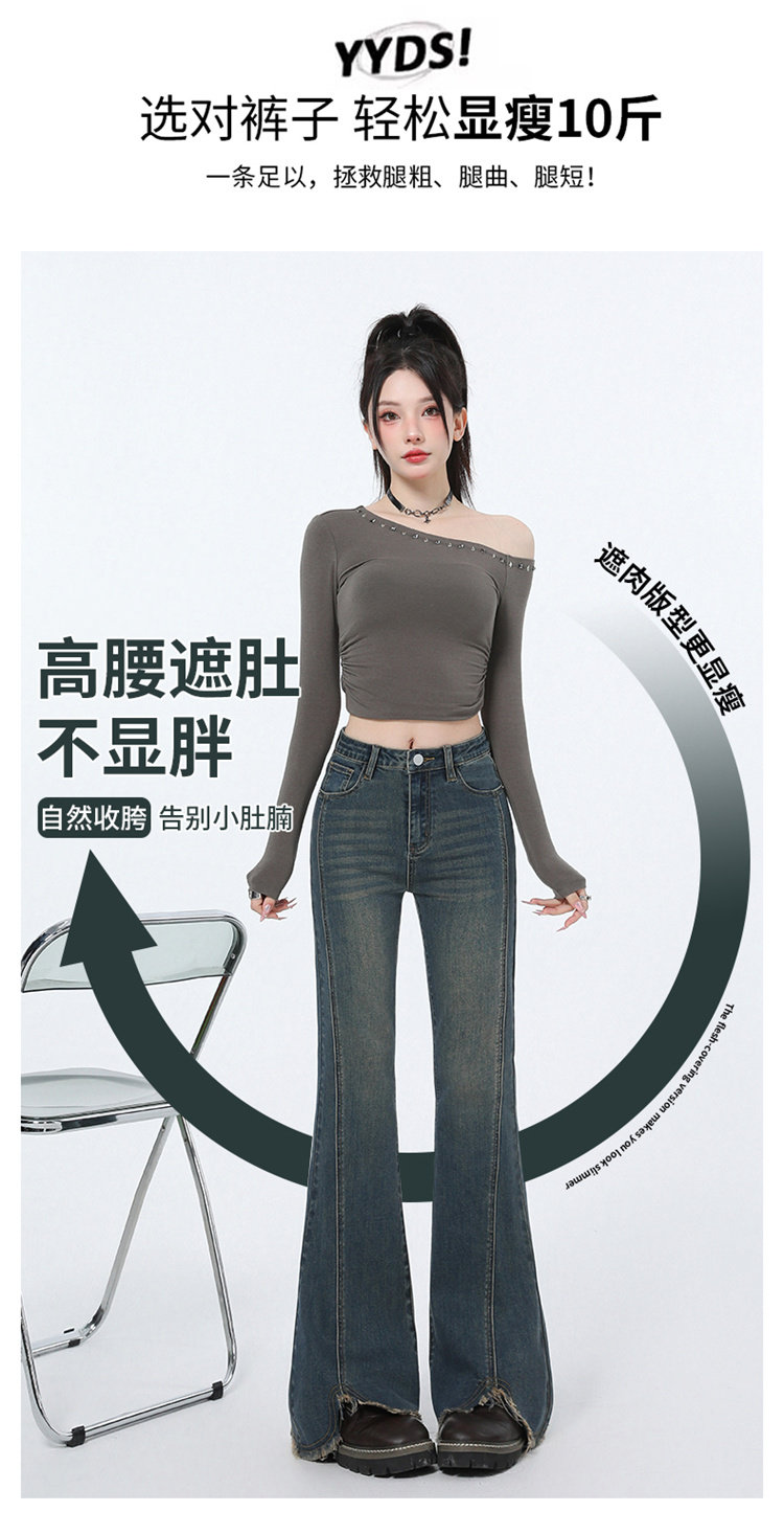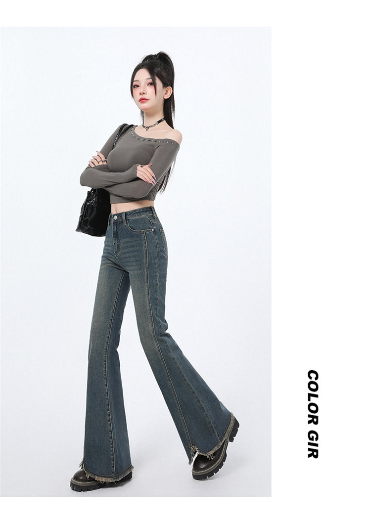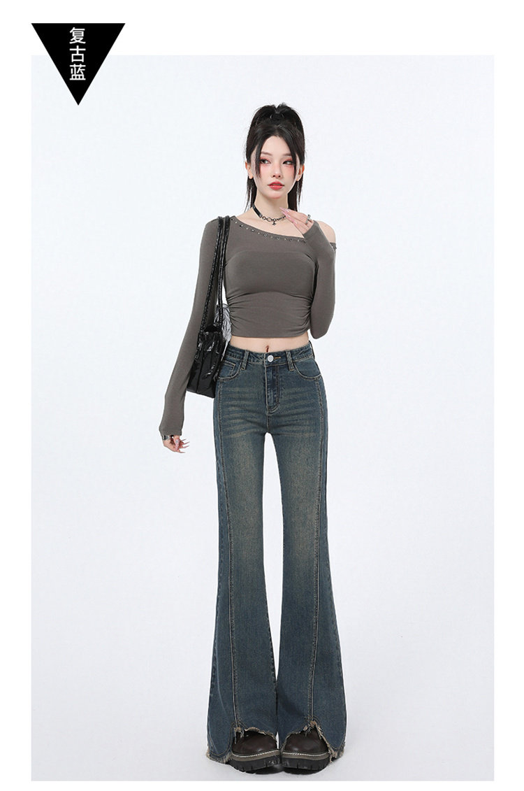 2026 New Style American-Style Light Blue Flared Jeans for Women, High-Waisted, Slim-Fit, Frayed Hem, Split Hem Bootcut Pants