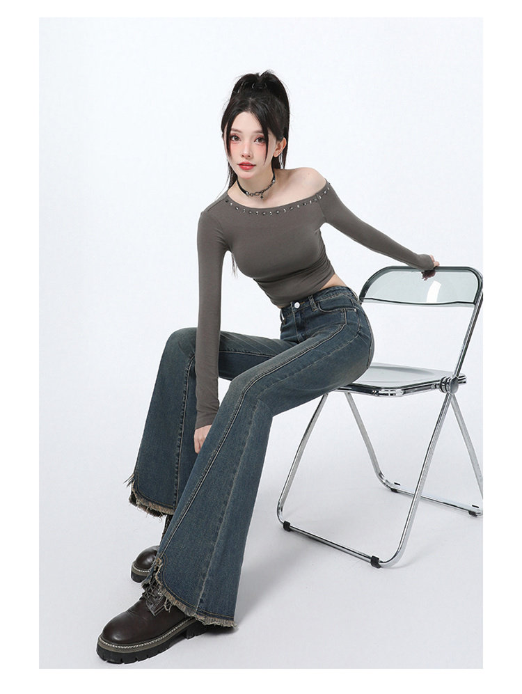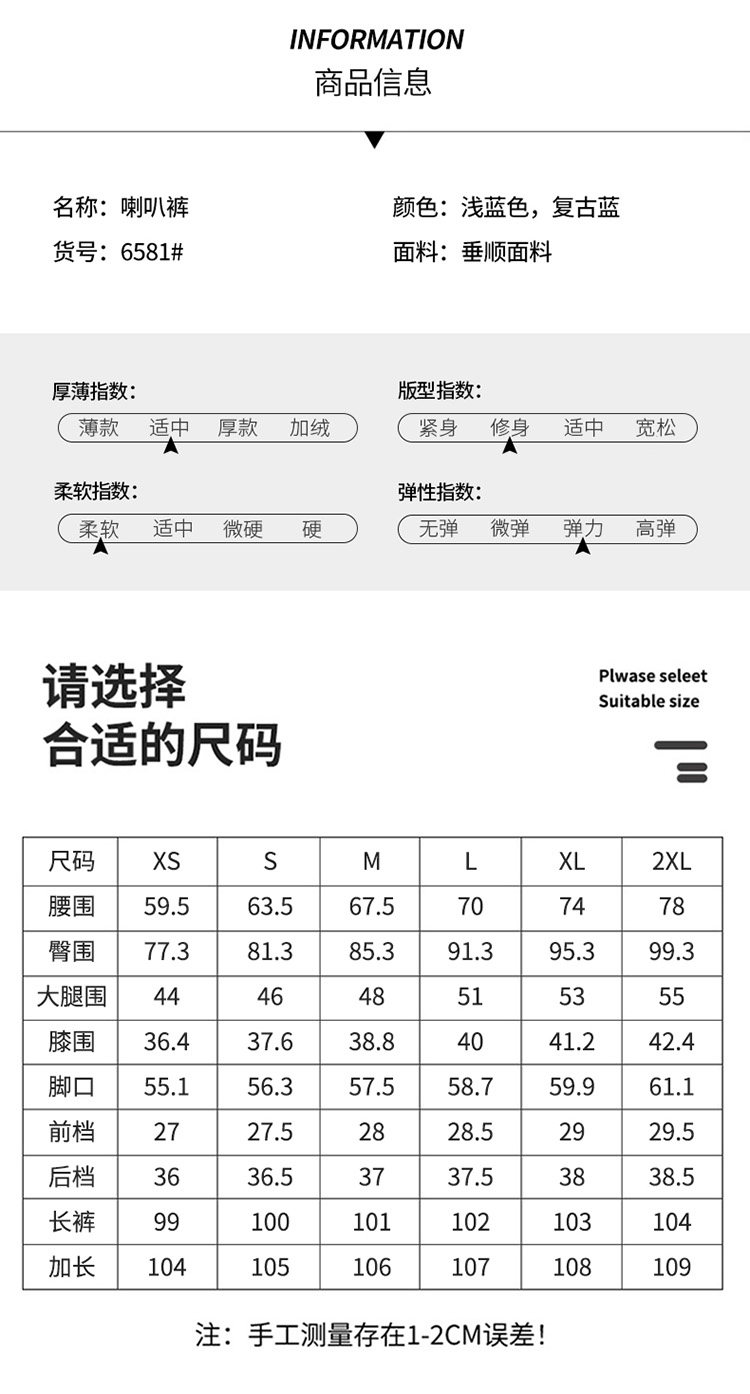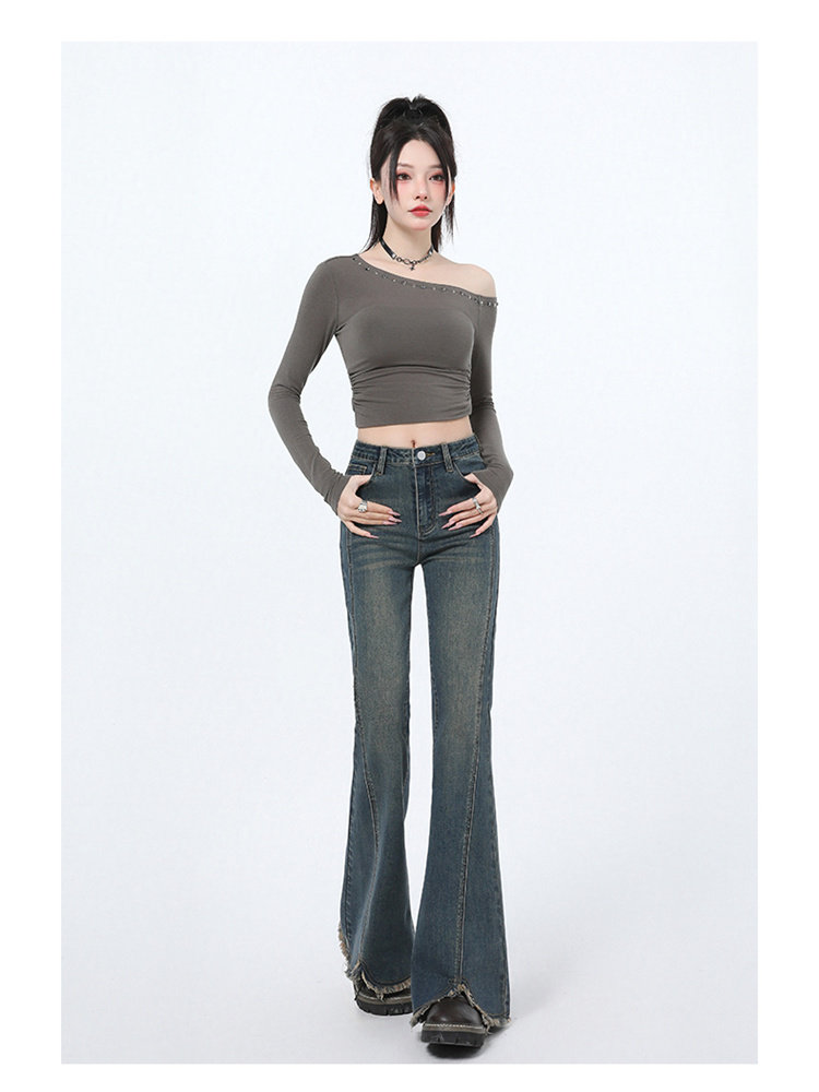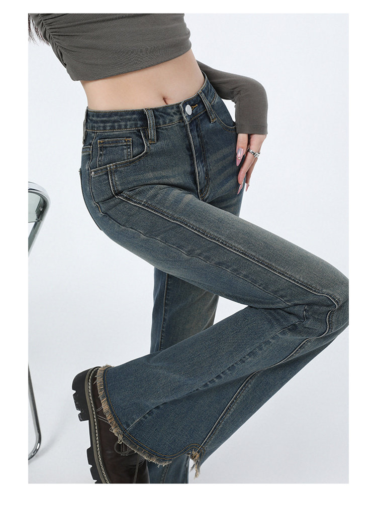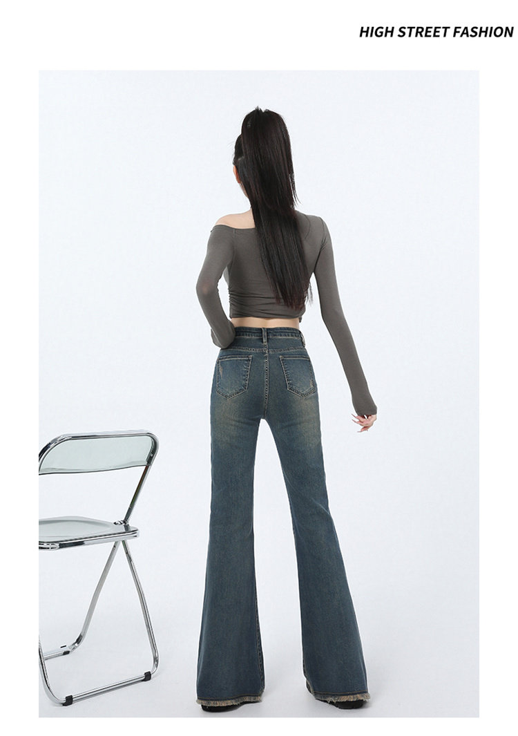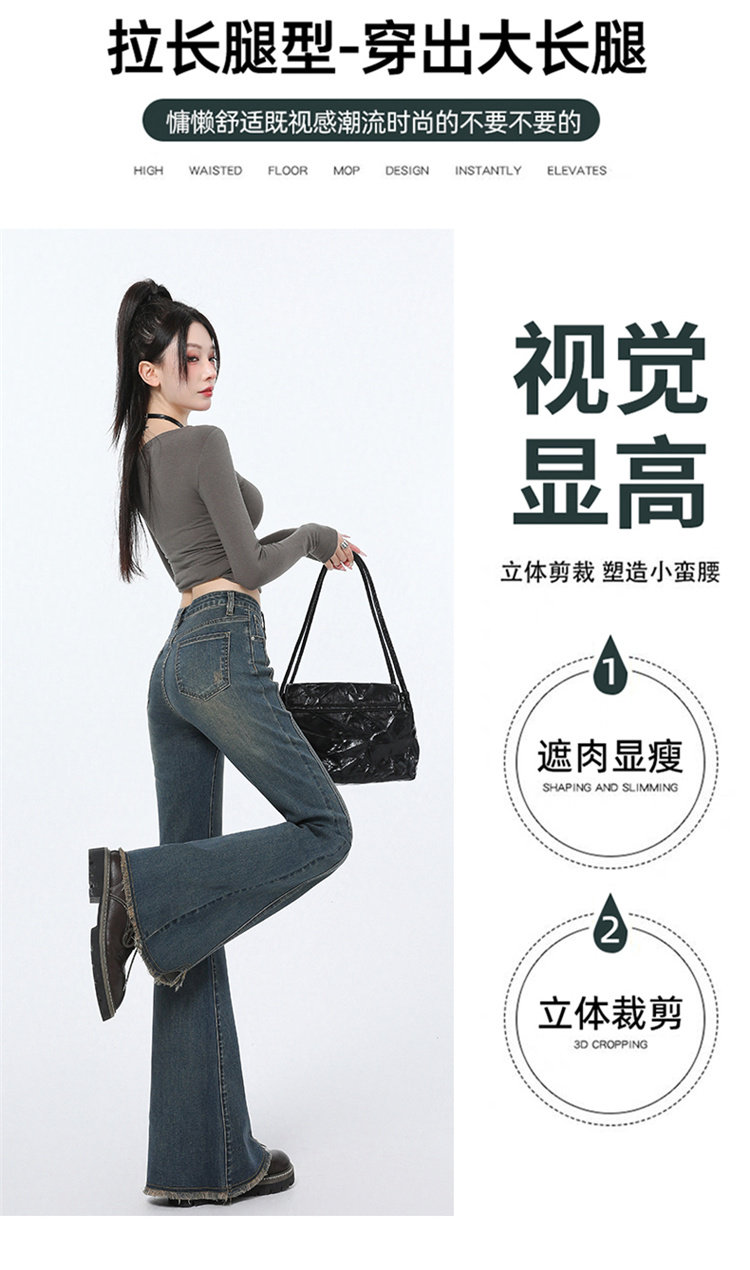 2026 New Style American-Style Light Blue Flared Jeans for Women, High-Waisted, Slim-Fit, Frayed Hem, Split Hem Bootcut Pants