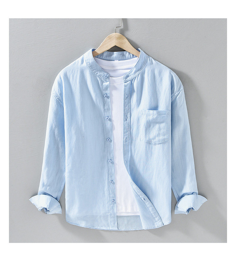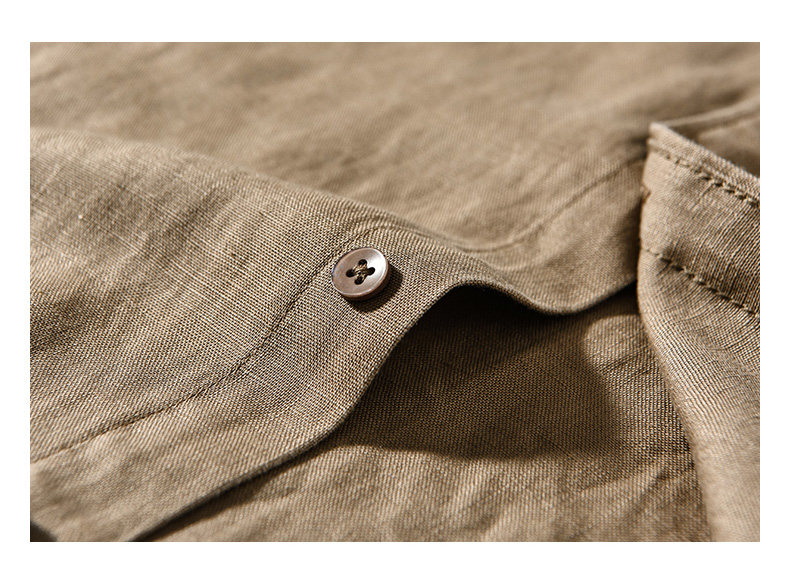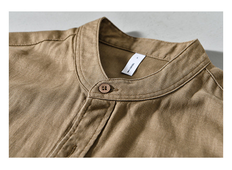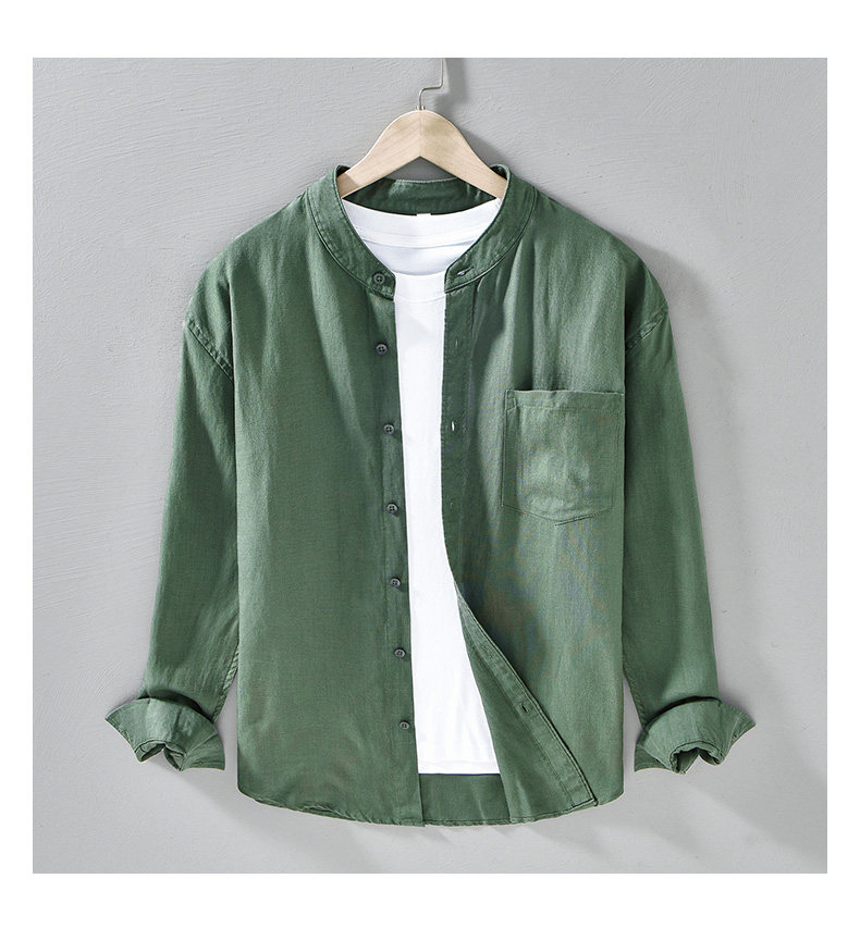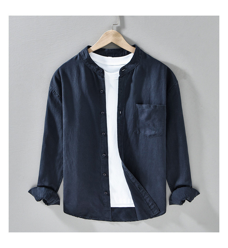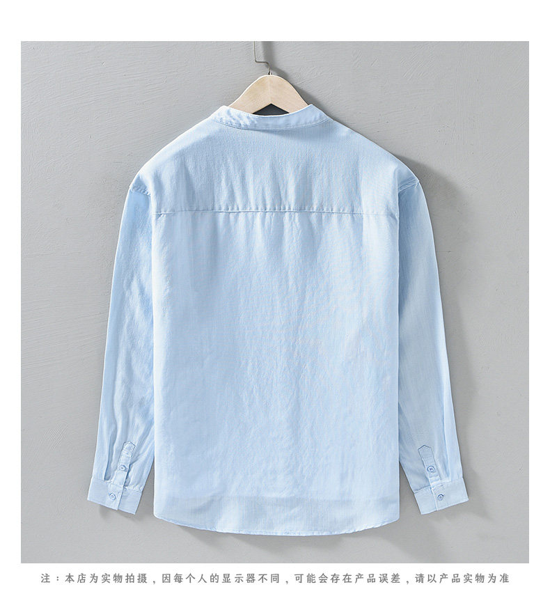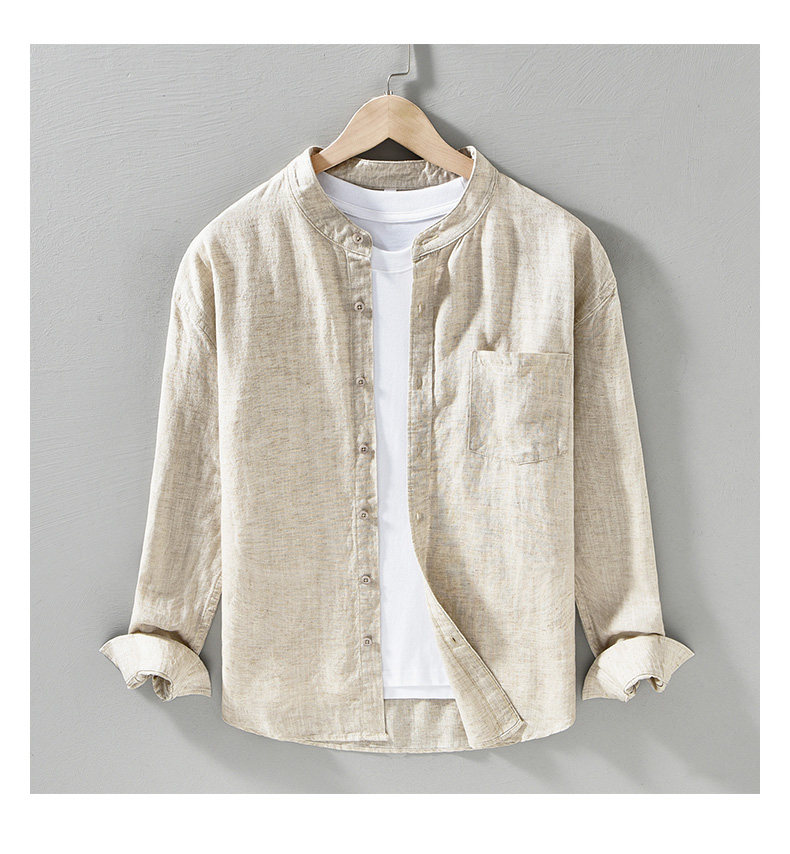 Elegant Gentleman Tencel Linen New Chinese Style Stand Collar Shirt for Men, Long Sleeve, Old Money Retro Original Linen Color with Pocket Design