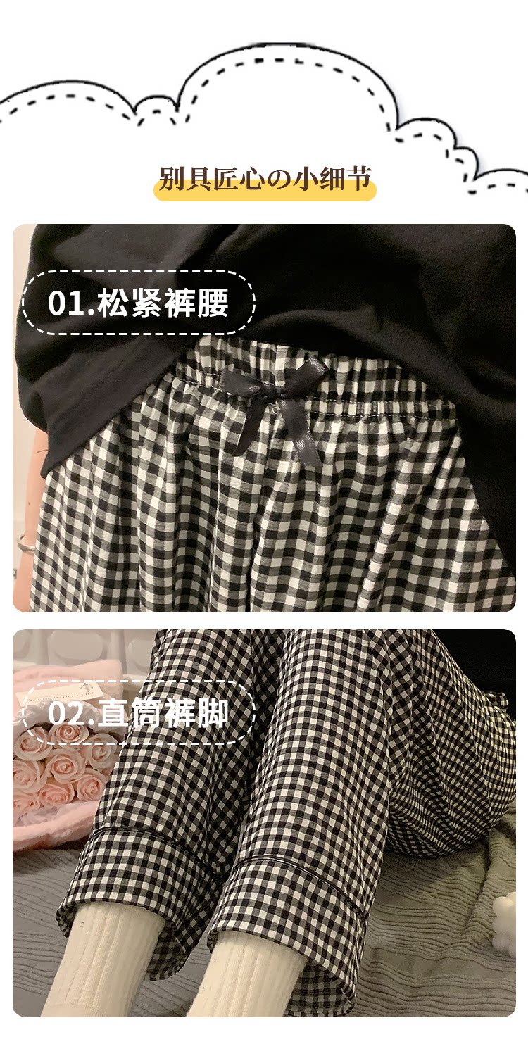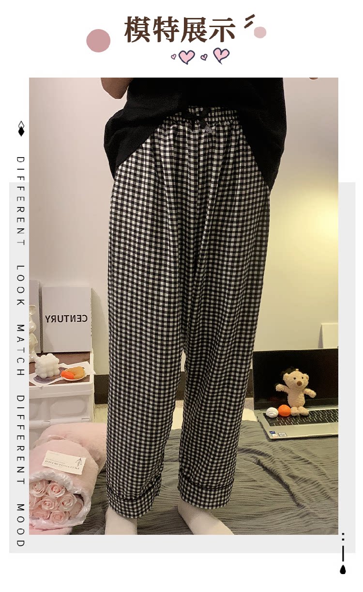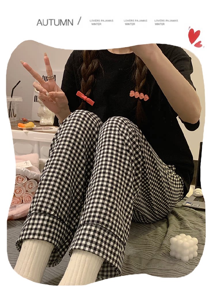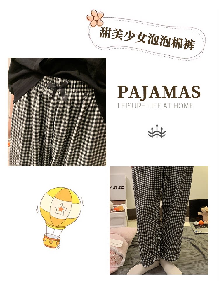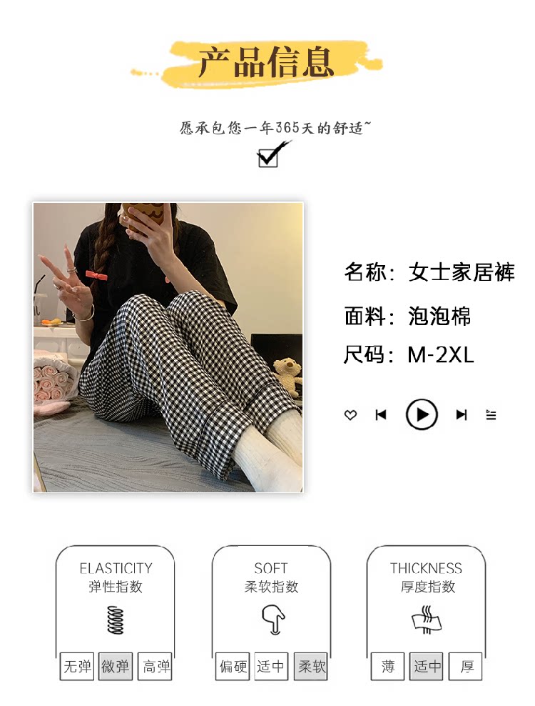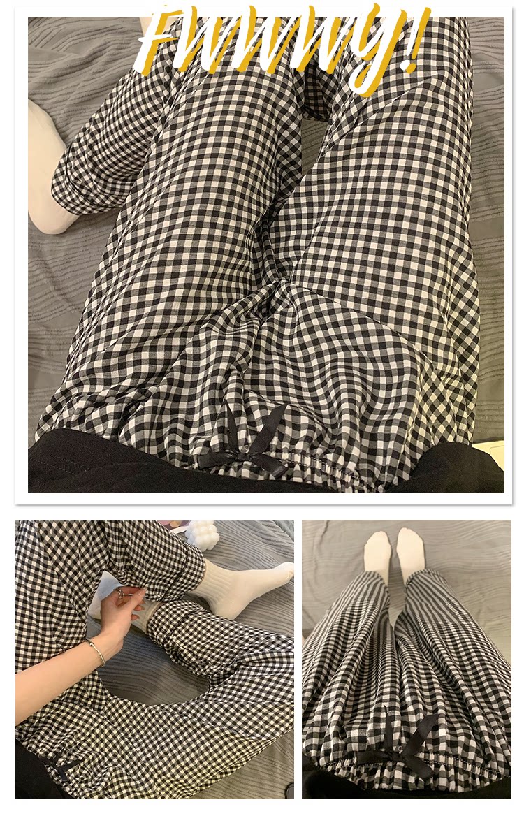 Bubble Cotton Plaid Pajama Pants for Women, Summer Thin Long Pants, Casual Home Straight-Leg Pants for Spring and Autumn, Suitable for Outdoor Wear and Walking