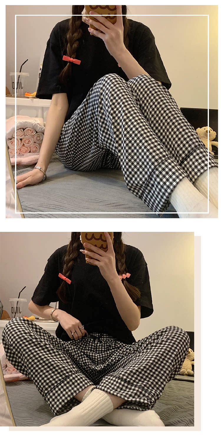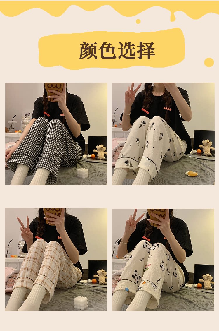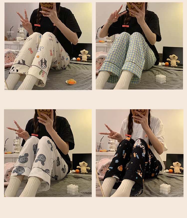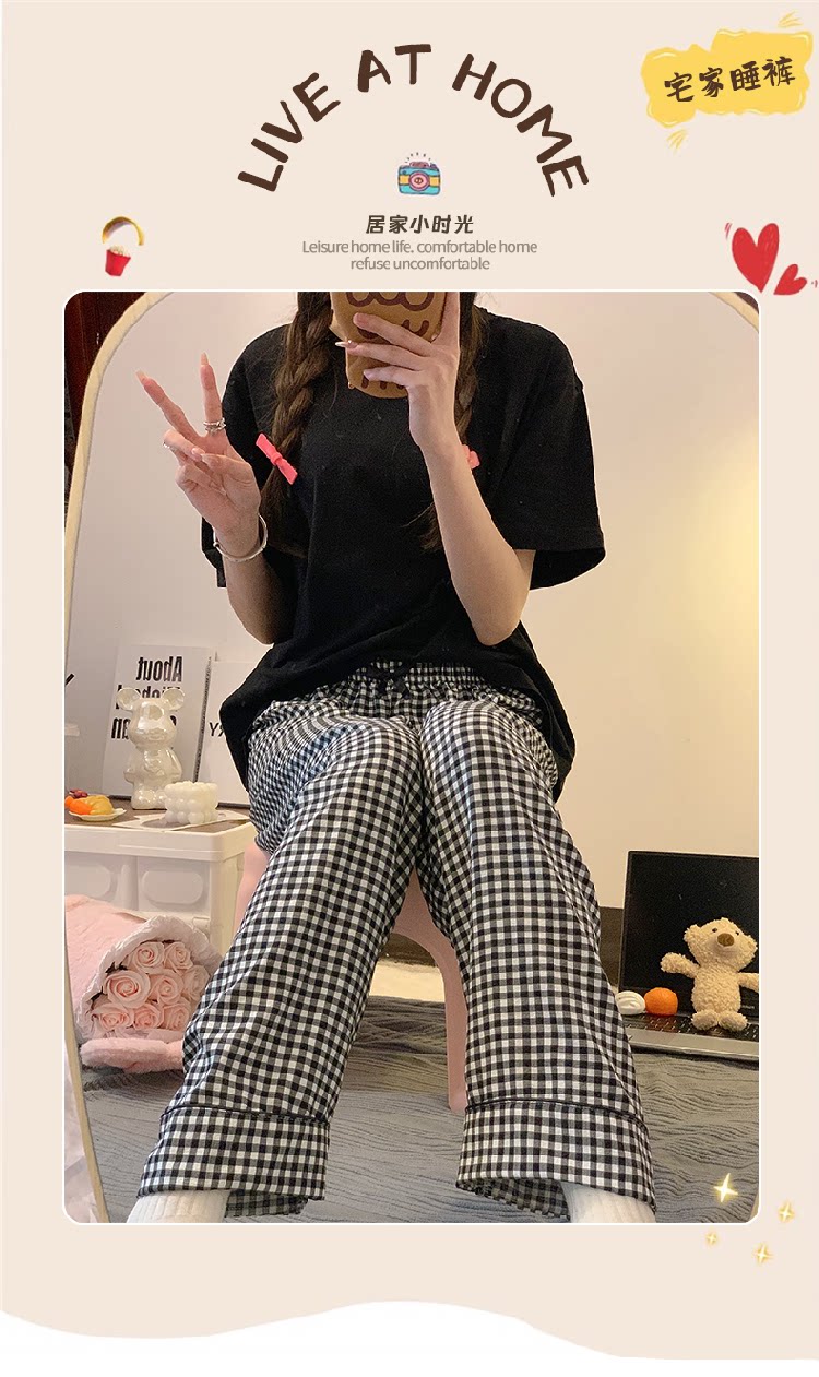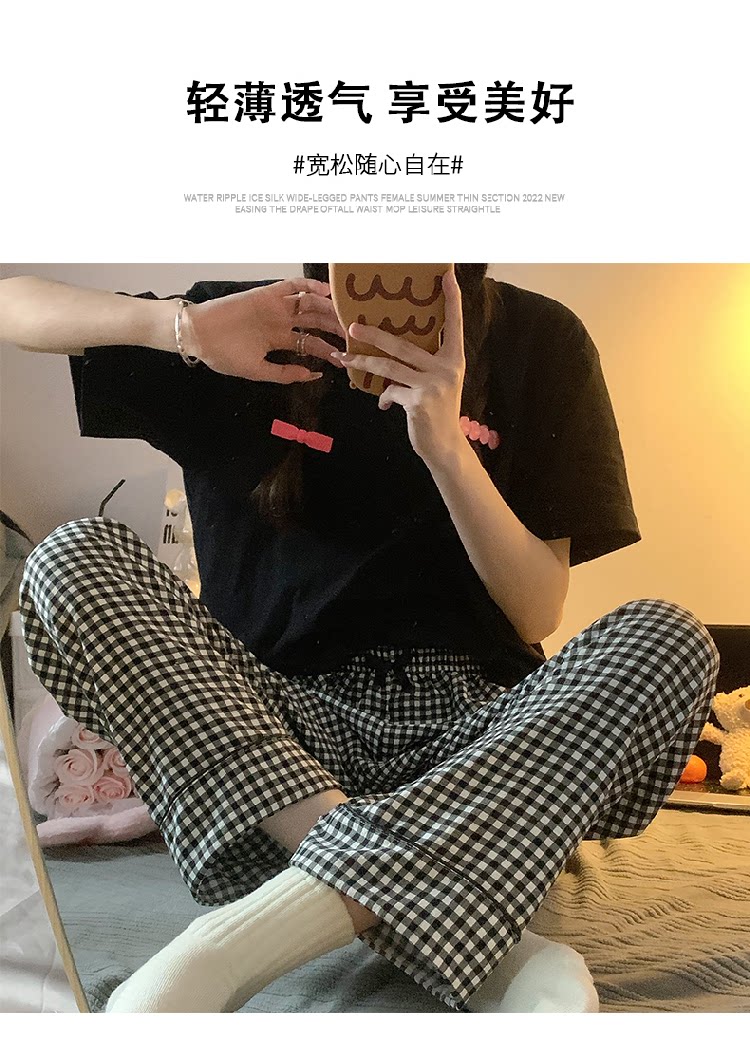 Bubble Cotton Plaid Pajama Pants for Women, Summer Thin Long Pants, Casual Home Straight-Leg Pants for Spring and Autumn, Suitable for Outdoor Wear and Walking