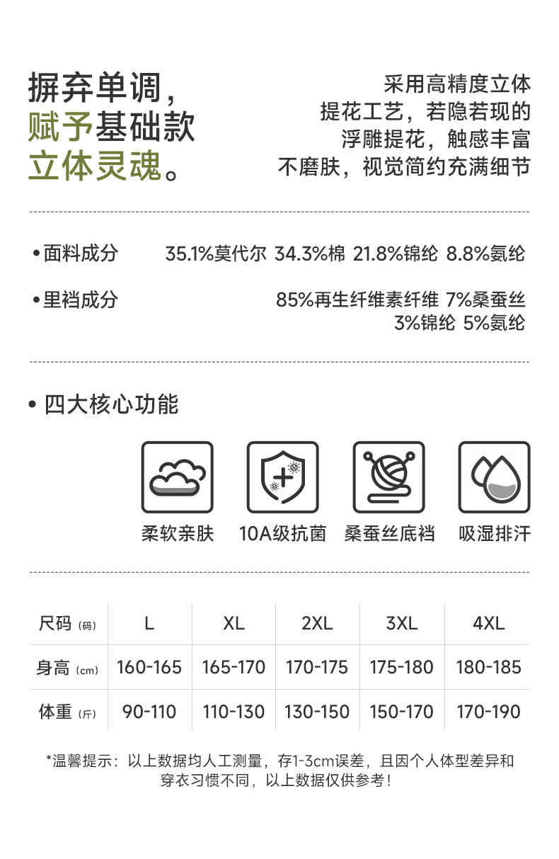 Material Composition 35.1% Modal, 34.3% Cotton, 21.8% Nylon, 8.8% Spandex