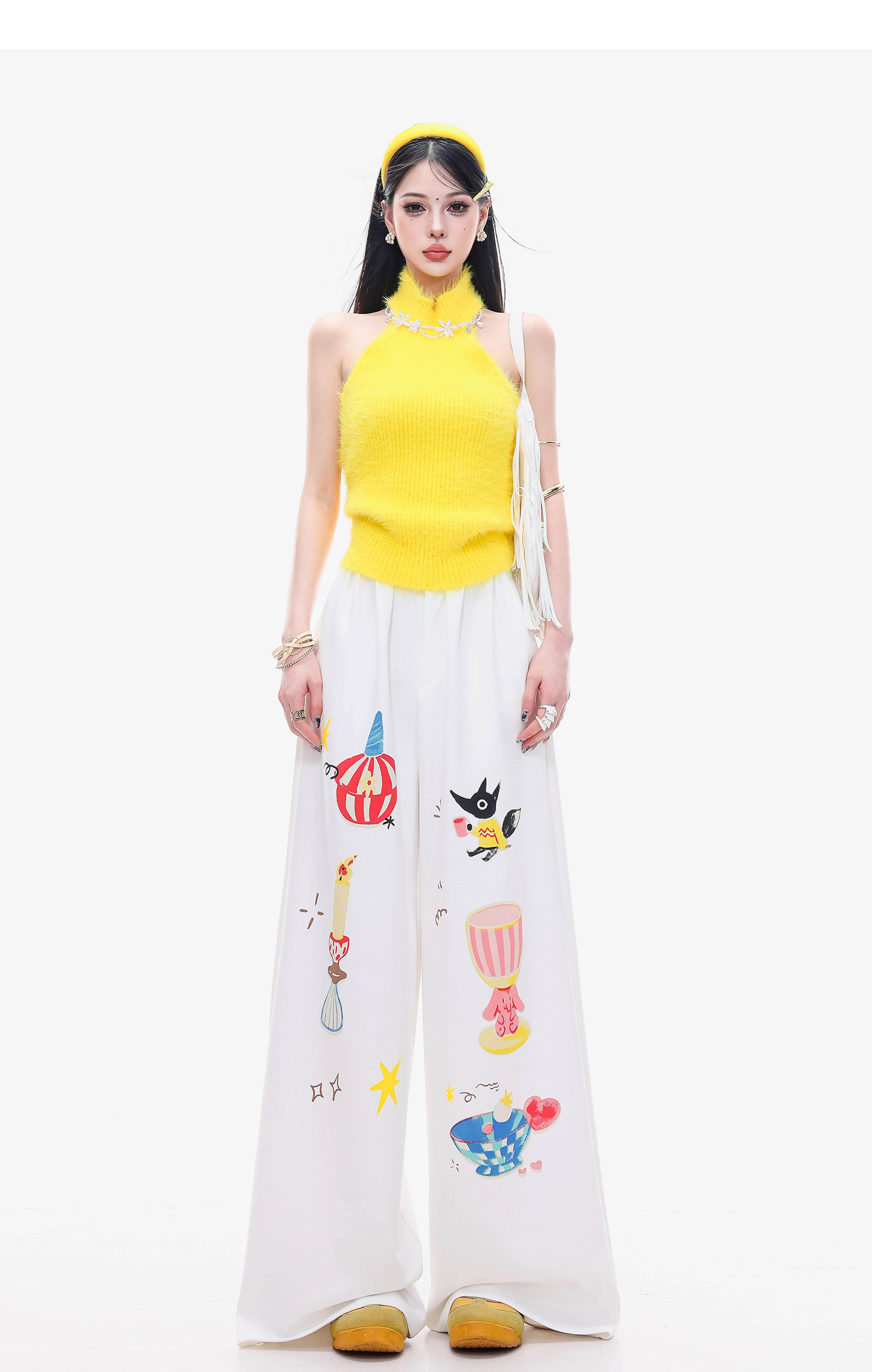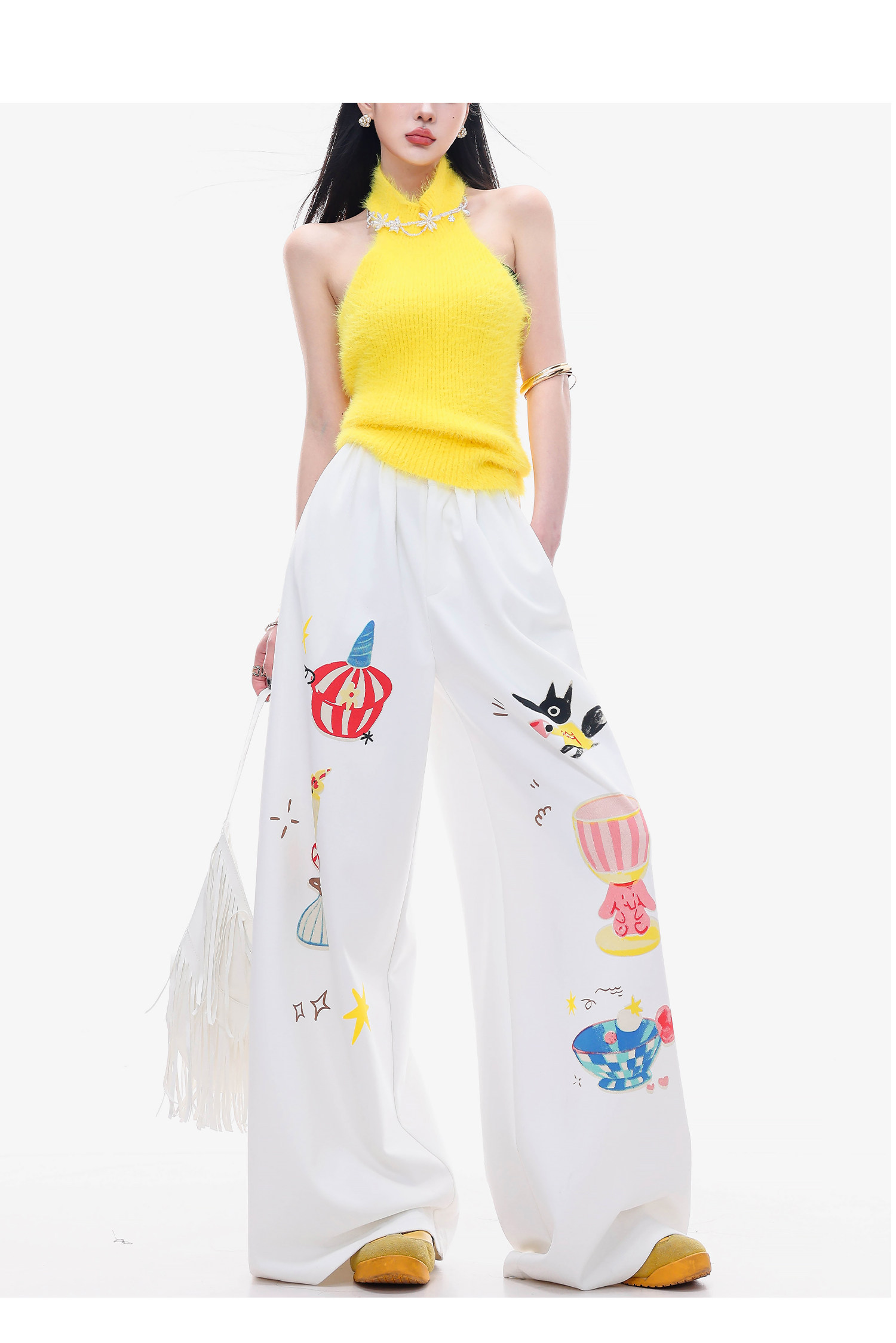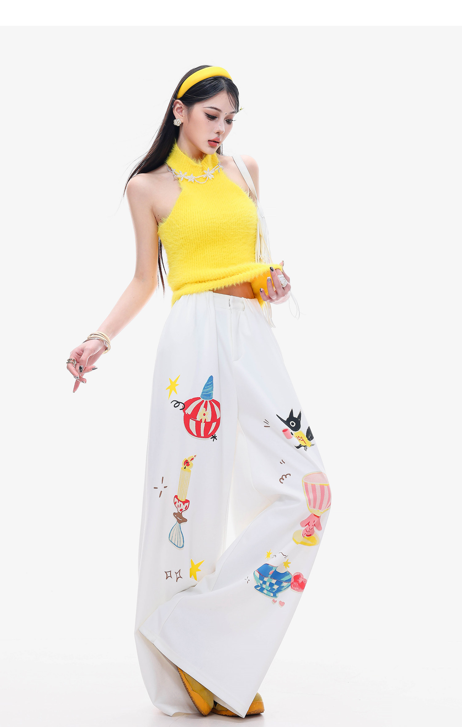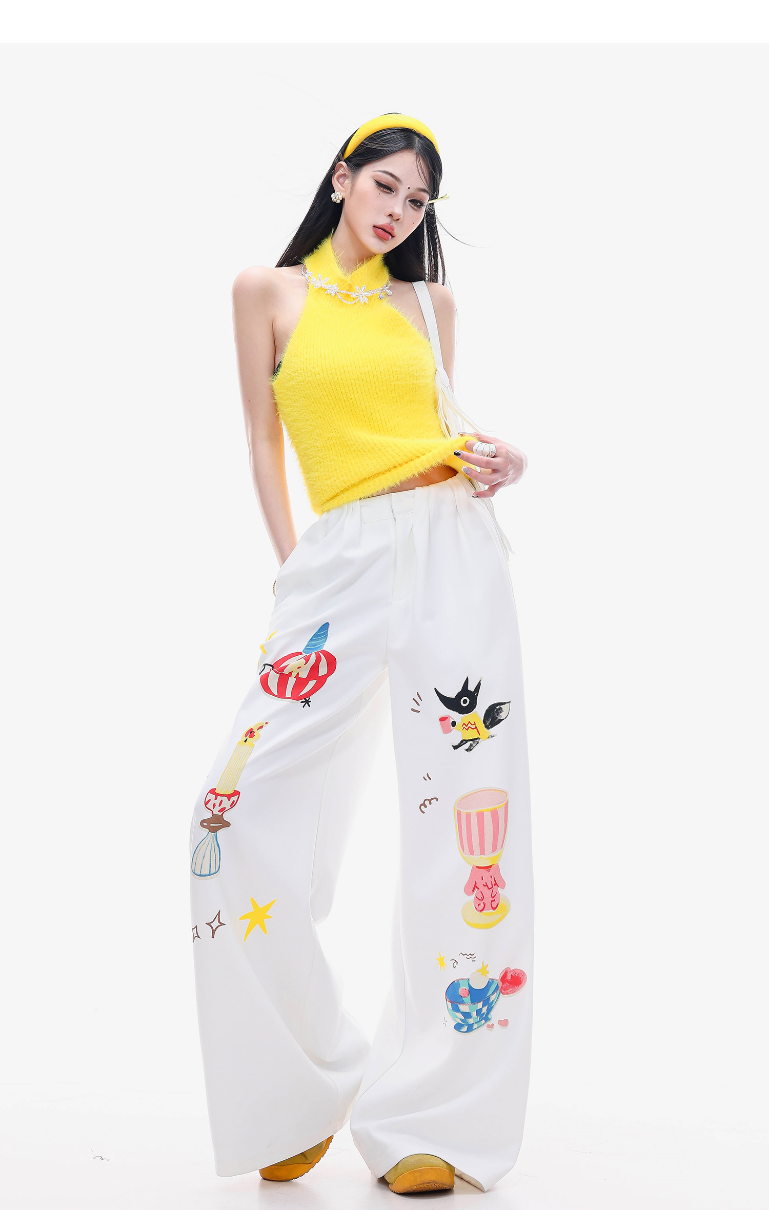 Abwlr Fairy Tale Town-Original Cartoon Printed Straight Wide-Leg Pants for Women Spring and Summer White Loose Slimming Look Casual Pants