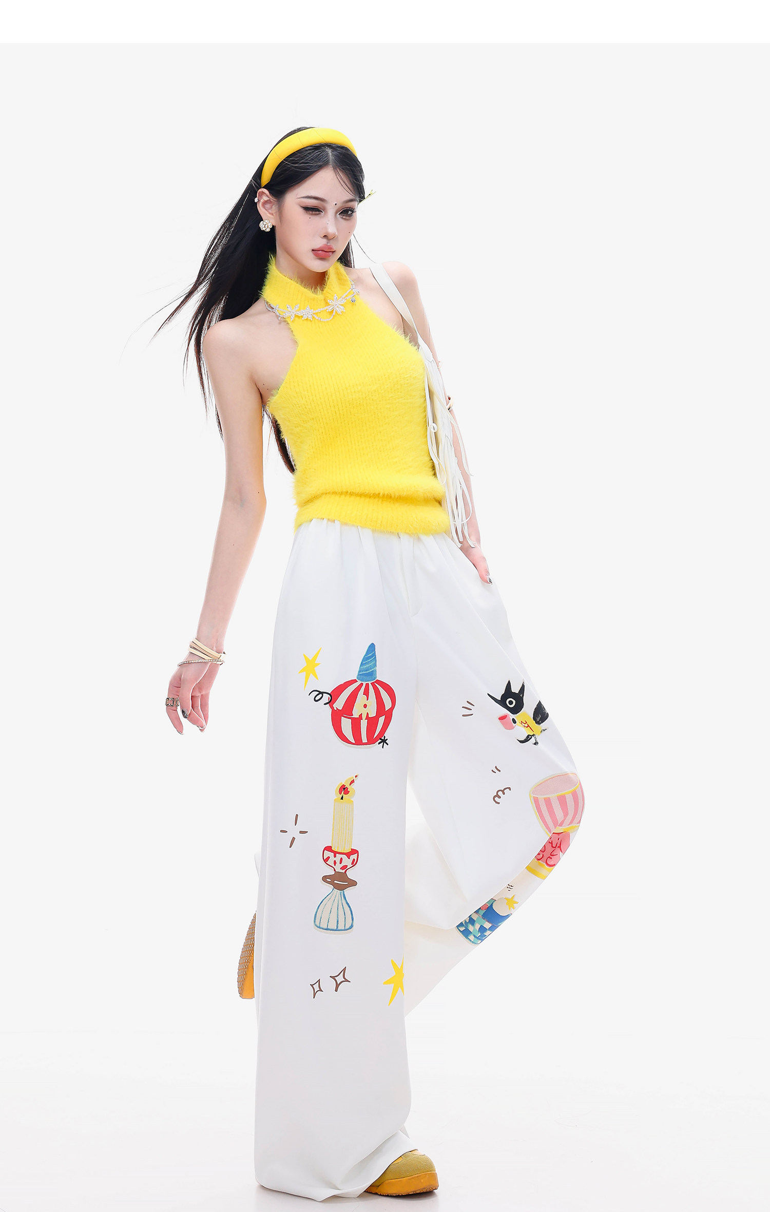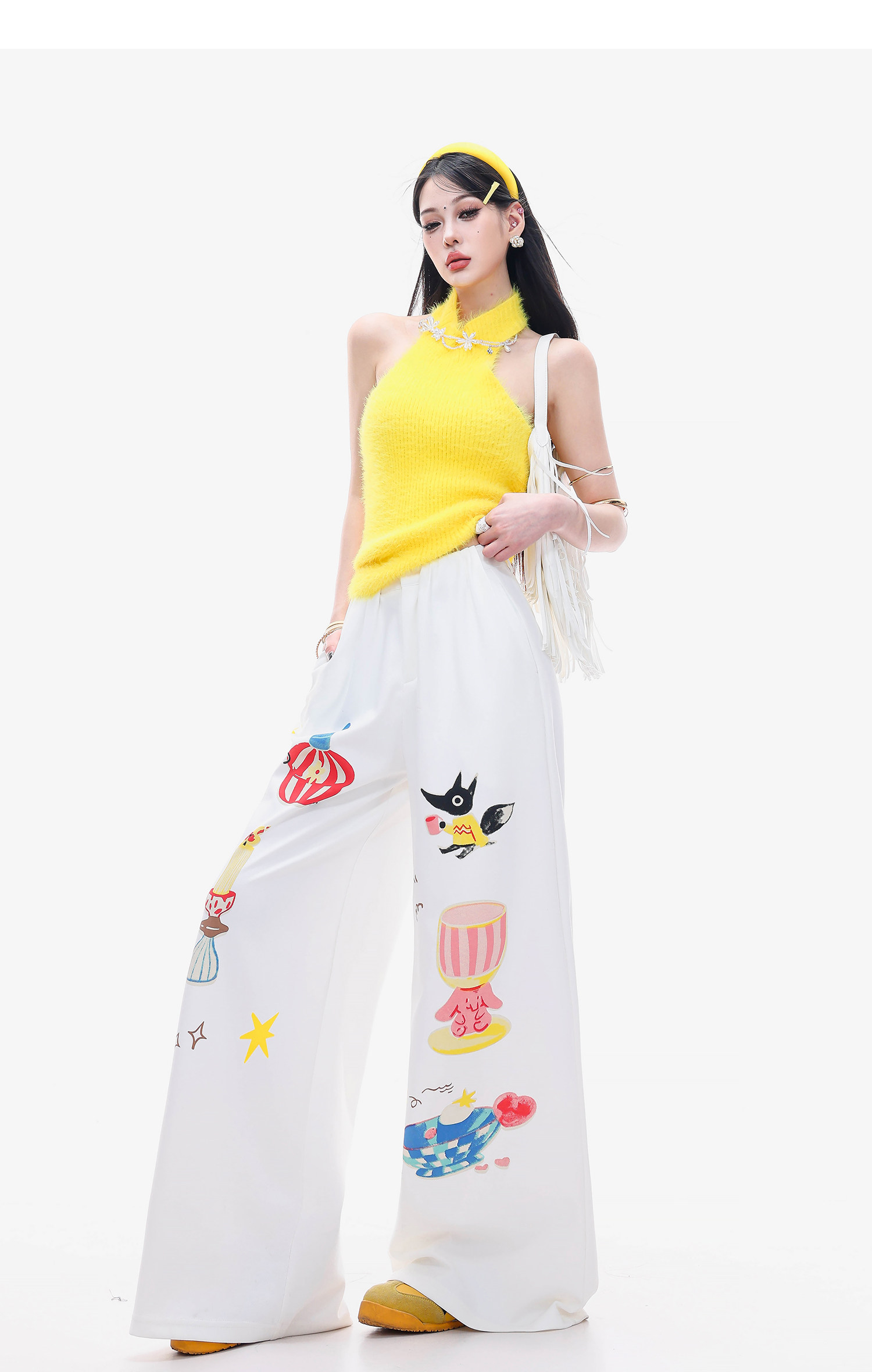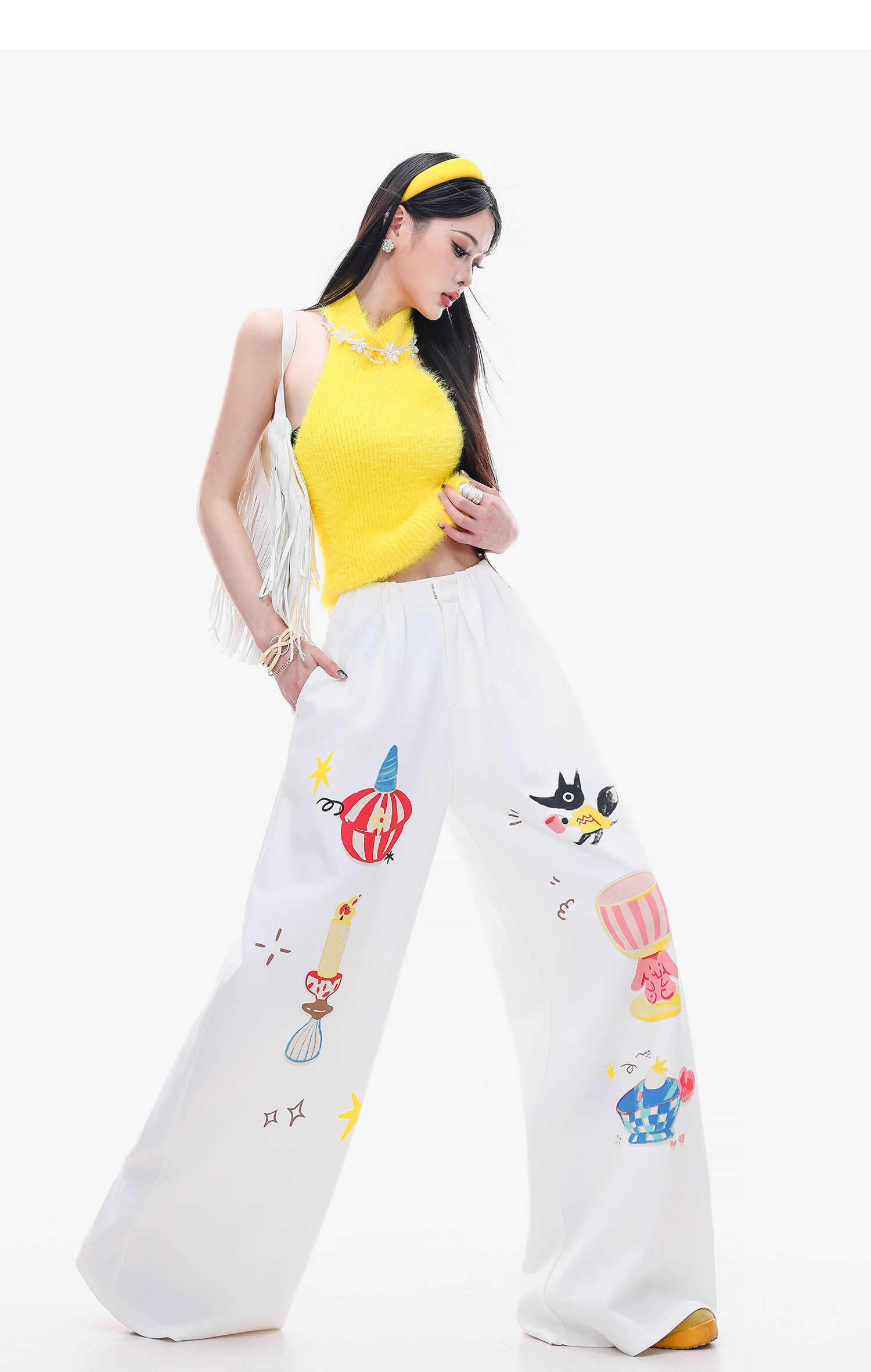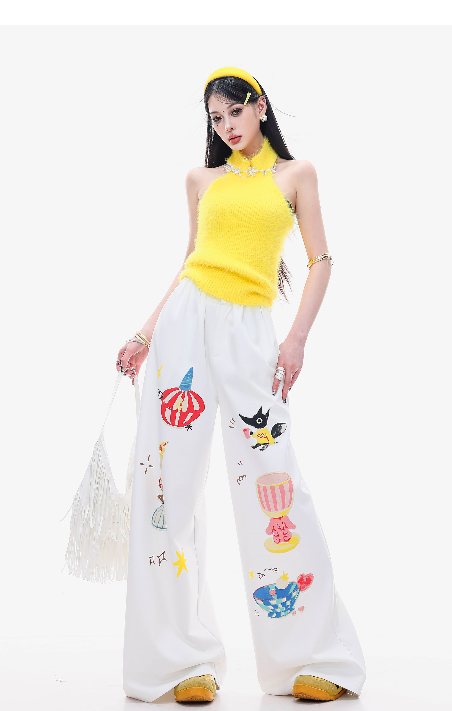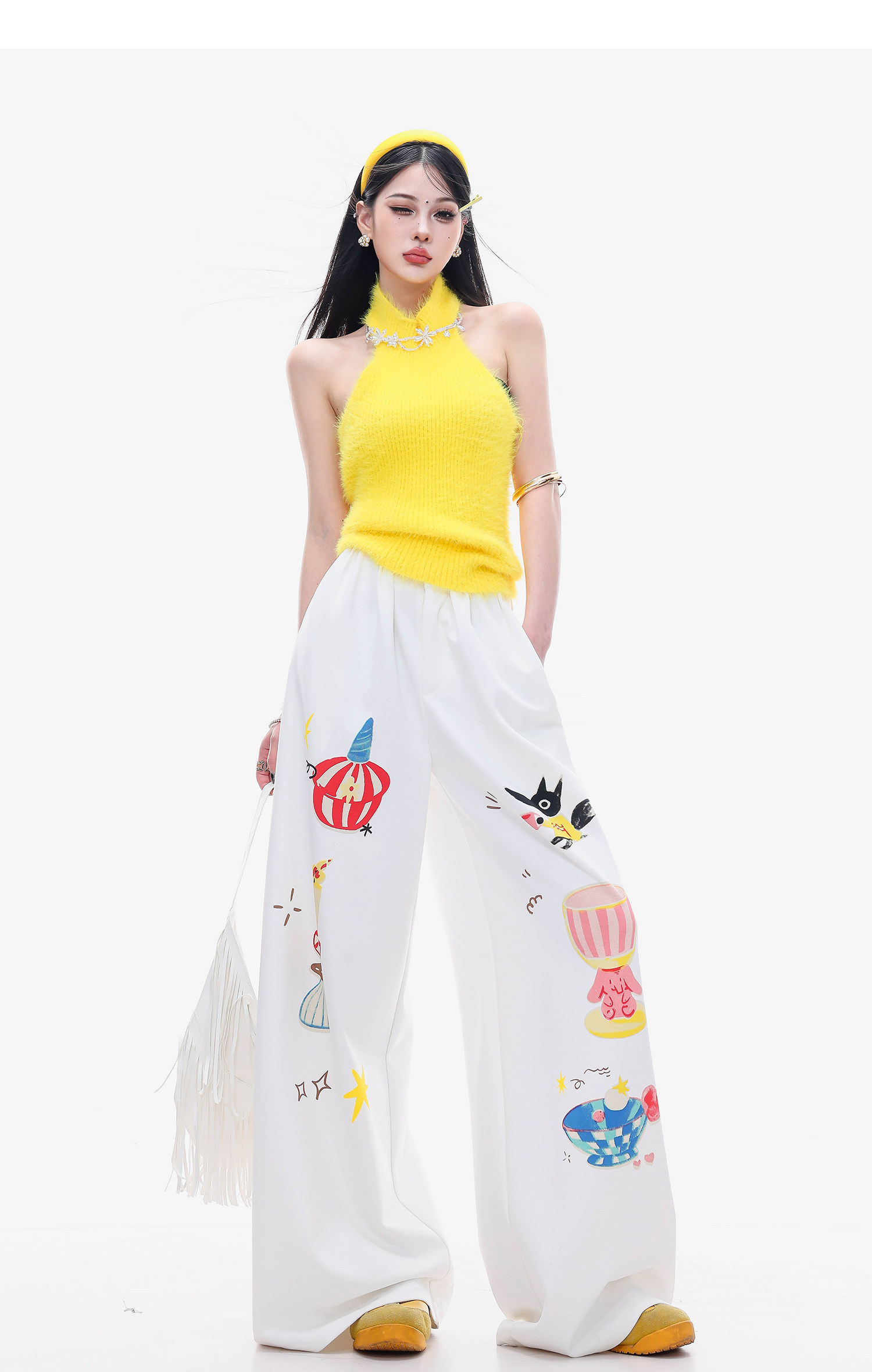 Abwlr Fairy Tale Town-Original Cartoon Printed Straight Wide-Leg Pants for Women Spring and Summer White Loose Slimming Look Casual Pants