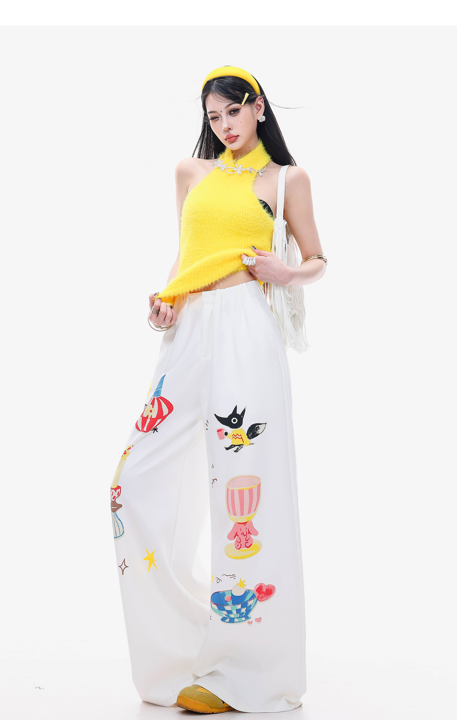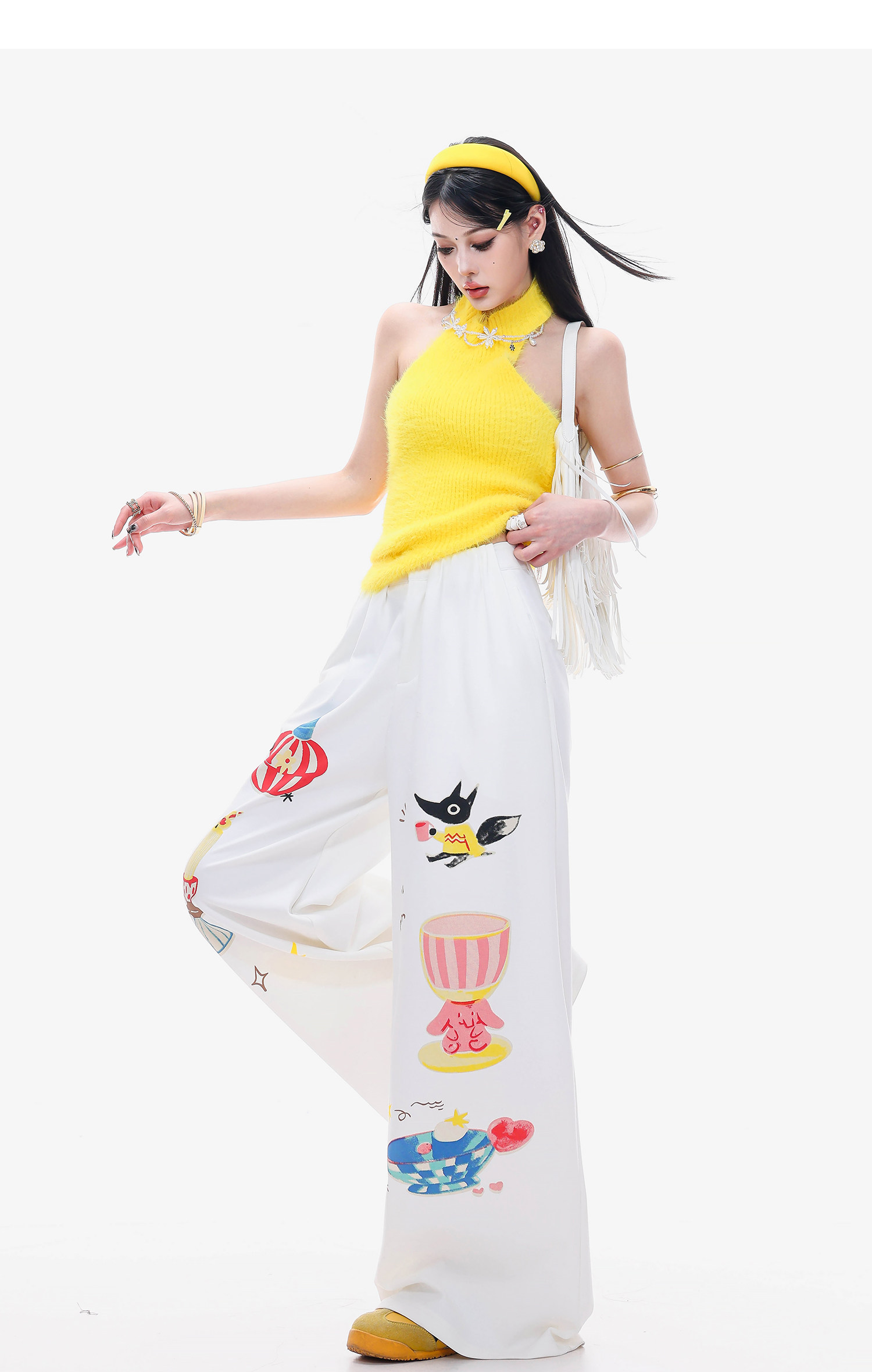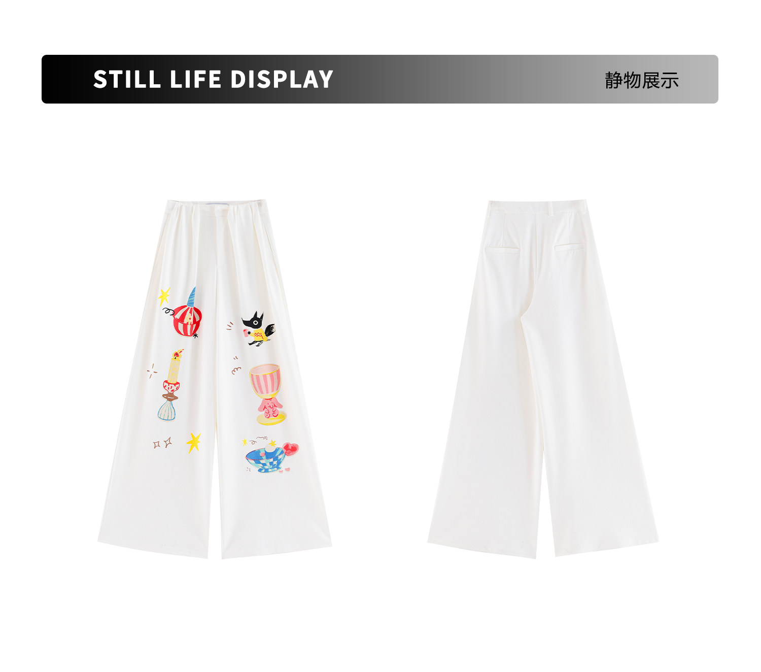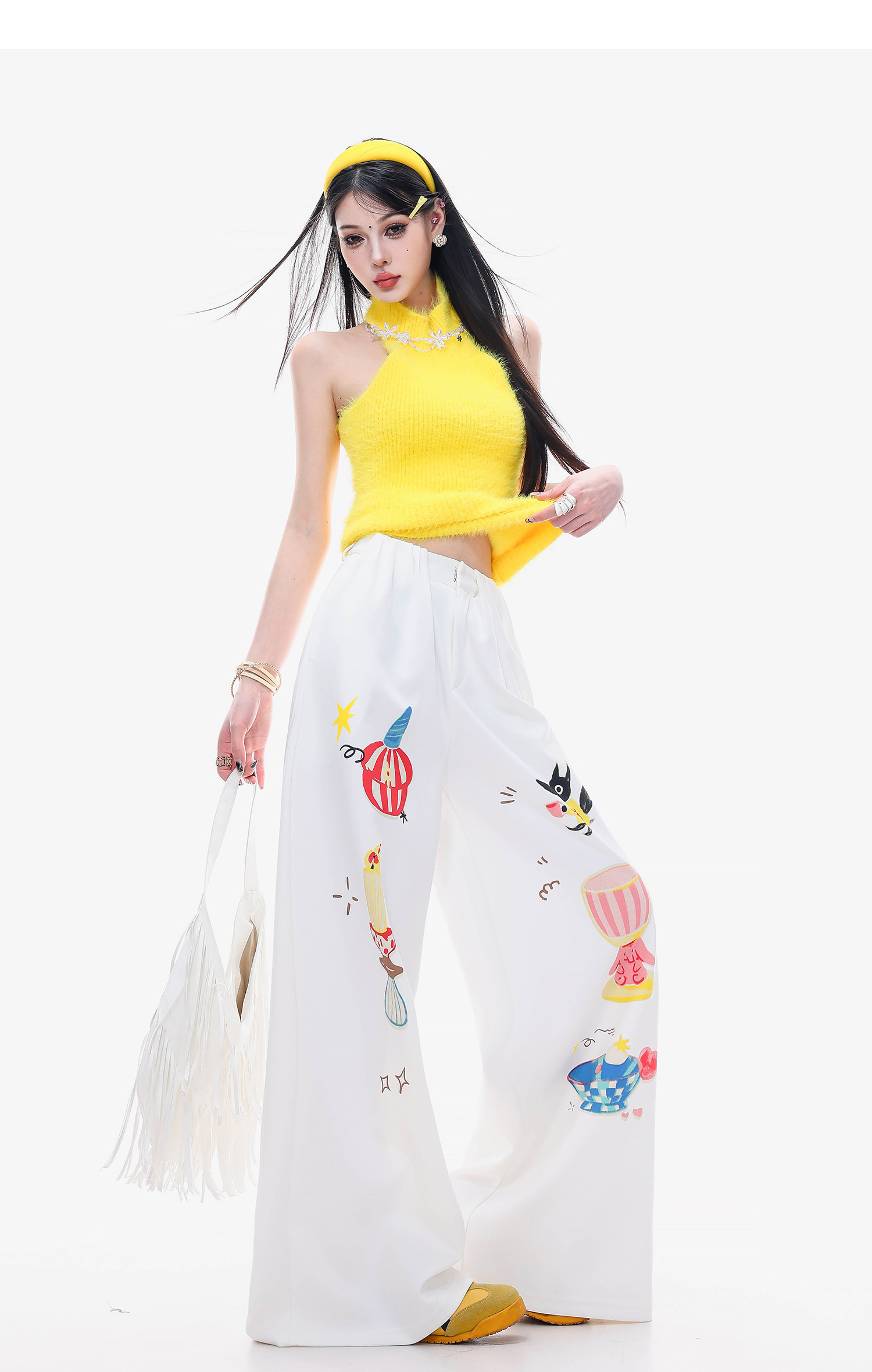 Abwlr Fairy Tale Town-Original Cartoon Printed Straight Wide-Leg Pants for Women Spring and Summer White Loose Slimming Look Casual Pants