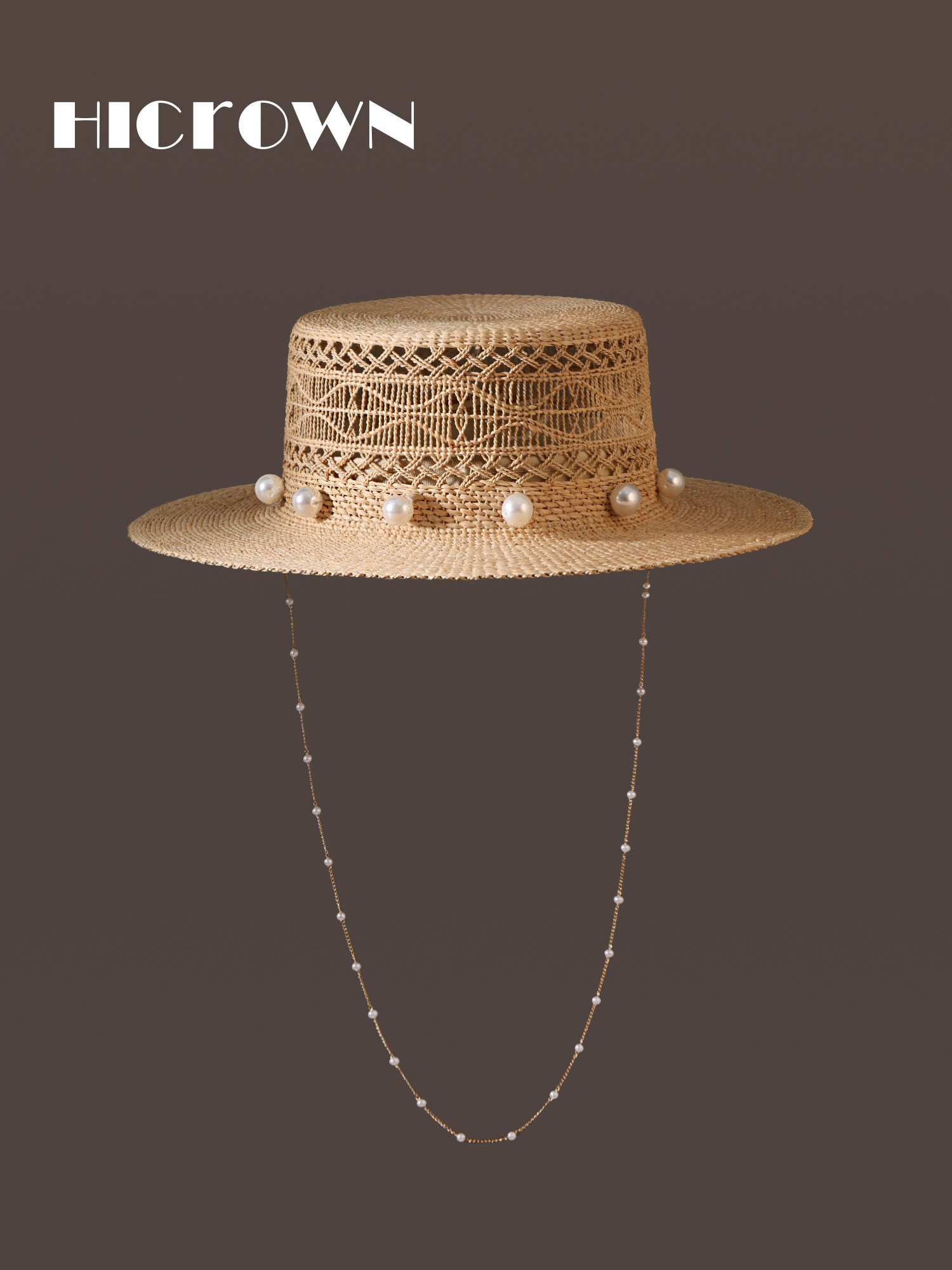 French-Style Hand-Woven Hollow-Out Raffia Straw Hat for Women, Summer Pearl Chain Vacation Sun Hat, Flat-Top Hat, Travel Accessory