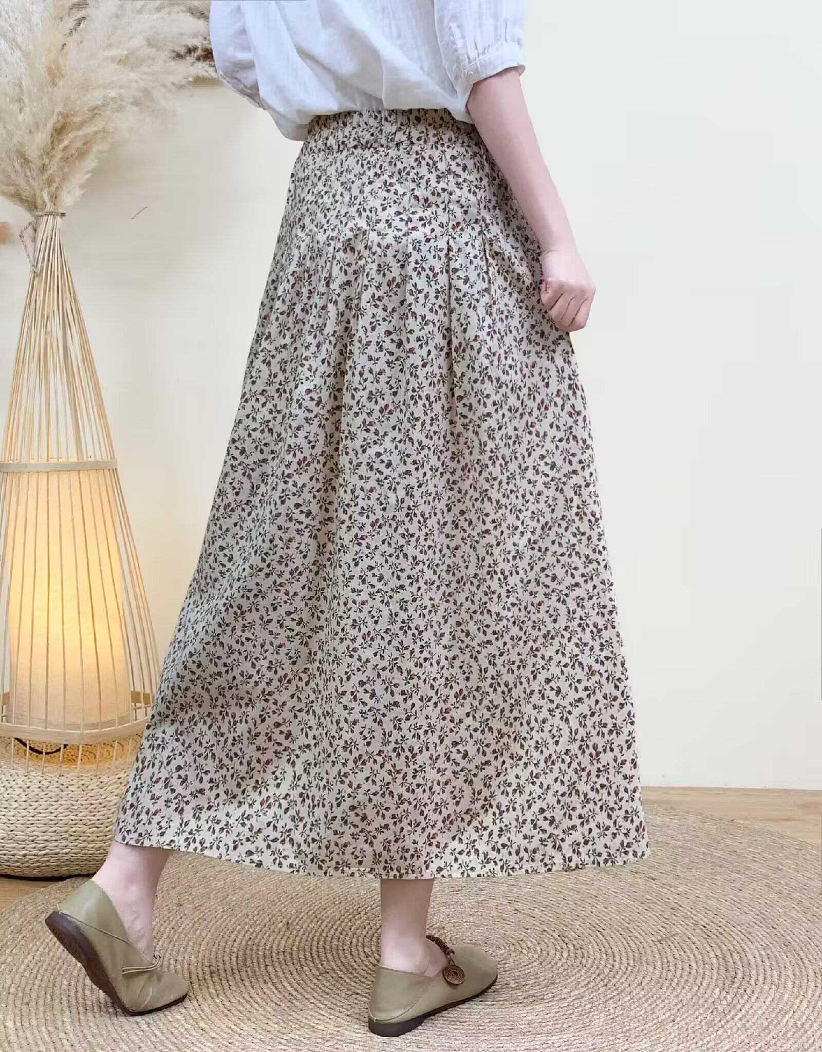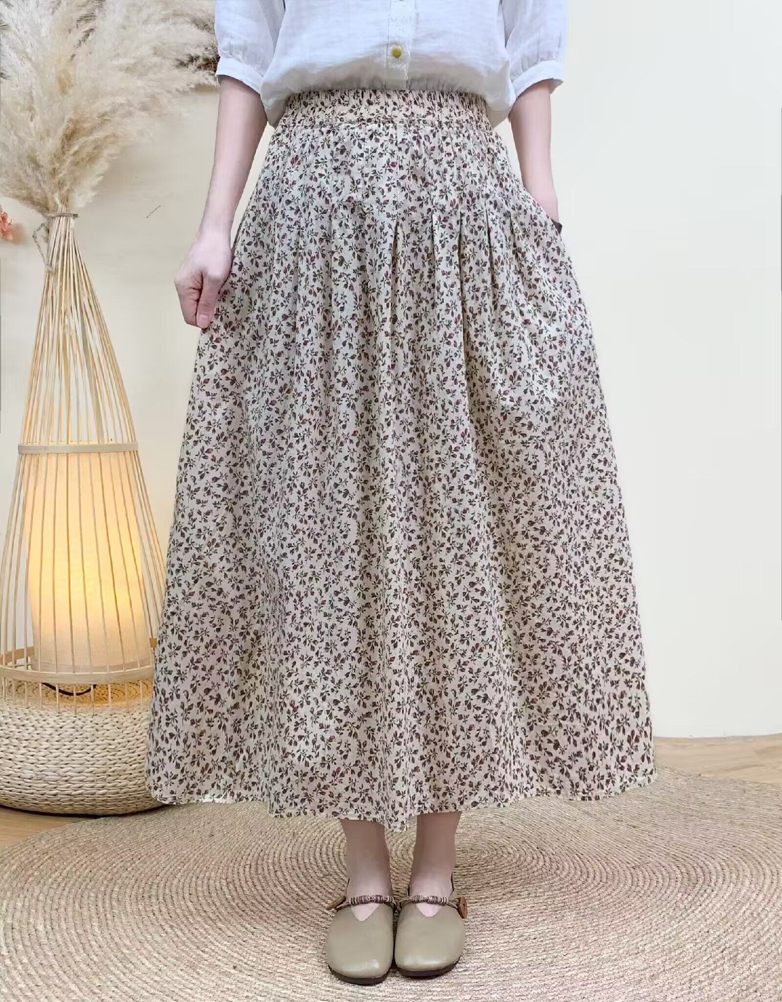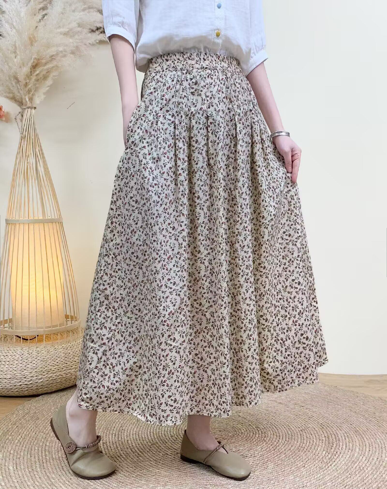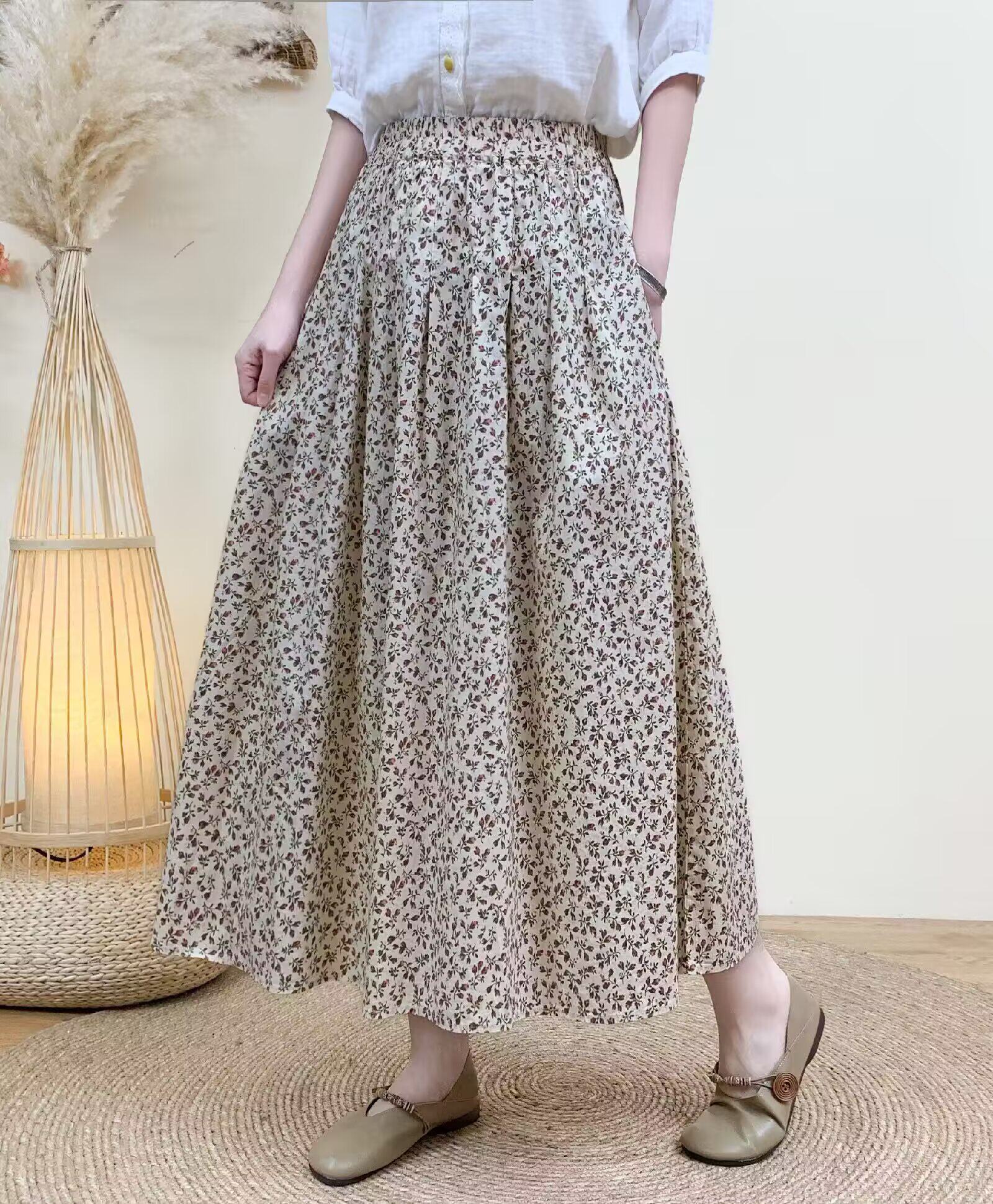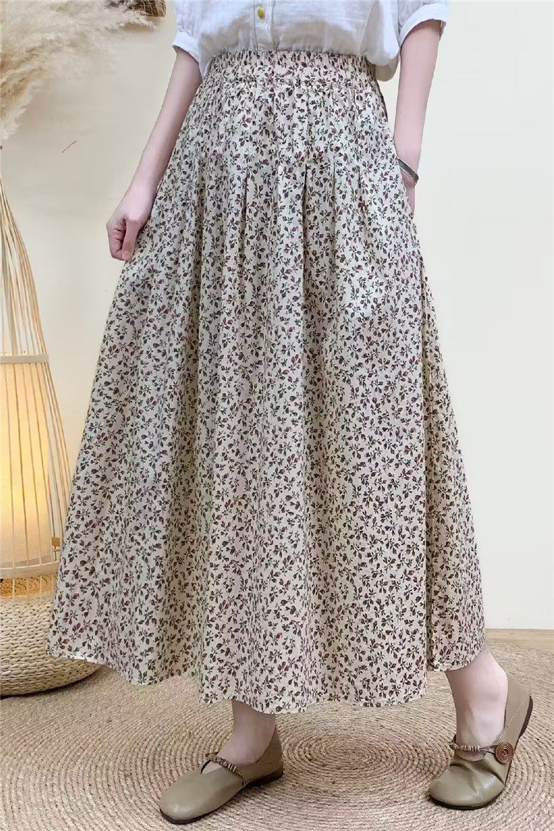 Light Chinese-Style Pure Cotton Floral Print Pleated Retro A-Line Skirt for Women, New Spring 2026 Collection, Suitable for Petite Sizes