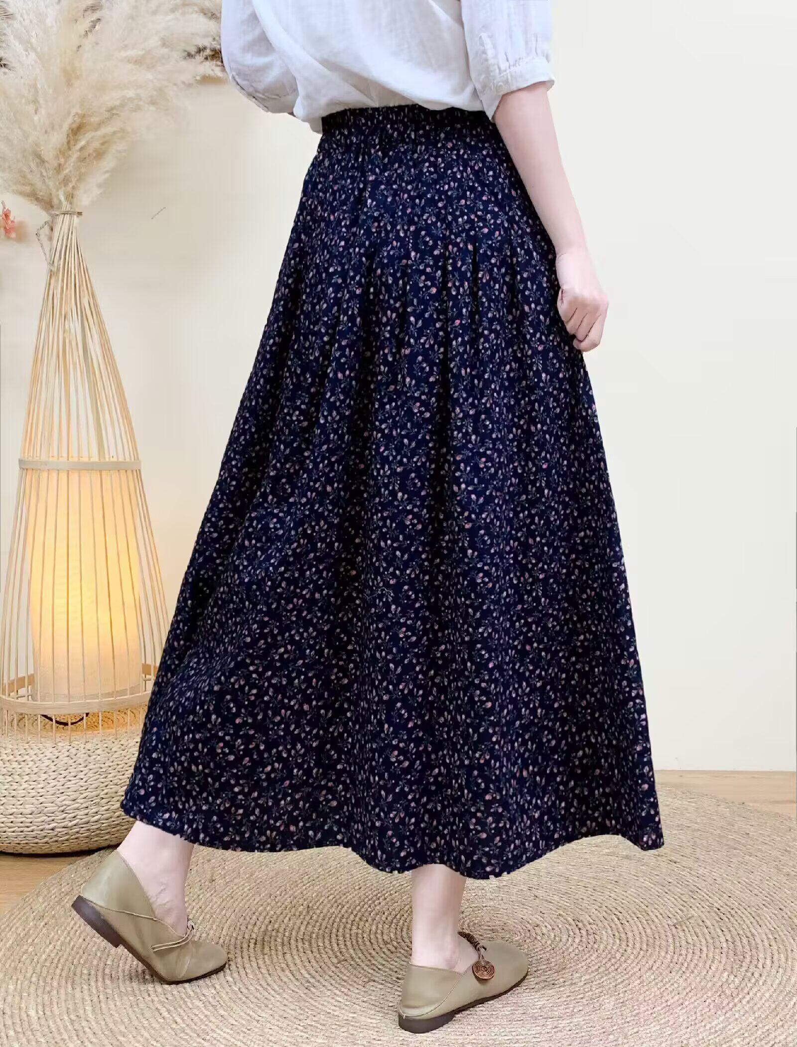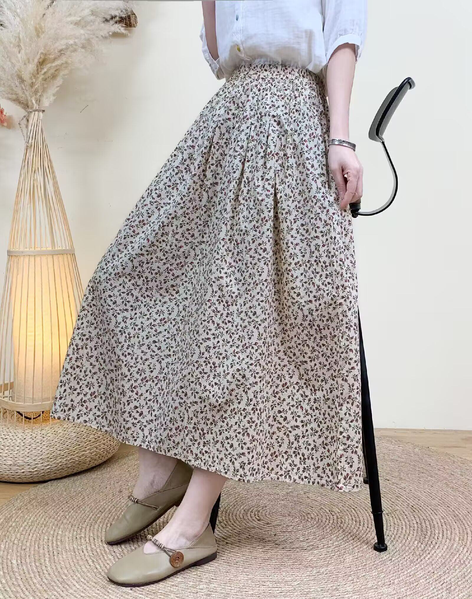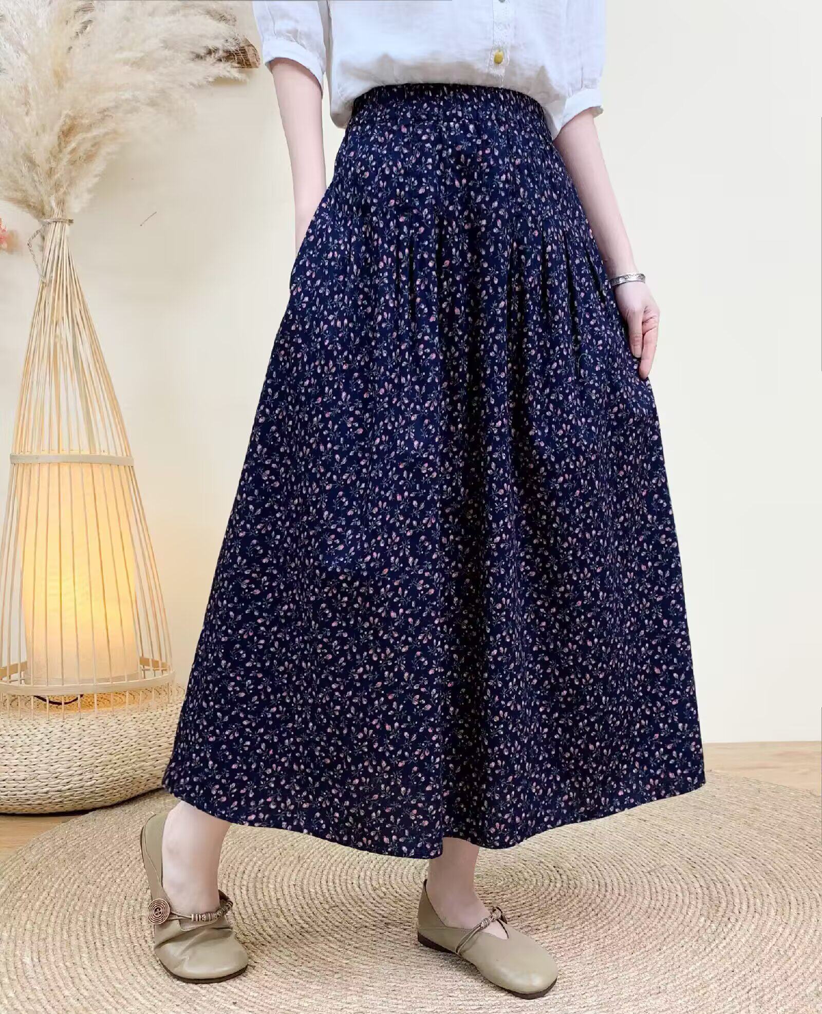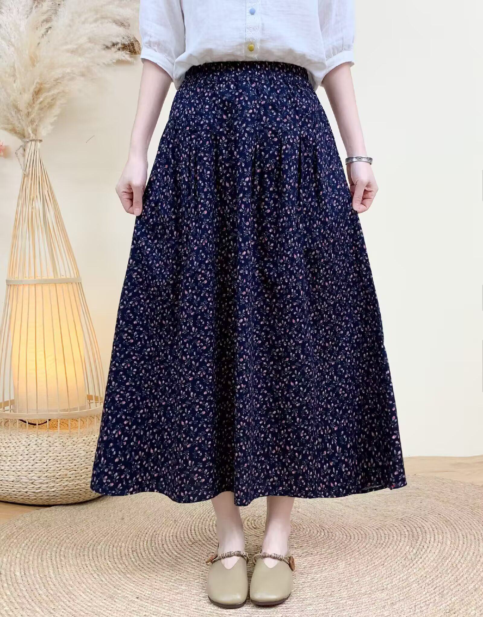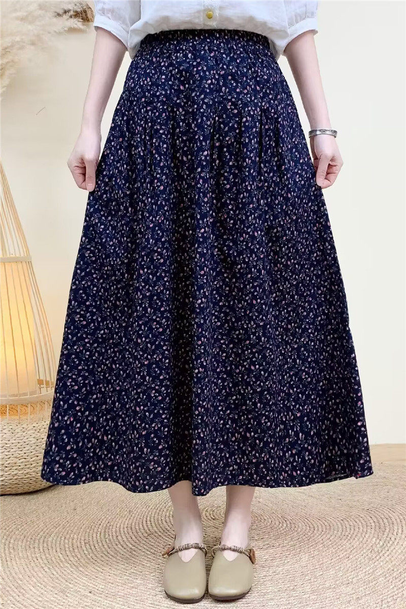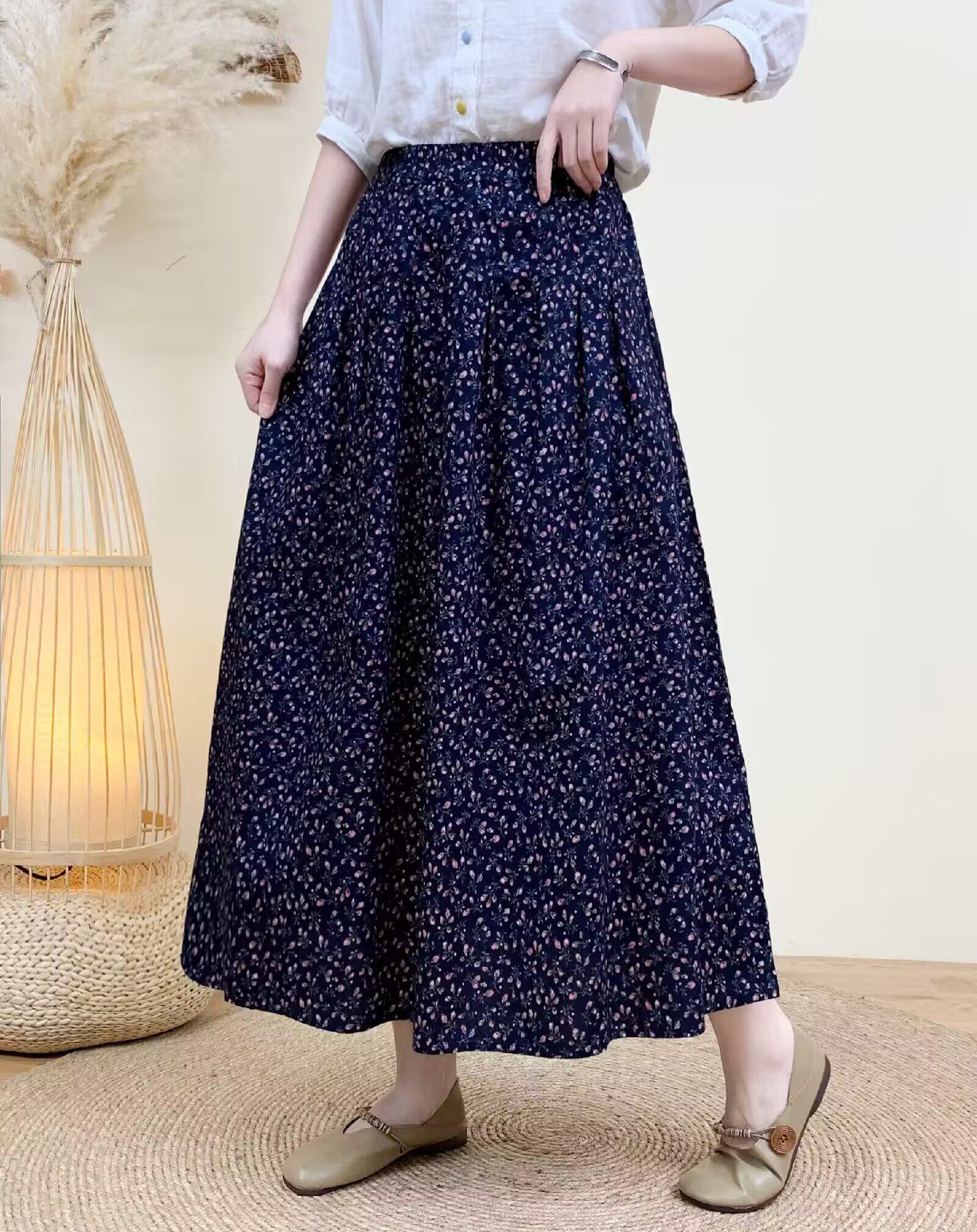 Light Chinese-Style Pure Cotton Floral Print Pleated Retro A-Line Skirt for Women, New Spring 2026 Collection, Suitable for Petite Sizes