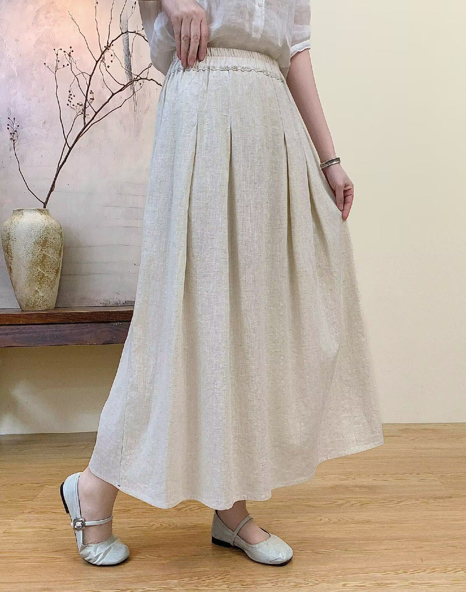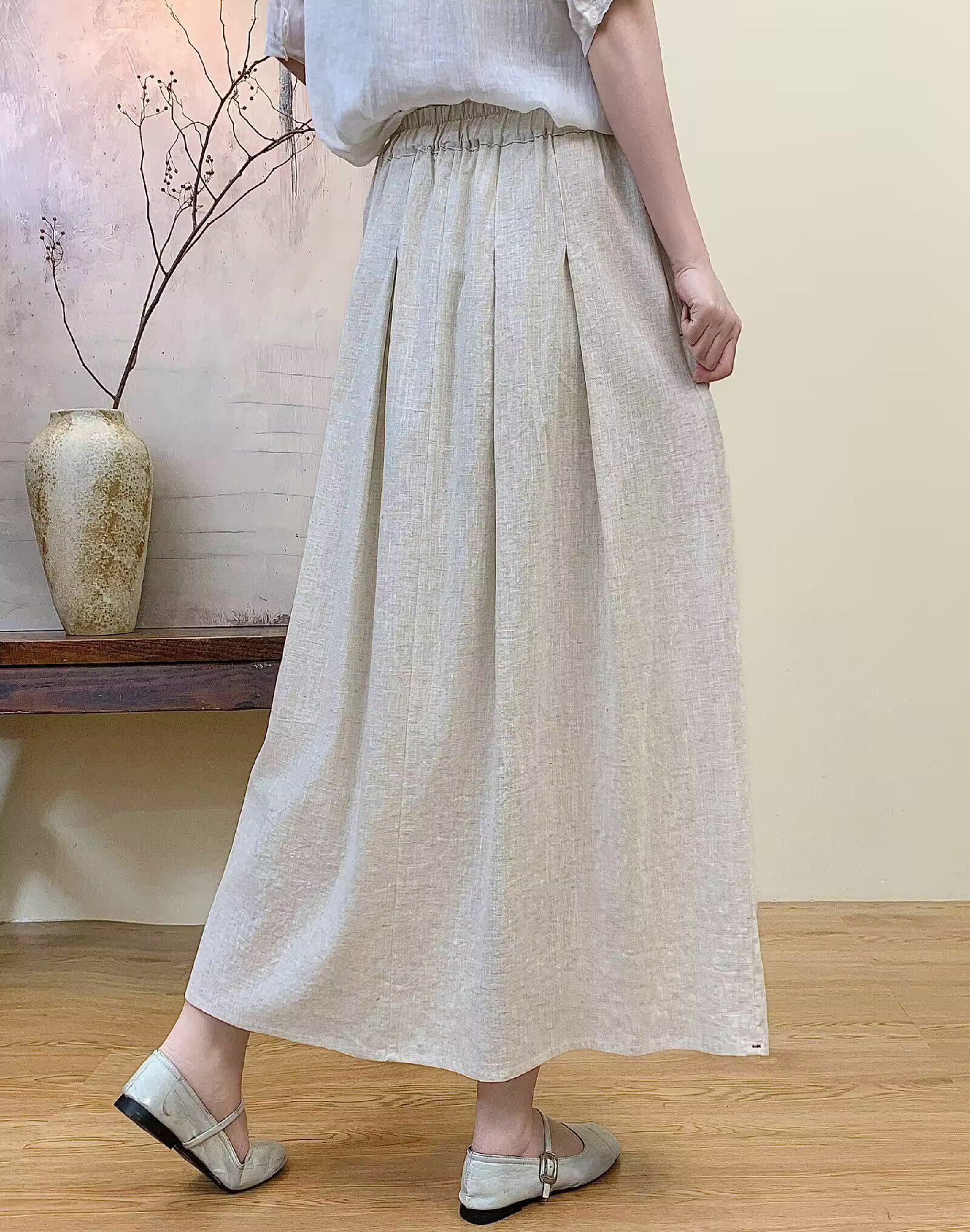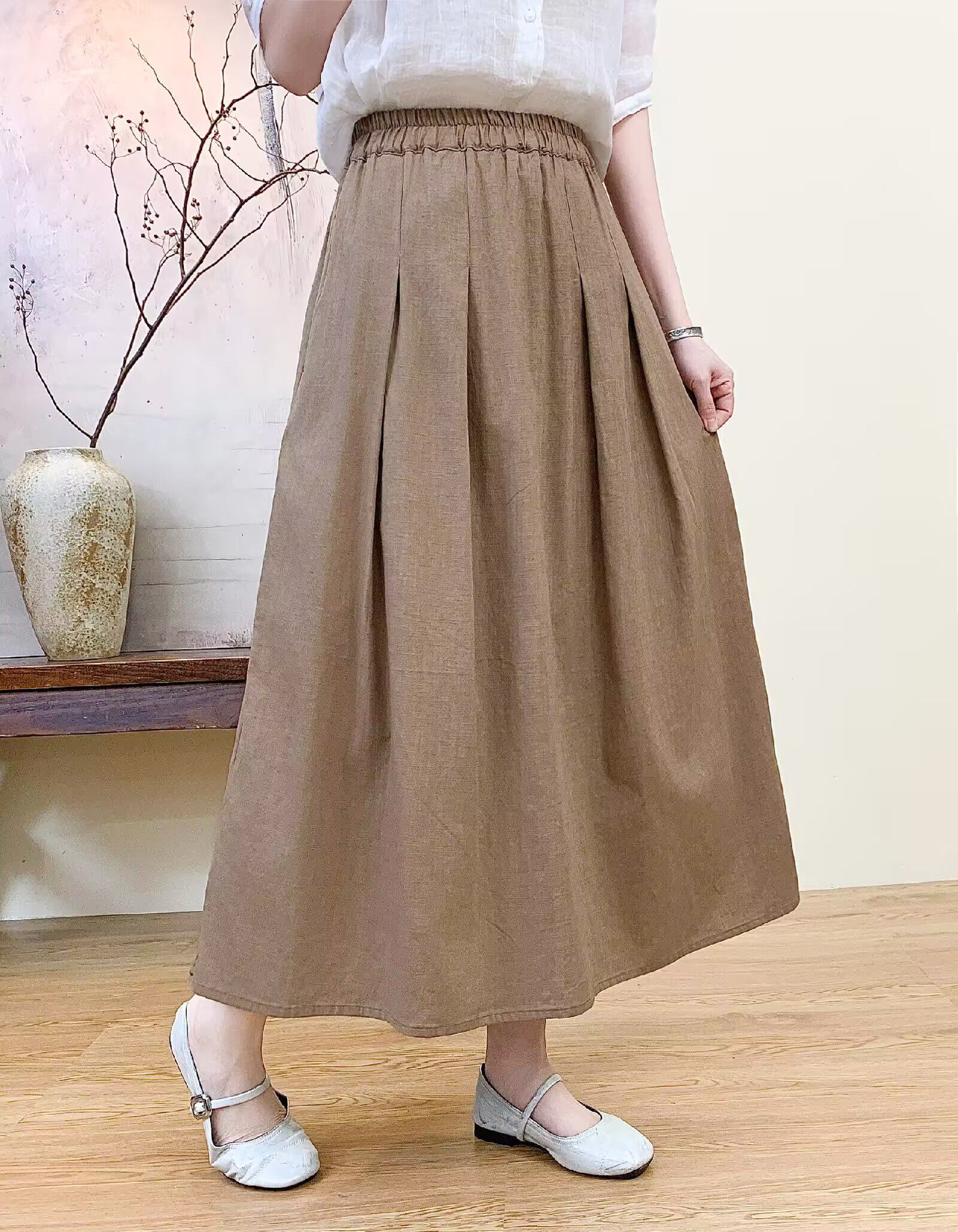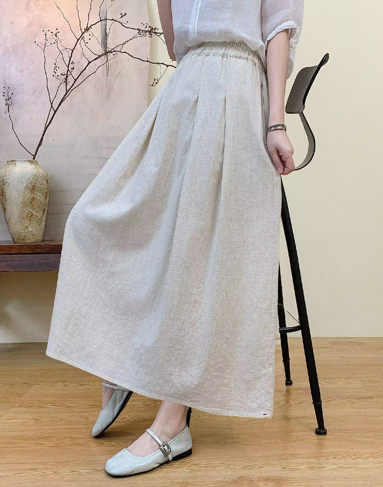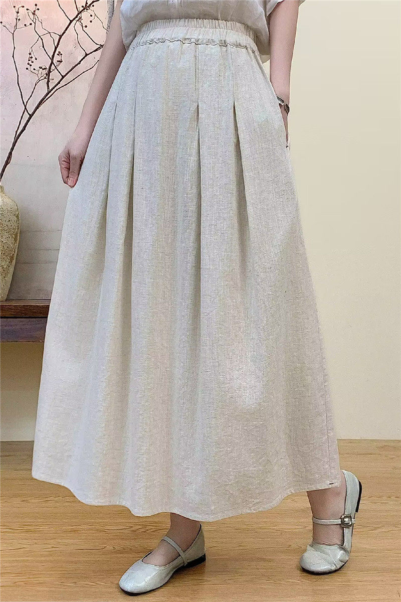 Vintage Artistic Pure Linen Skirt for Women 2026 Summer Slimming A-Line Midi Skirt with Wide Hem for Petite Figures