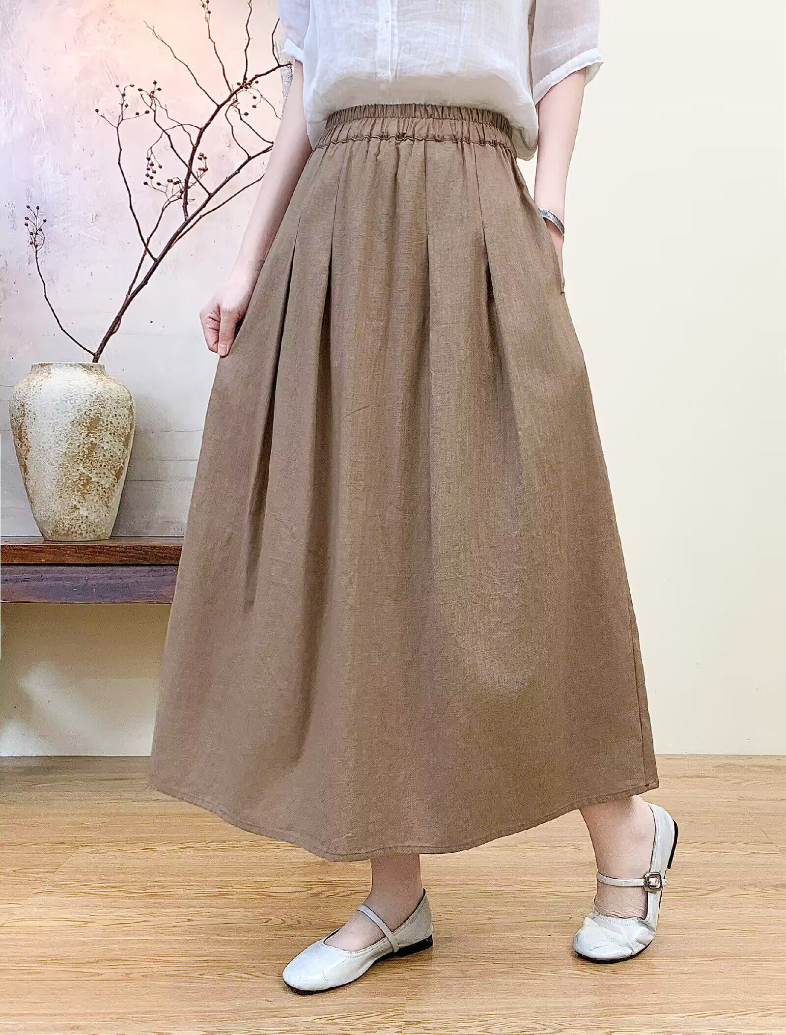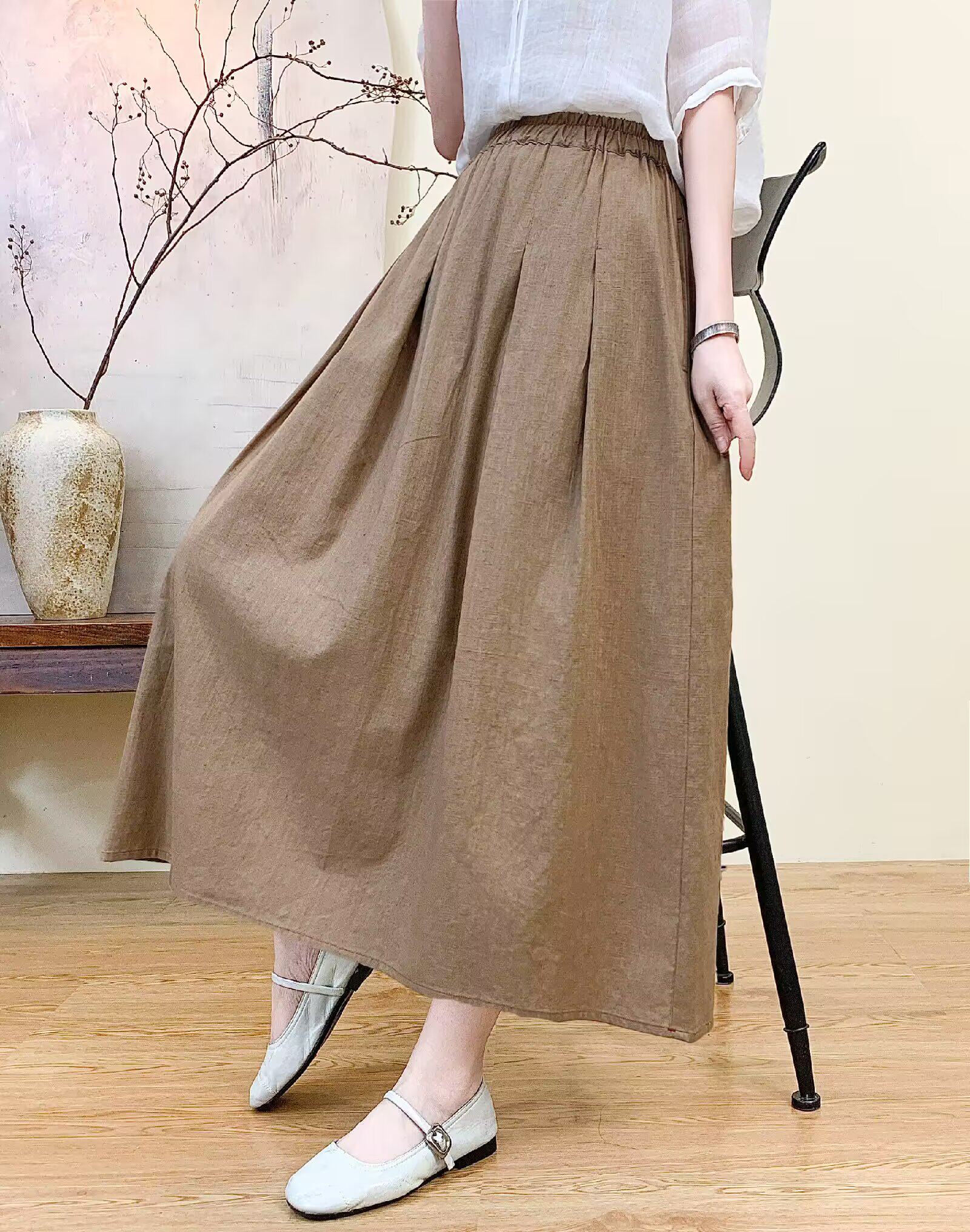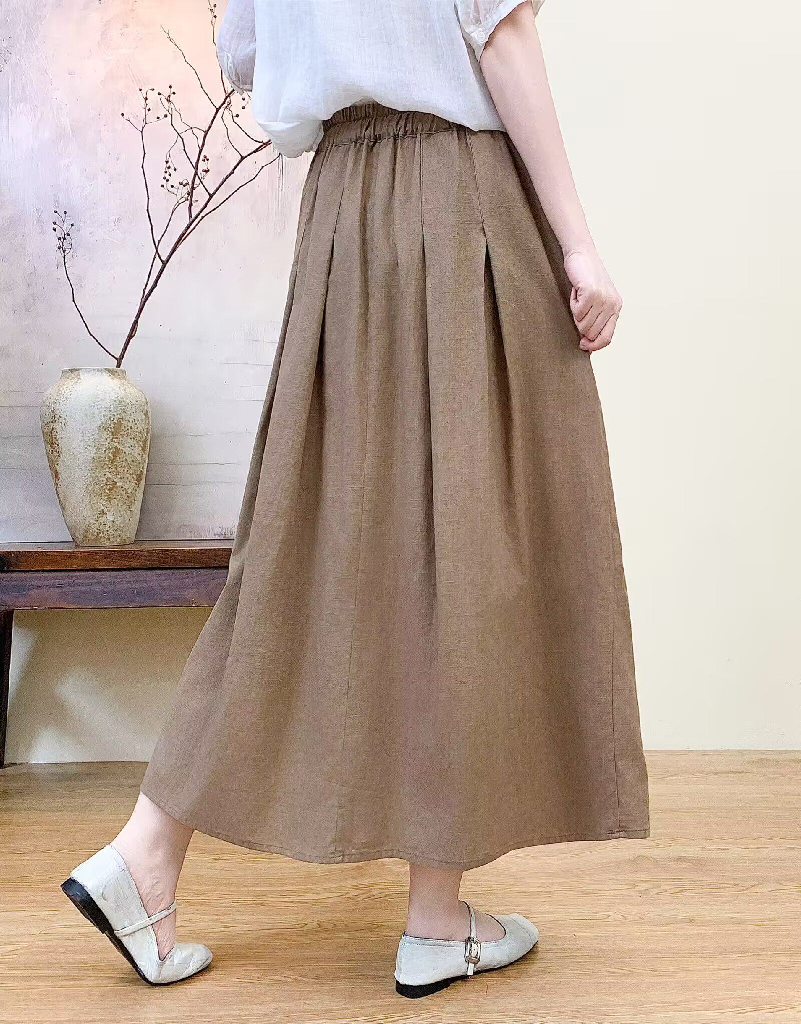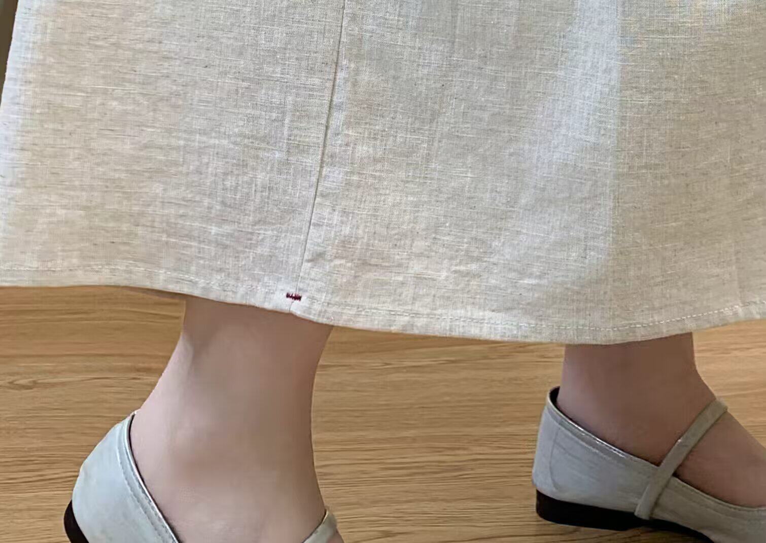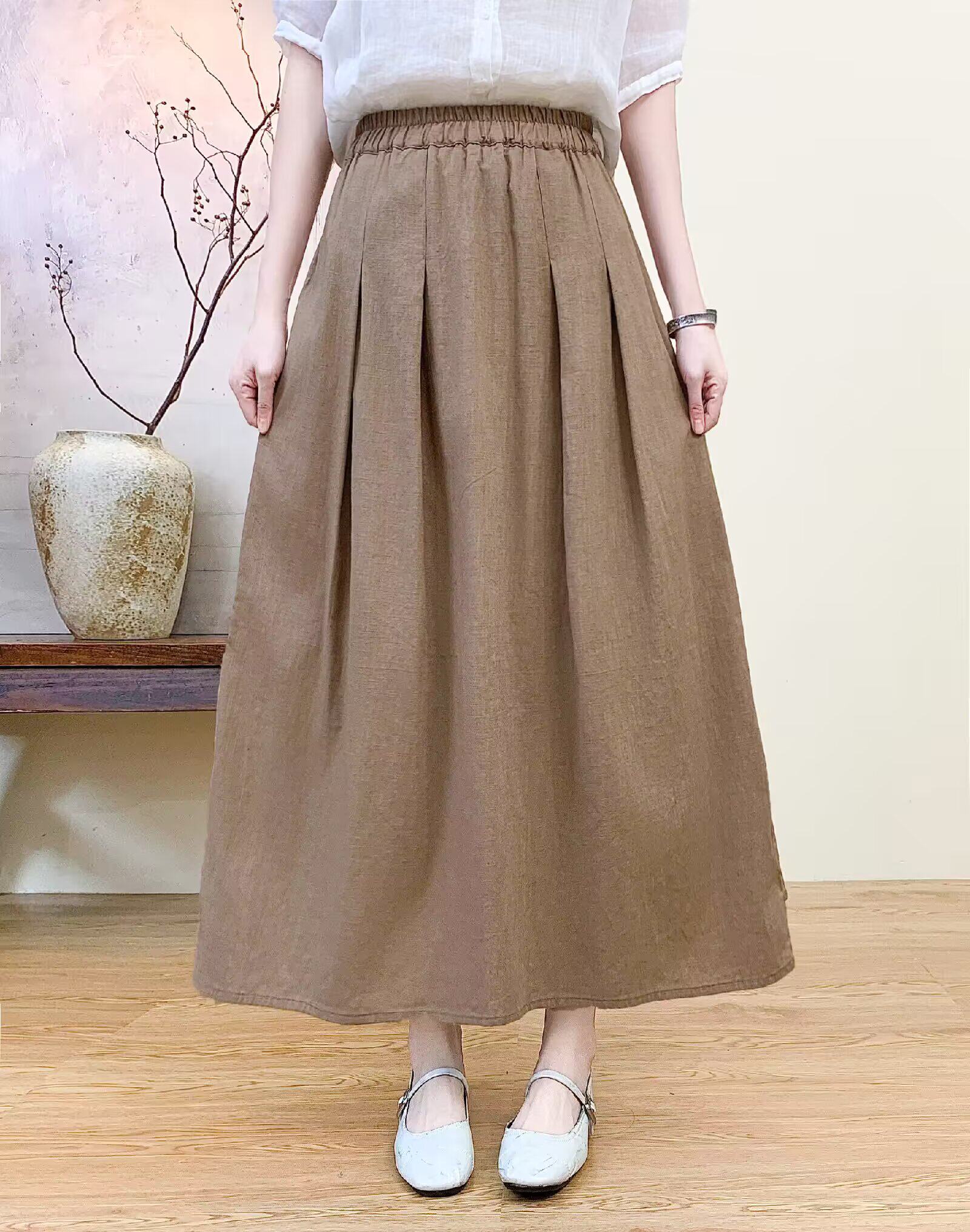 Vintage Artistic Pure Linen Skirt for Women 2026 Summer Slimming A-Line Midi Skirt with Wide Hem for Petite Figures