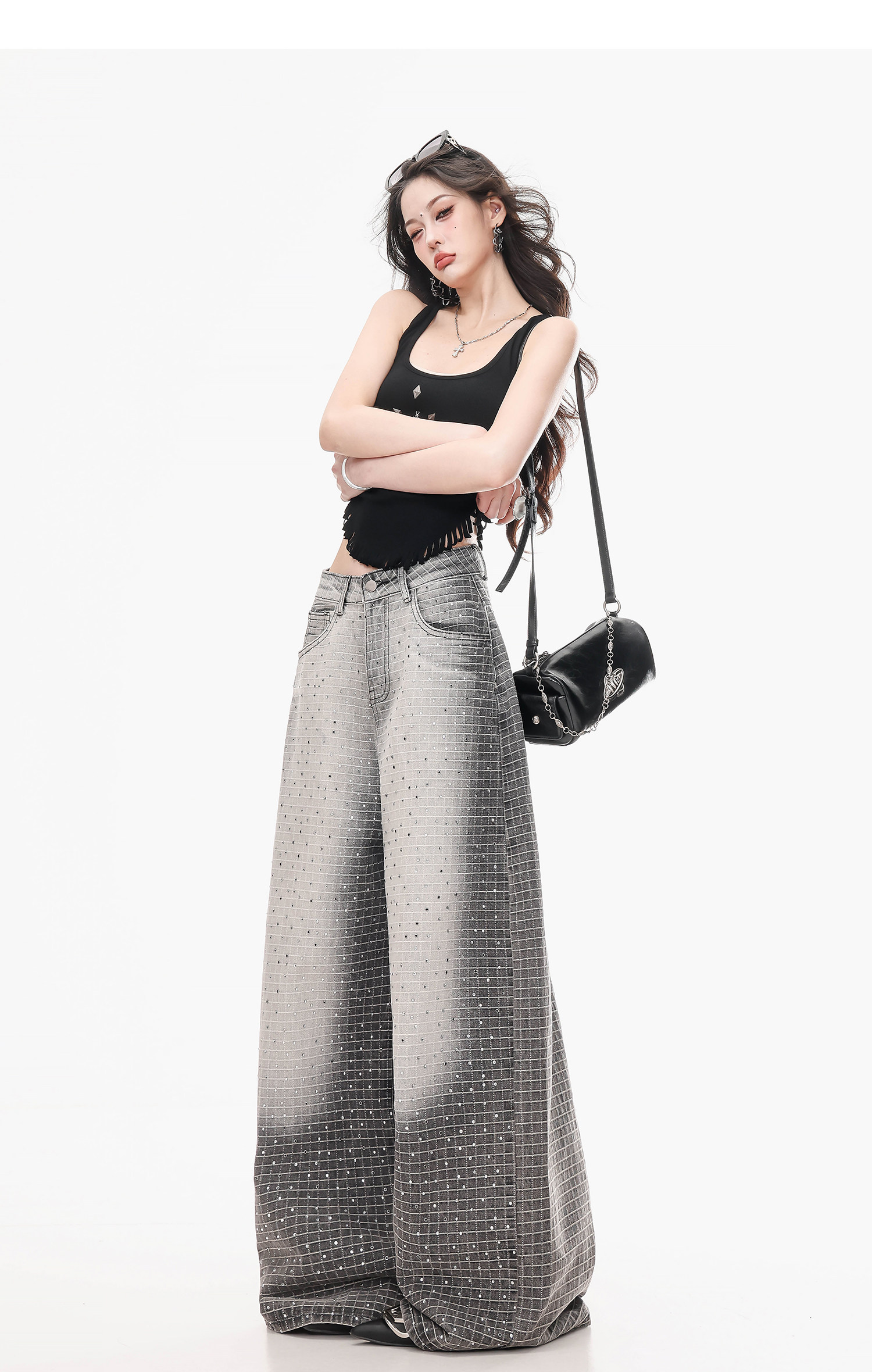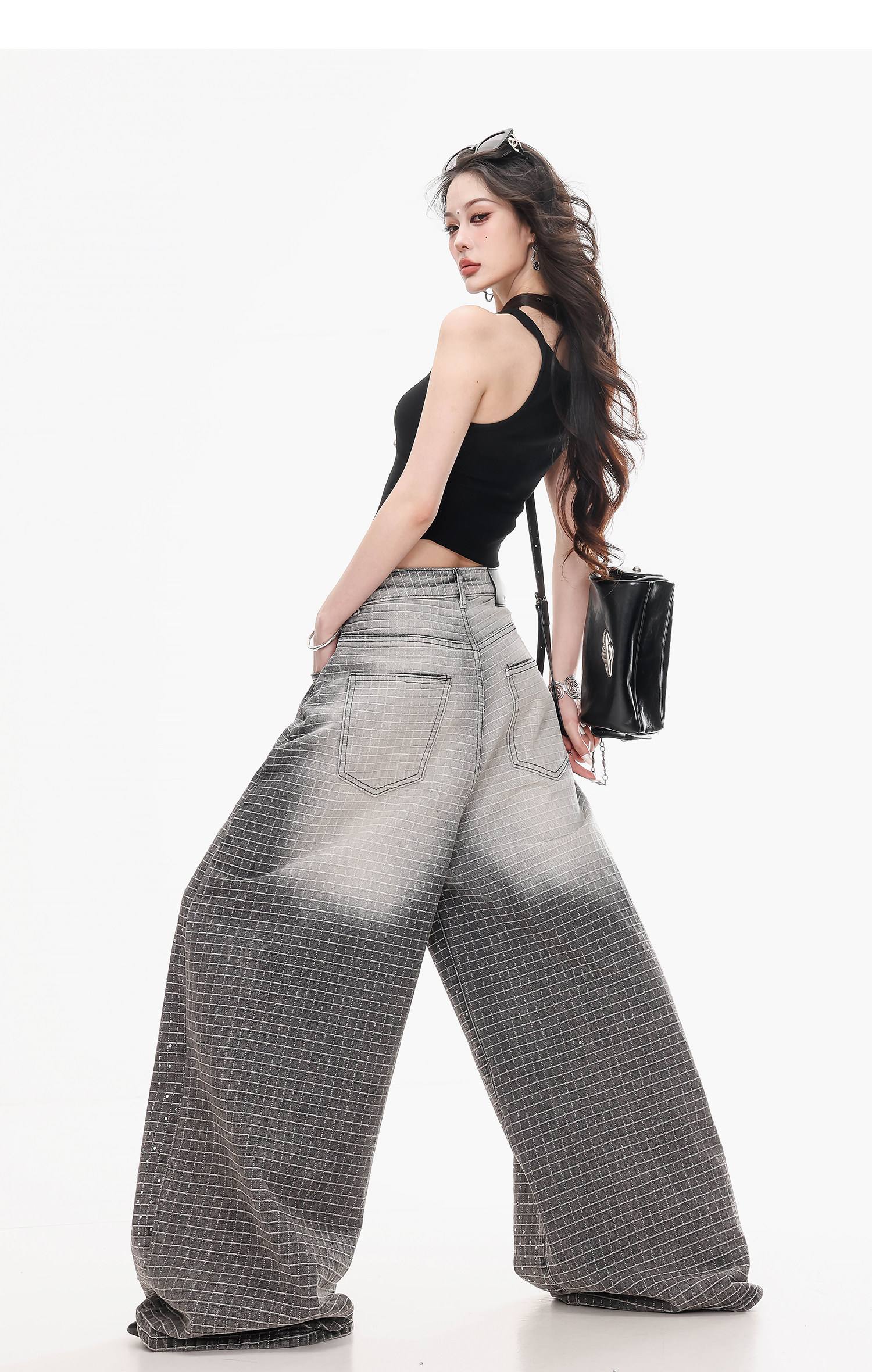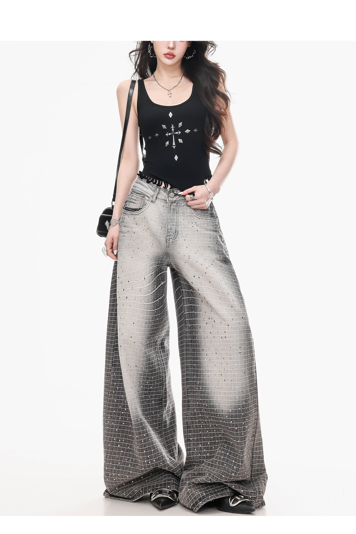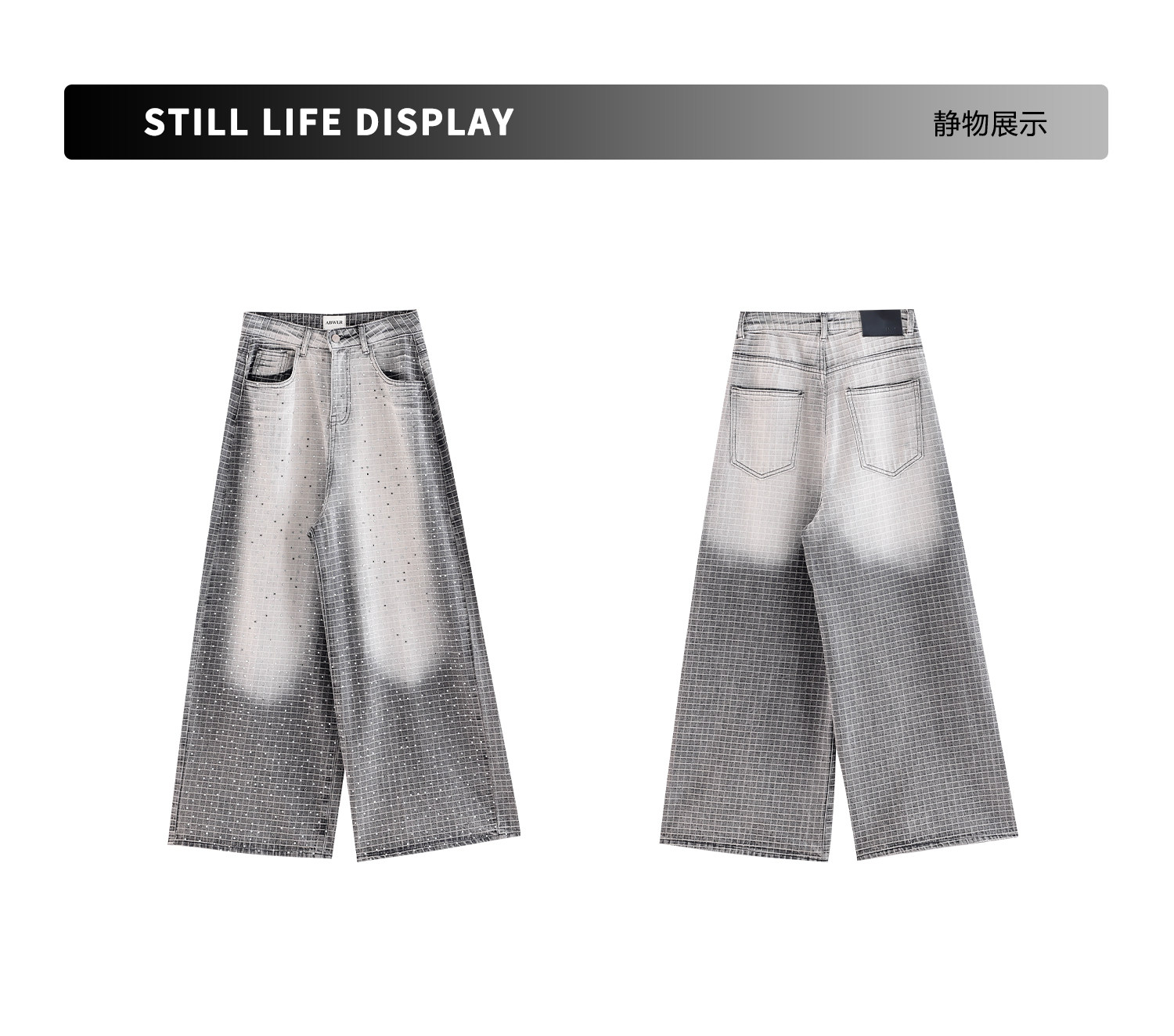Abwlr Original Retro Plaid Rhinestone Wide-Leg Jeans for Women, Spring and Autumn Design, Loose Floor-Length Straight Pants