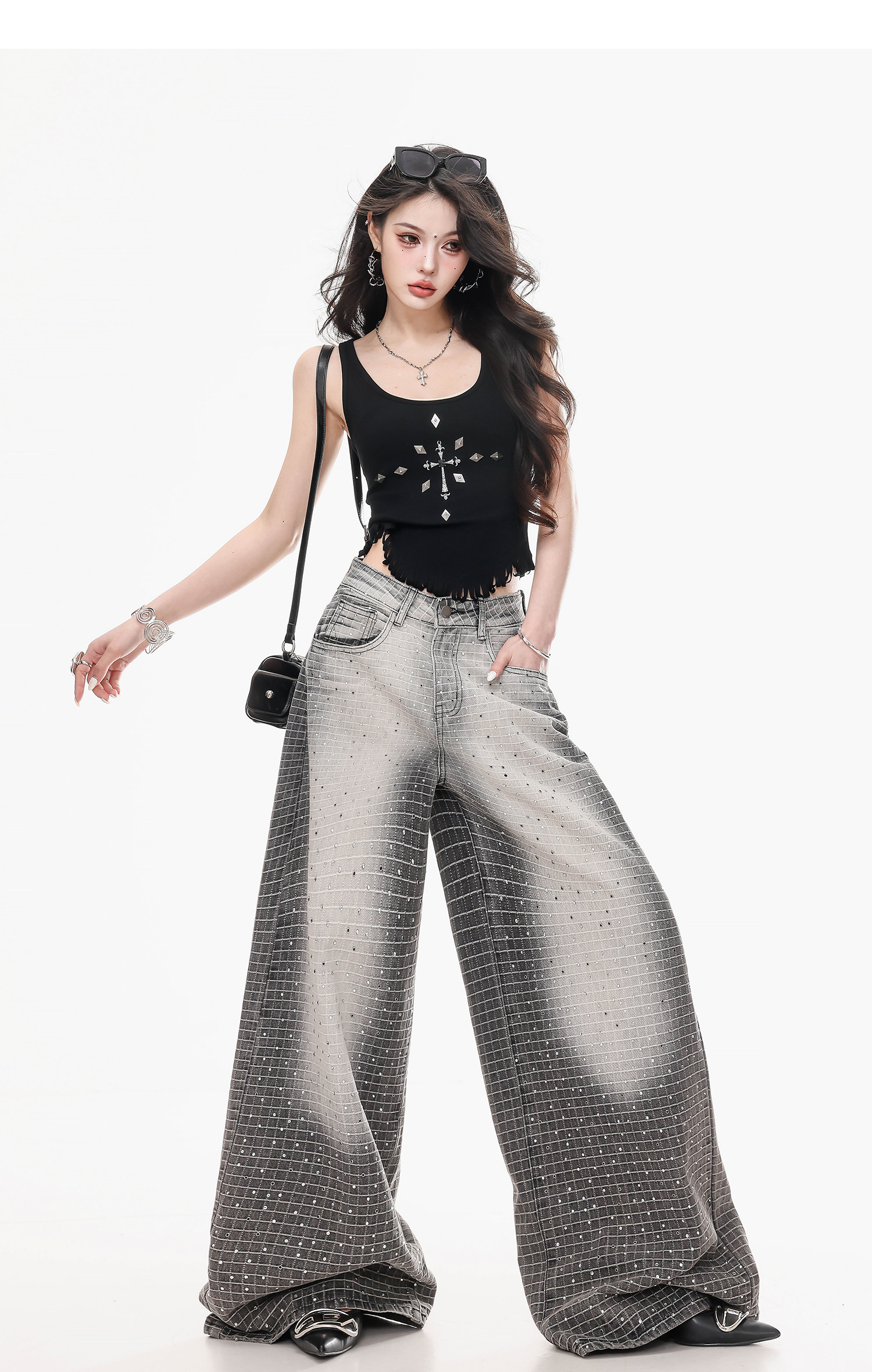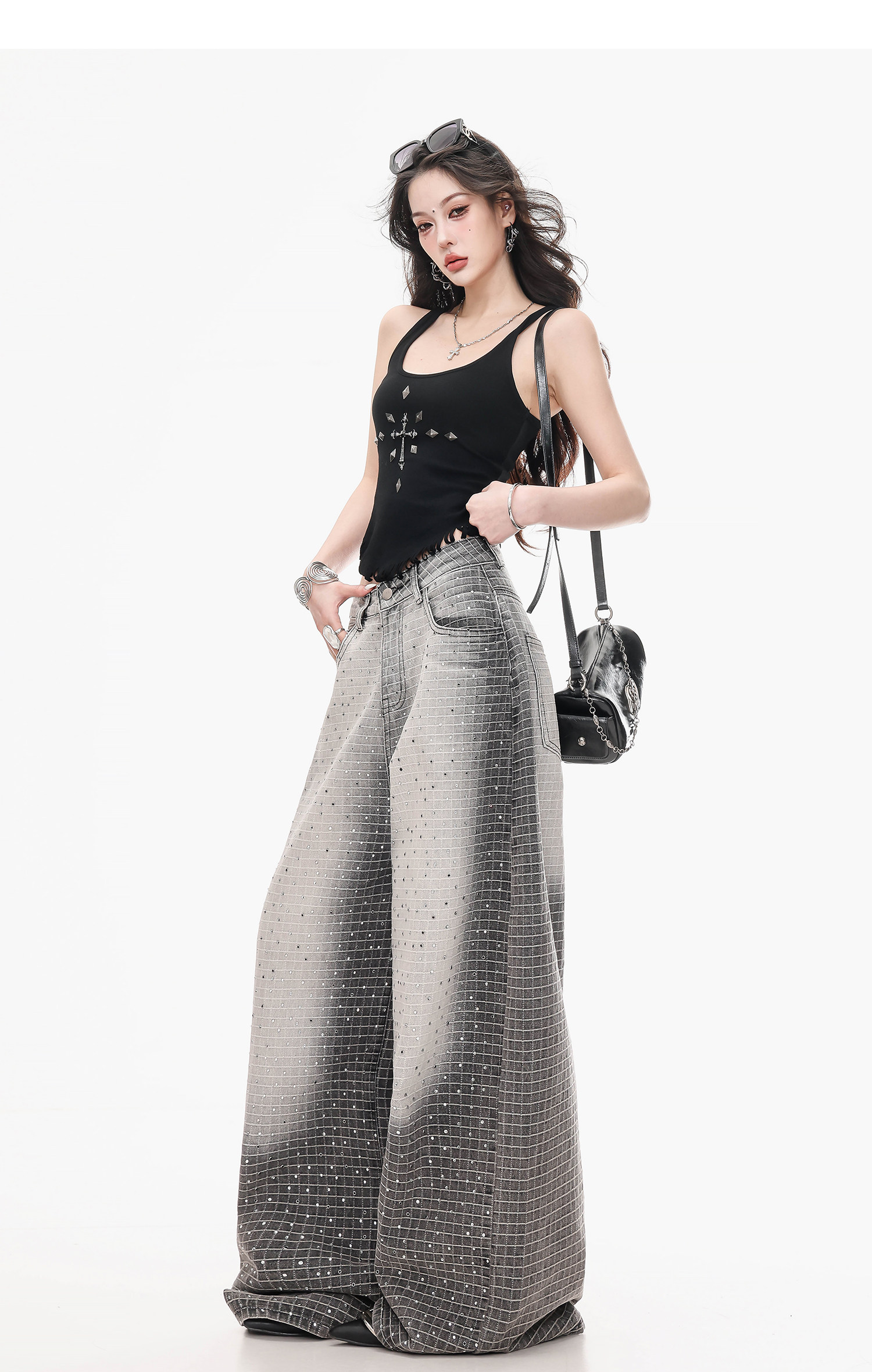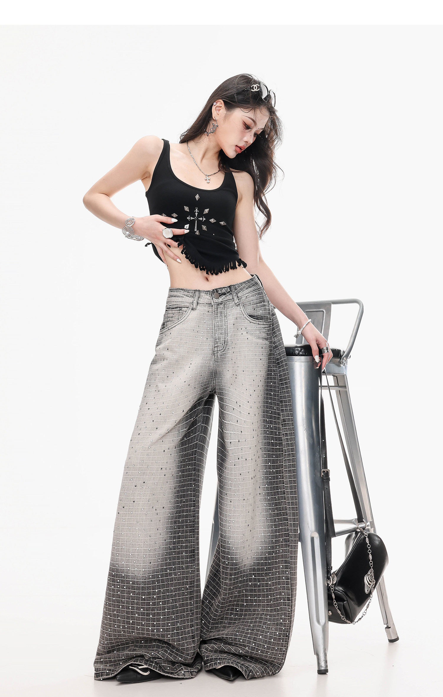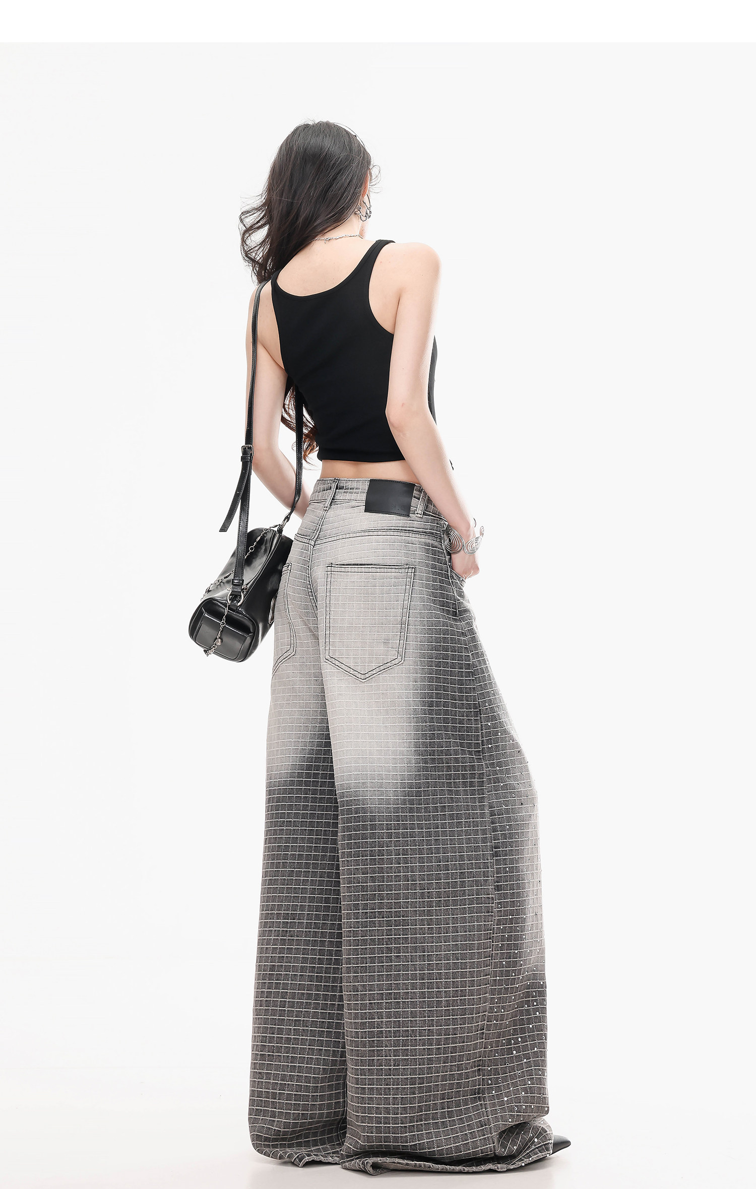Abwlr Original Retro Plaid Rhinestone Wide-Leg Jeans for Women, Spring and Autumn Design, Loose Floor-Length Straight Pants