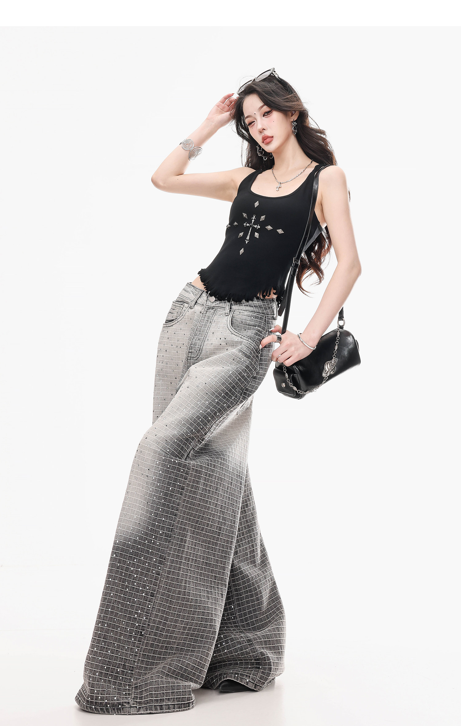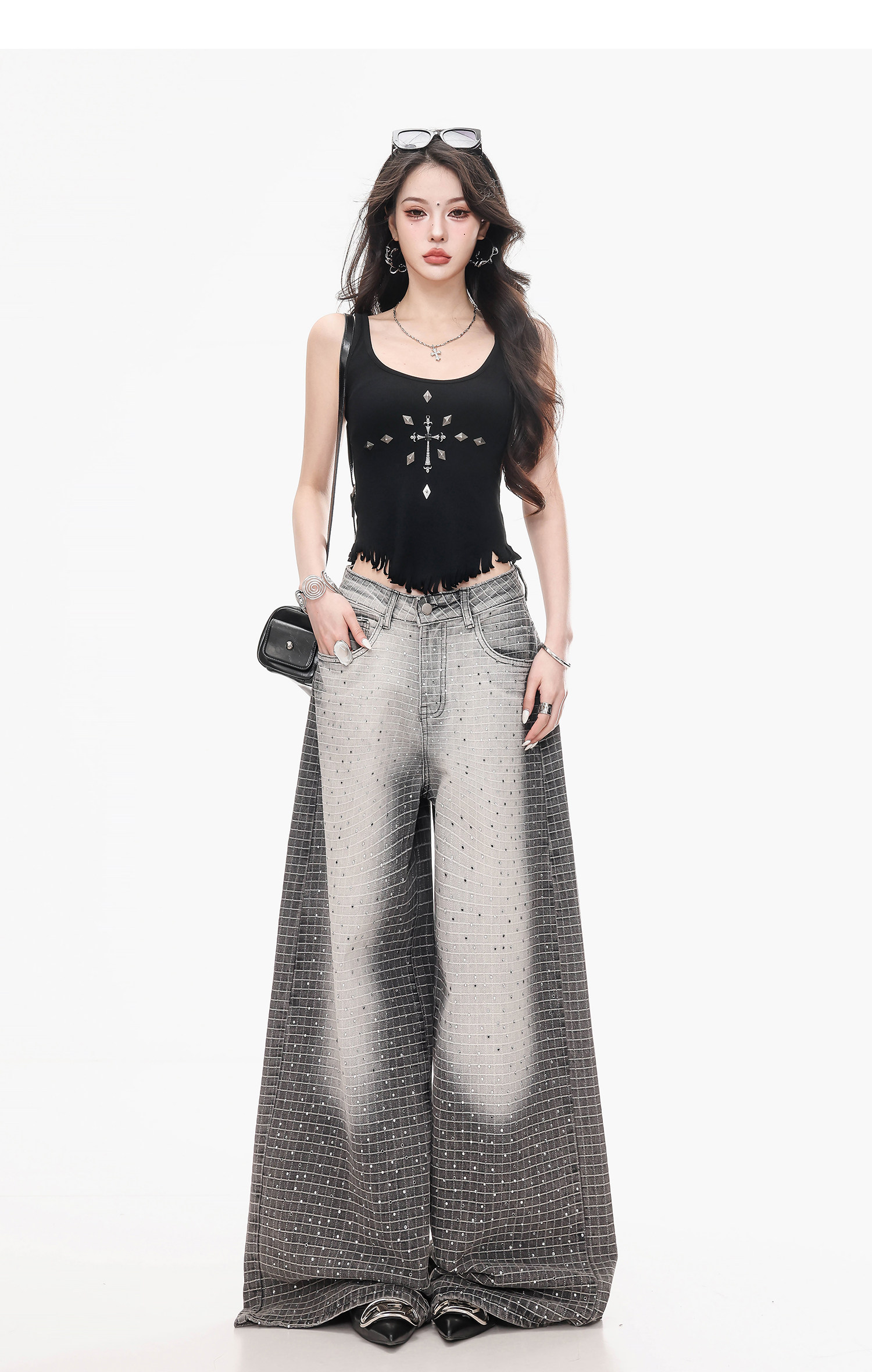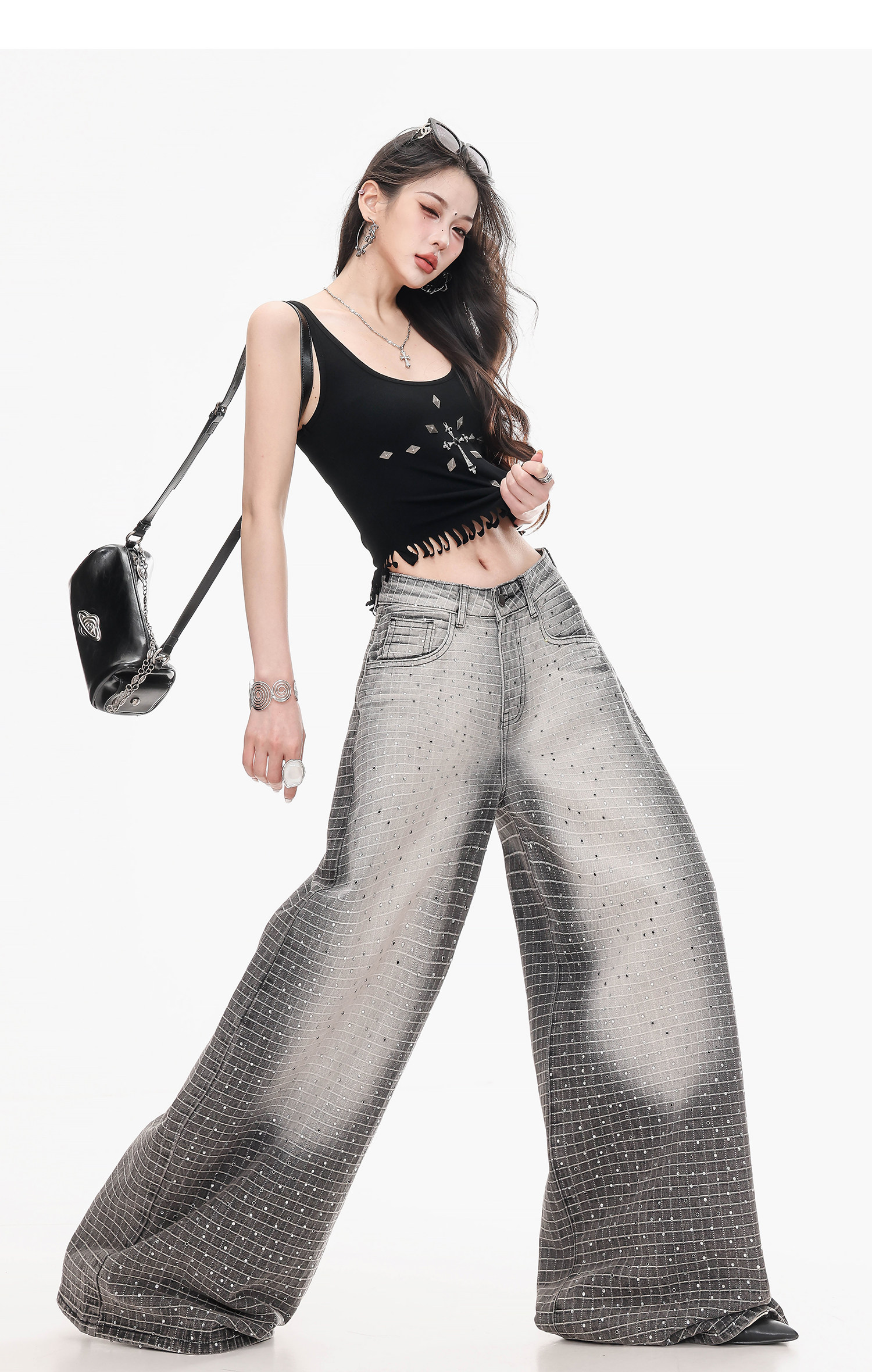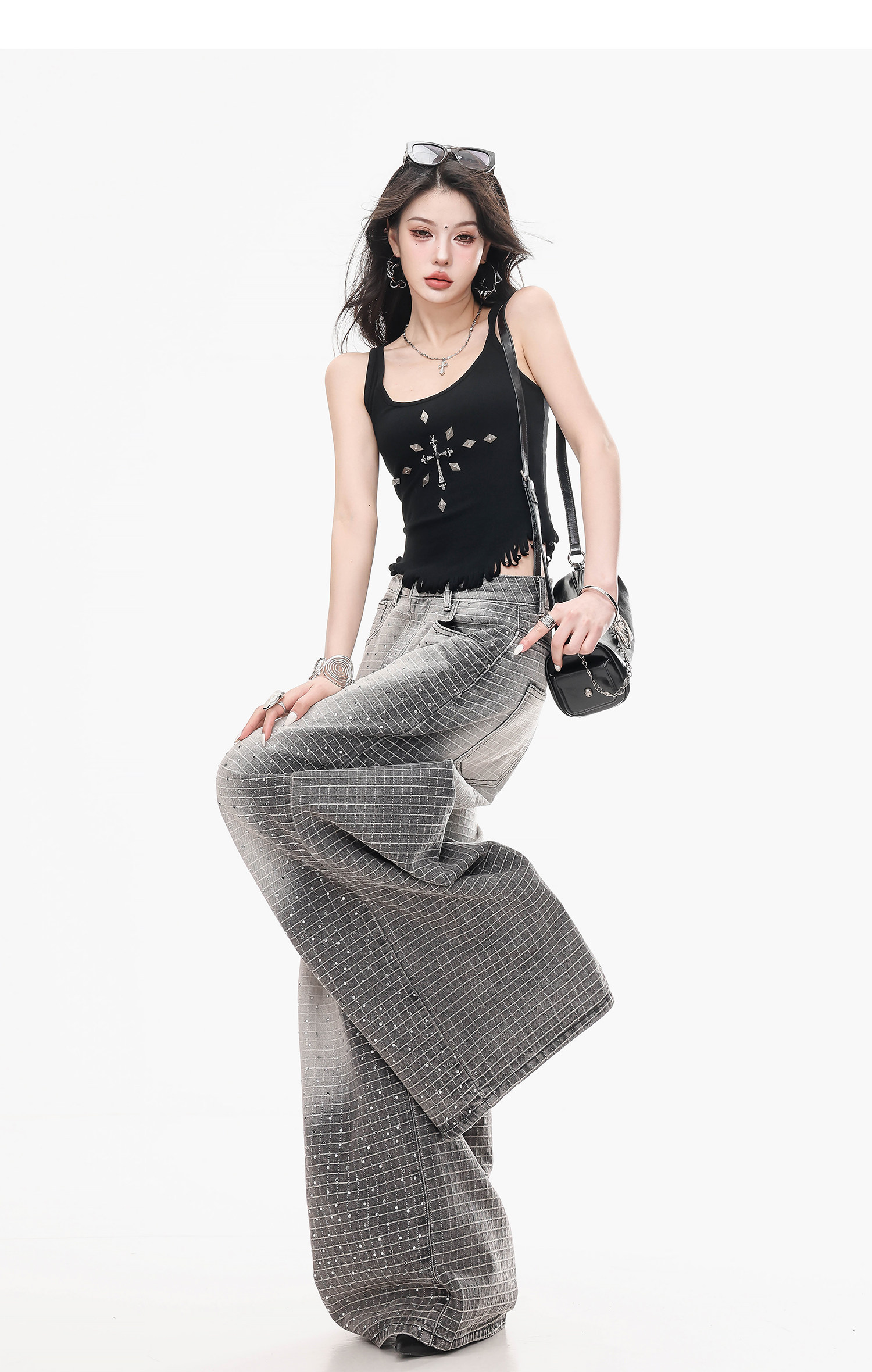 Abwlr Original Retro Plaid Rhinestone Wide-Leg Jeans for Women, Spring and Autumn Design, Loose Floor-Length Straight Pants