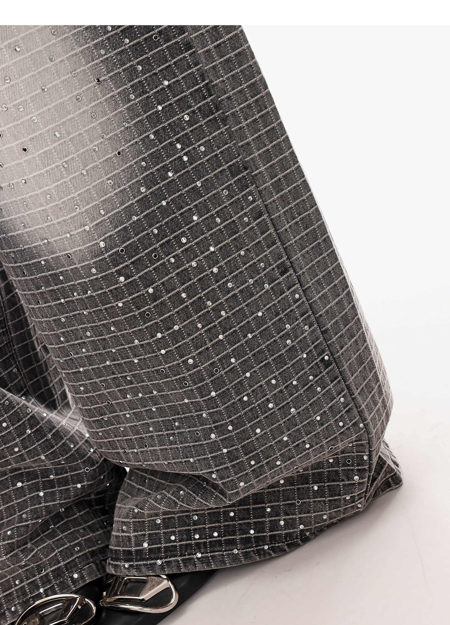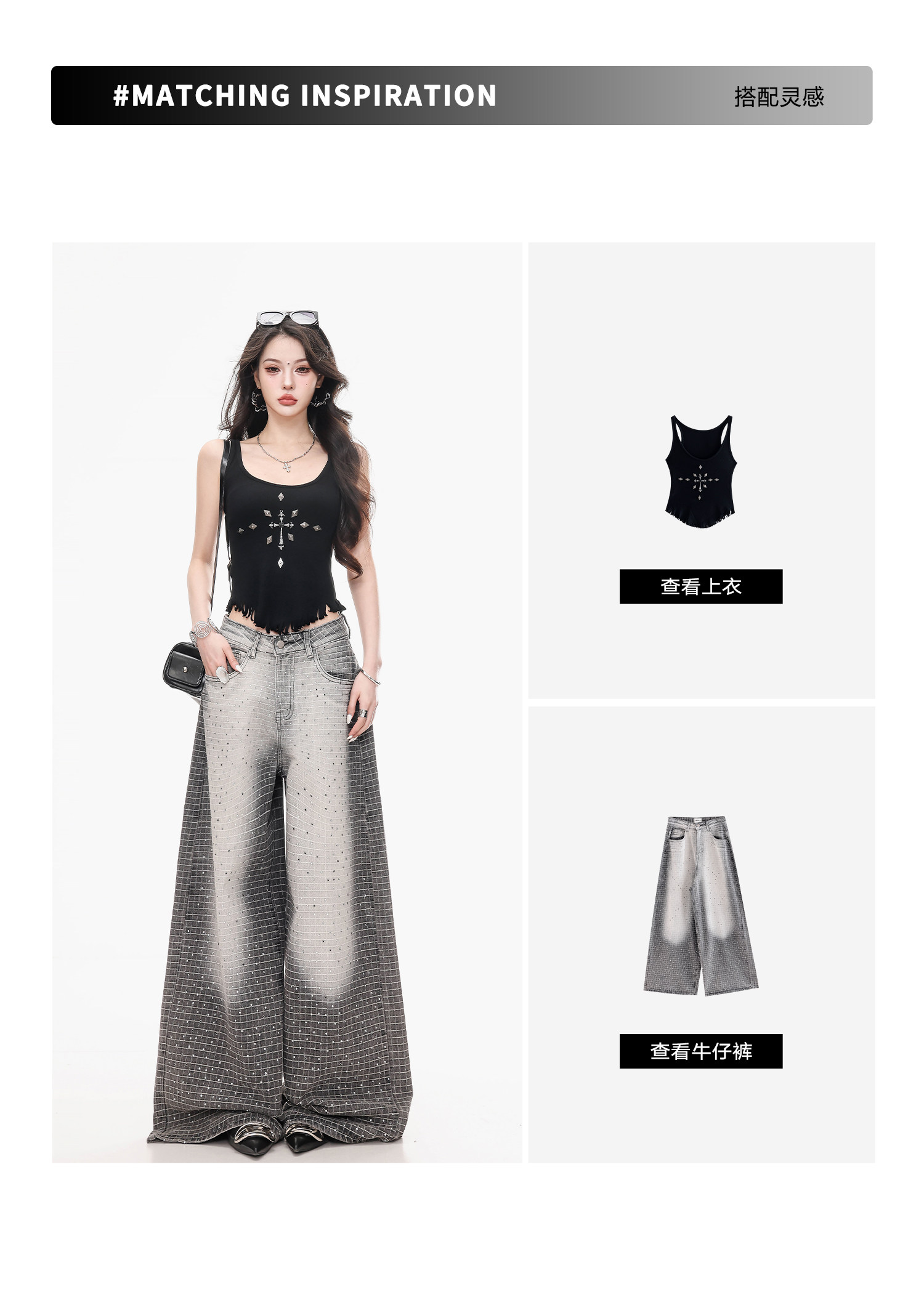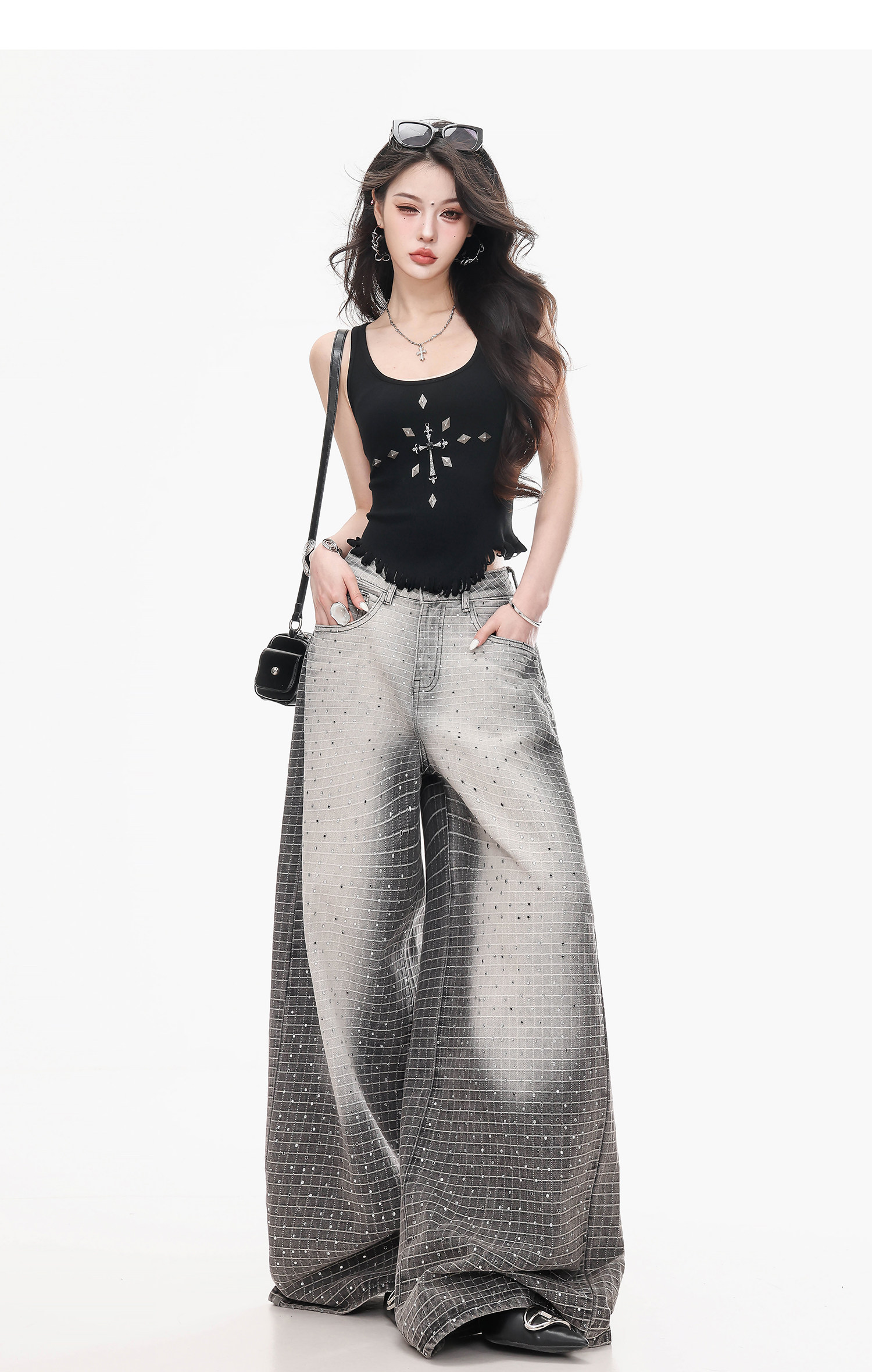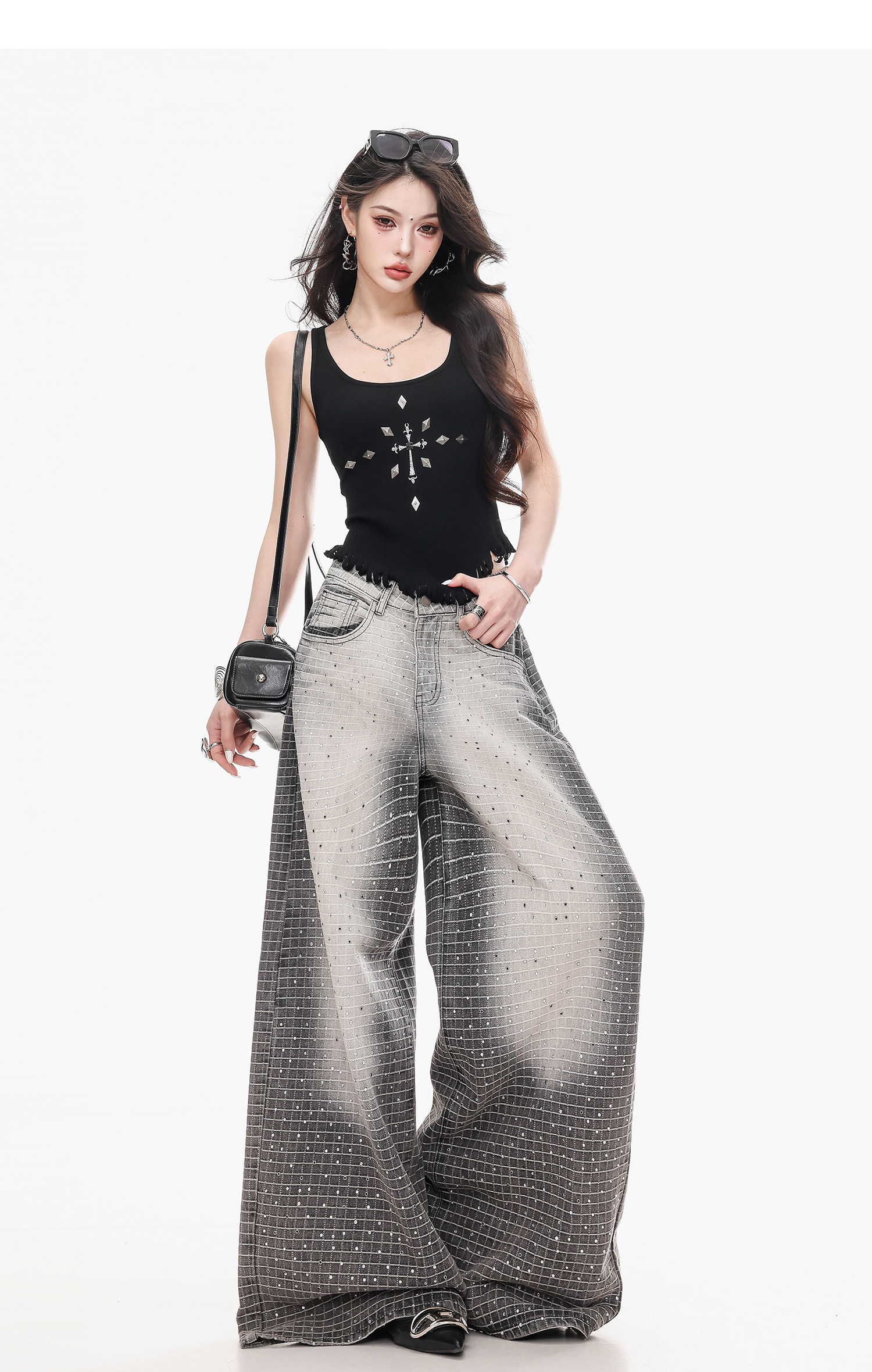 Abwlr Original Retro Plaid Rhinestone Wide-Leg Jeans for Women, Spring and Autumn Design, Loose Floor-Length Straight Pants