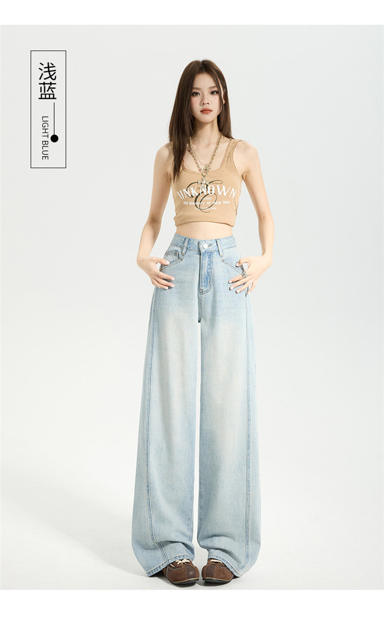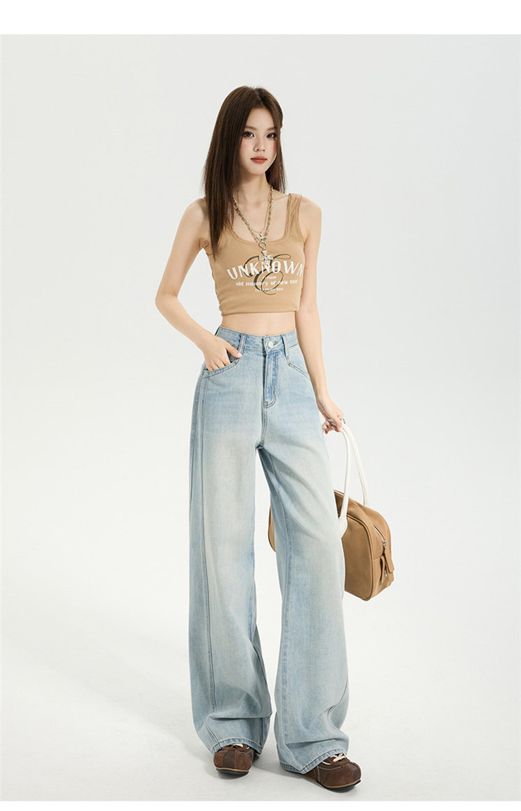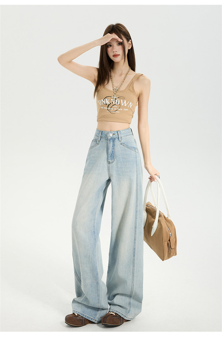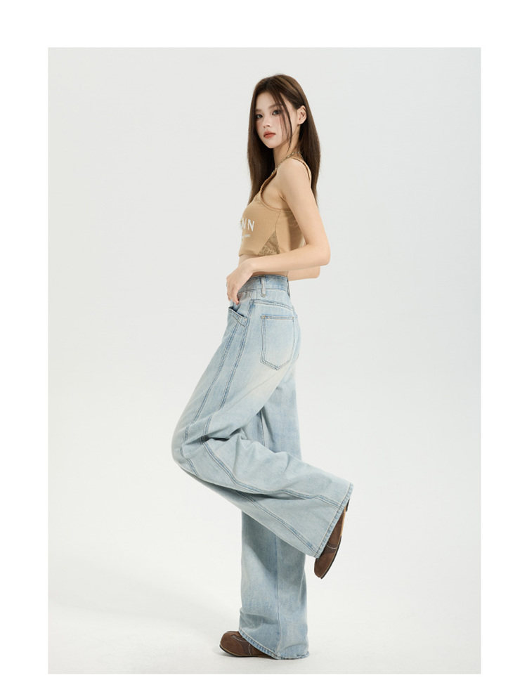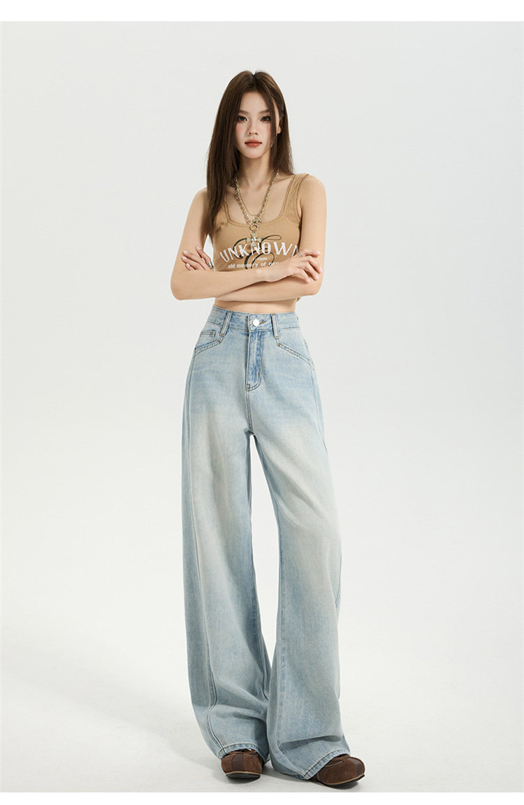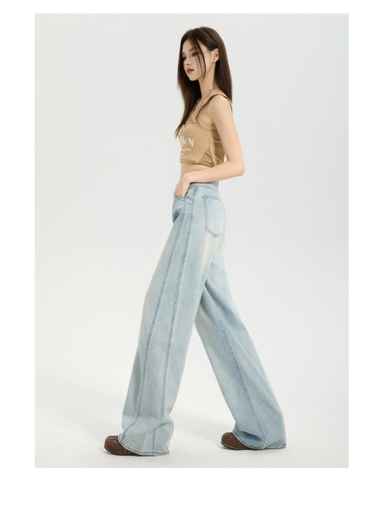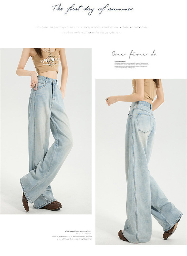 American Retro Style High-Waisted Wide-Leg Jeans for Women, Spring Season, Loose Fit, Slimming Light-Colored Straight-Leg Pants, Height-Enhancing Floor-Length Pants