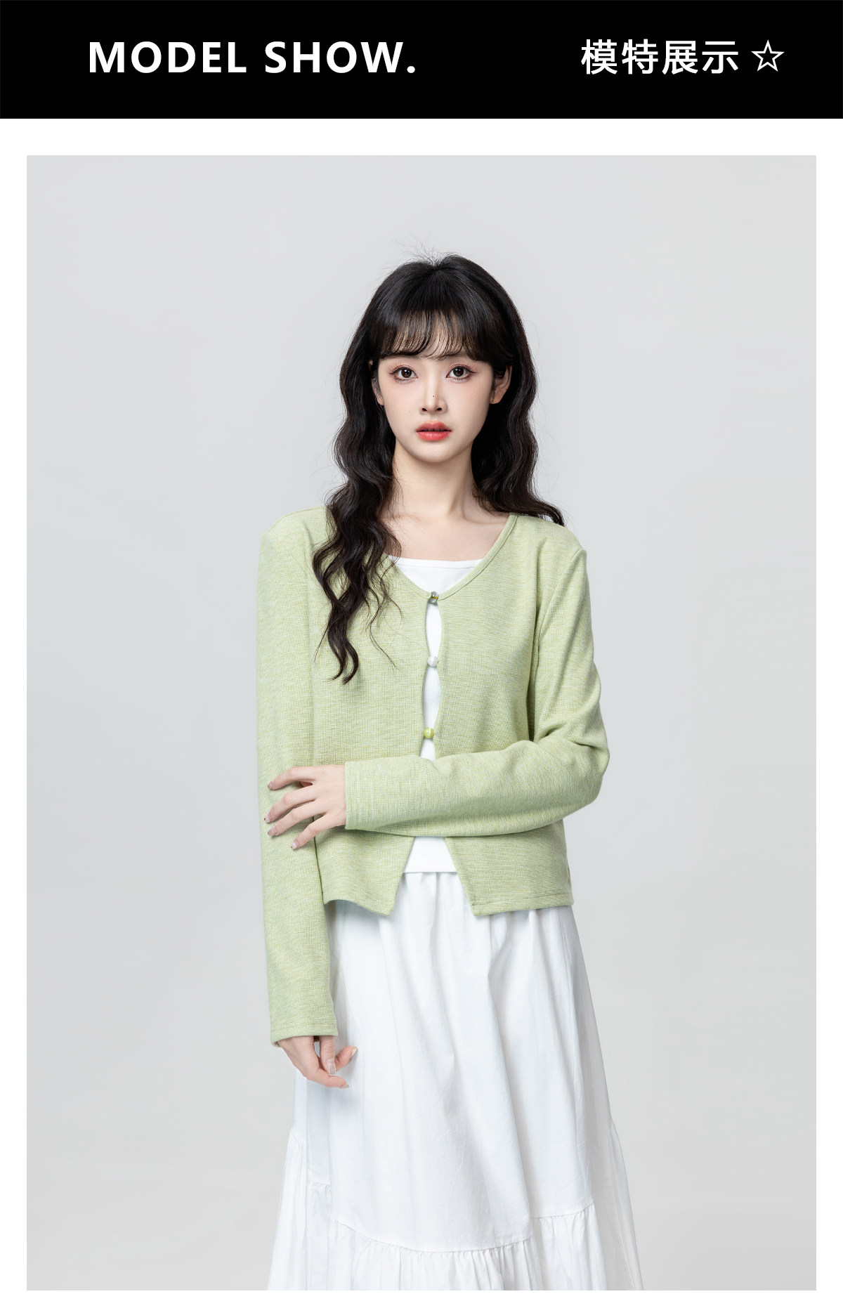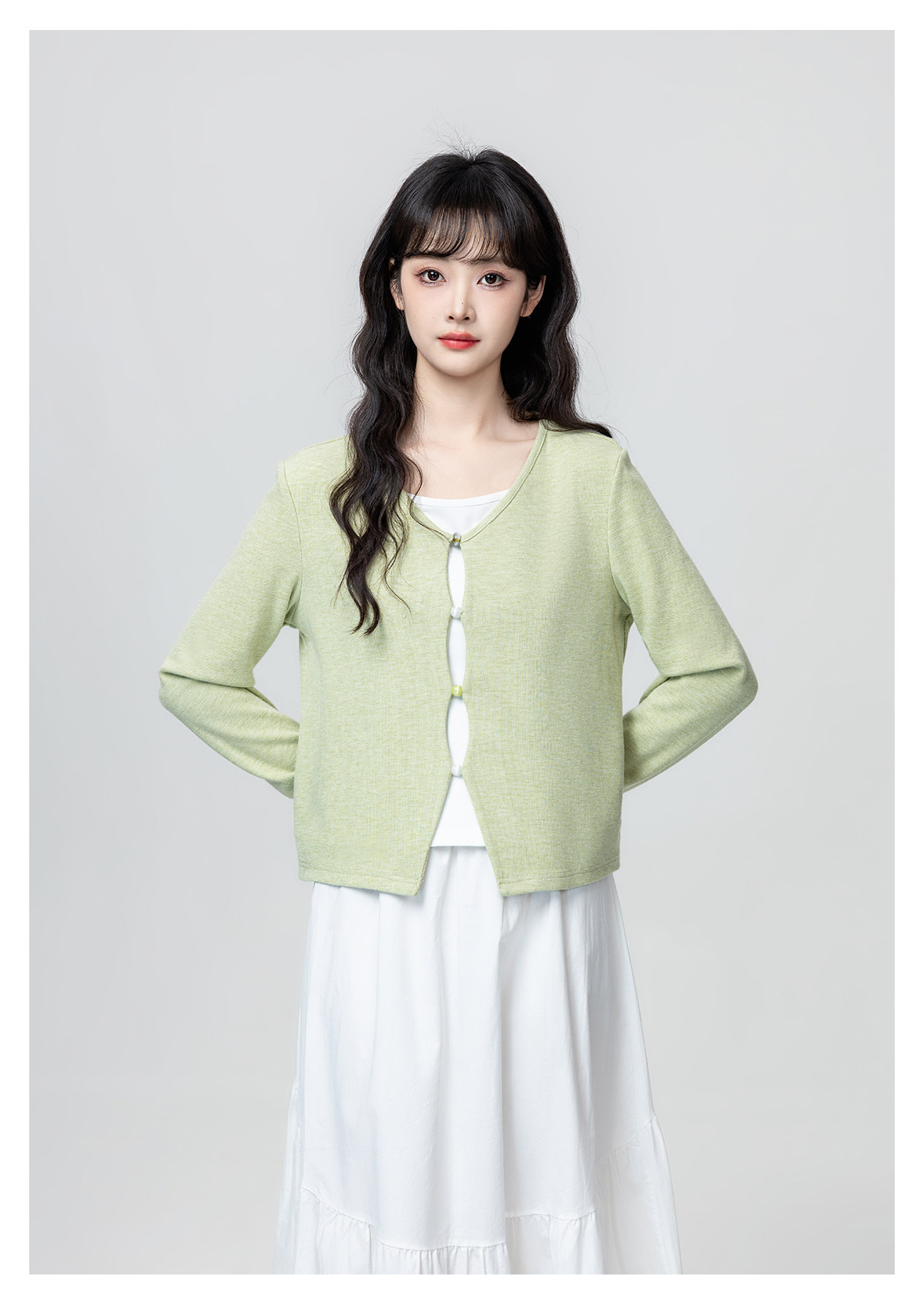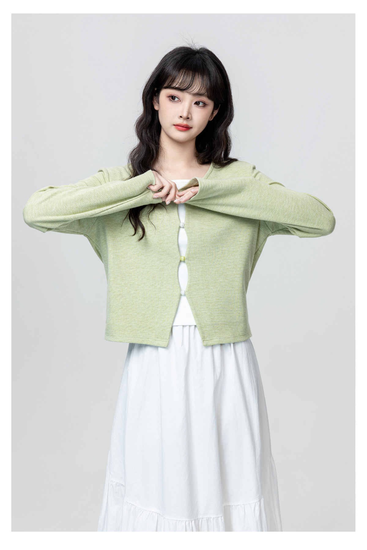 Green Fake Two-Piece Long-Sleeve T-Shirt for Women, Spring and Autumn 2026 New Style, Irregular V-Neck, Can Be Worn Inside or Outside, Short Top