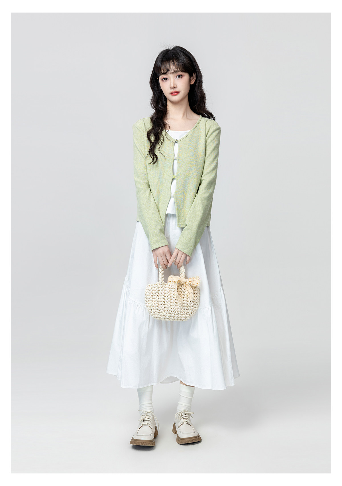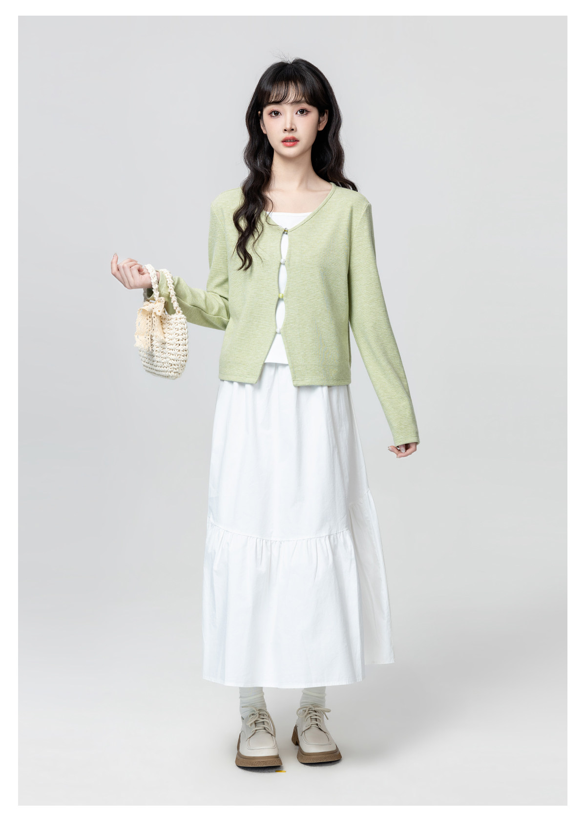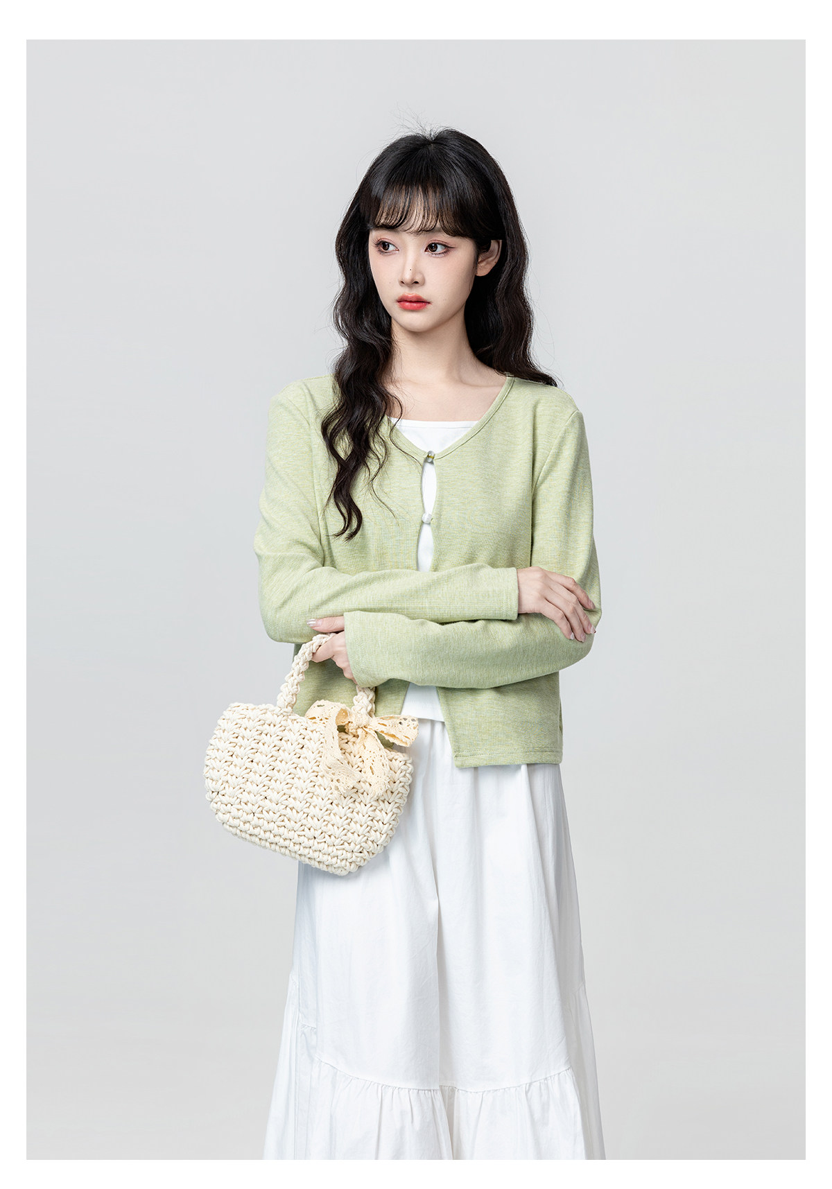 Green Fake Two-Piece Long-Sleeve T-Shirt for Women, Spring and Autumn 2026 New Style, Irregular V-Neck, Can Be Worn Inside or Outside, Short Top