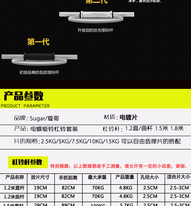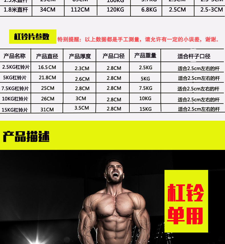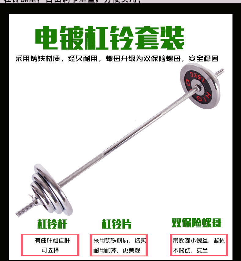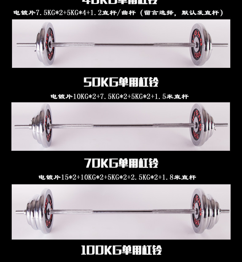 Sort by color The total weight of the bar and plates is 15kg ,The total weight of the bar and plates is 20kg ,The total weight of the bar and plates is 30kg ,The total weight of the bar and plates is 40 kg ,The total weight of the bar and plates is 50kg ,The total weight of the bar and plates is 60kg ,The total weight of the bar and plates is 70kg ,The total weight of the bar and plates is 80 kg ,The total weight of the bar and plates is 100kg ,Total weight of bar and plate: 20kg dual-purpose model,Total weight of bar and plate: 25kg dual-purpose model,Total weight of bar and plate: 30kg dual-purpose model,Total weight of bar and plate: 40kg dual-purpose model,Total weight of bar and plate: 50kg dual-purpose model,Total weight of bar and plate: 60kg dual-purpose model,Total weight of bar and plate: 70kg dual-purpose model,Total weight of bar and plate: 80kg dual-purpose model,Total weight of bar and plate: 100kg dual-purpose model