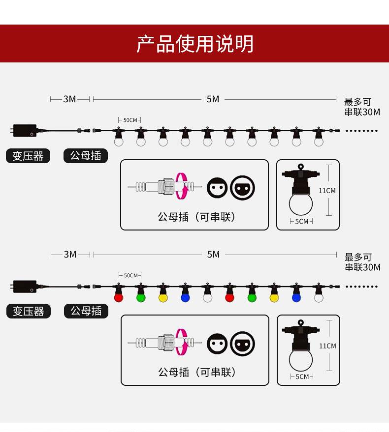 Length 5 meters 10 lights,10 meters 20 lights,20 meters 40 lights,30m 60 lights,50 meters 100 lights