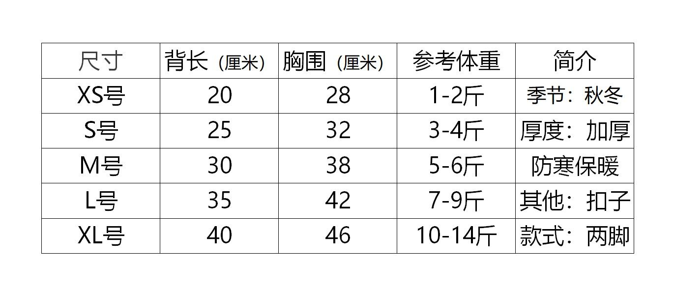 Size XS Back Length 20cm (Recommended 0.5-1.0kg),S Back Length 25cm (Recommended 1.5-2kg),M Back Length 30cm (Recommended 2.5-3kg),L Back Length 35cm (Recommended 3.5-4.5kg),XL Back Length 40cm (Recommended 5-7kg)
