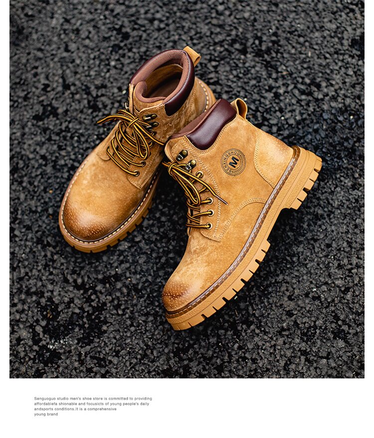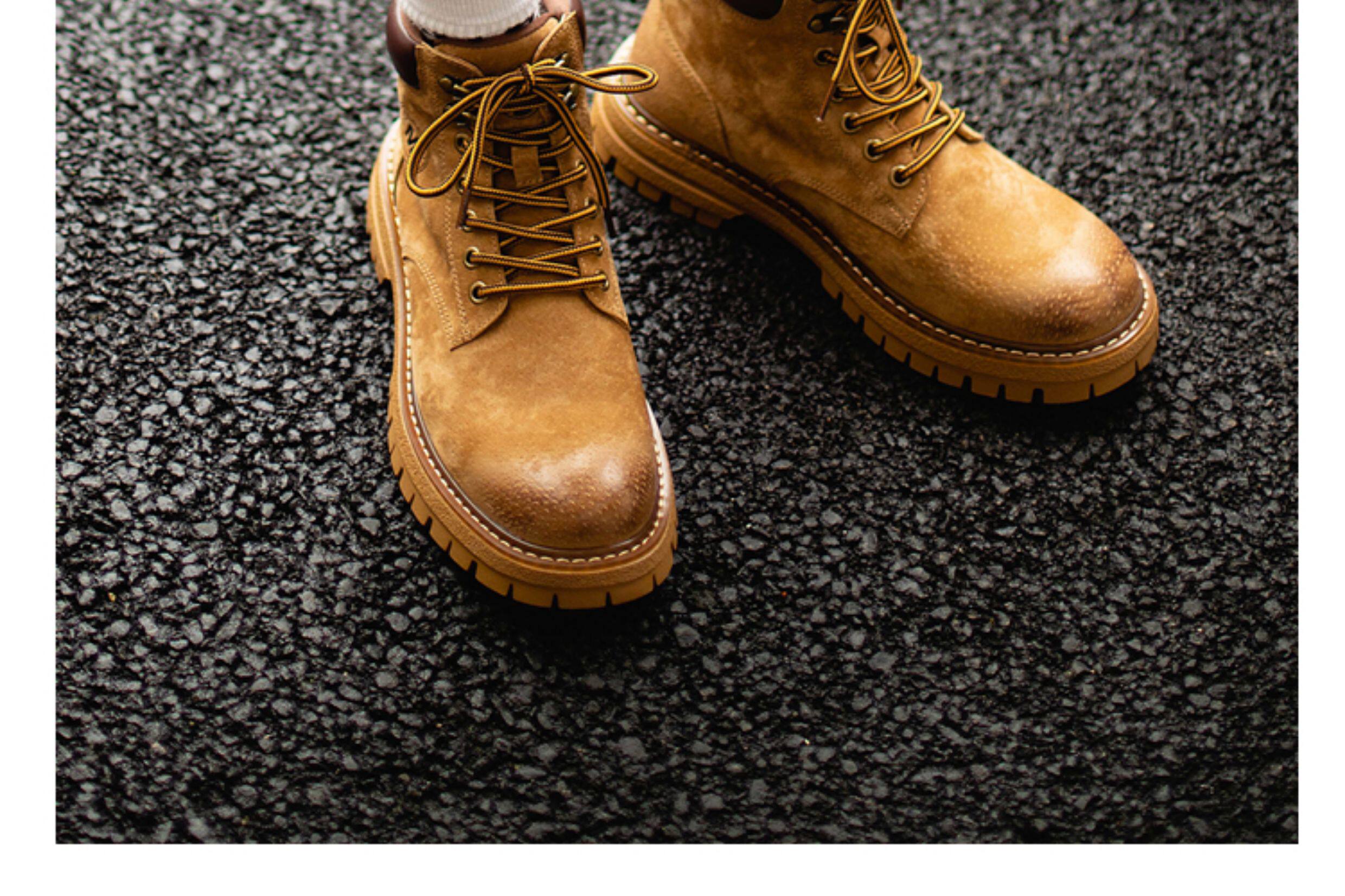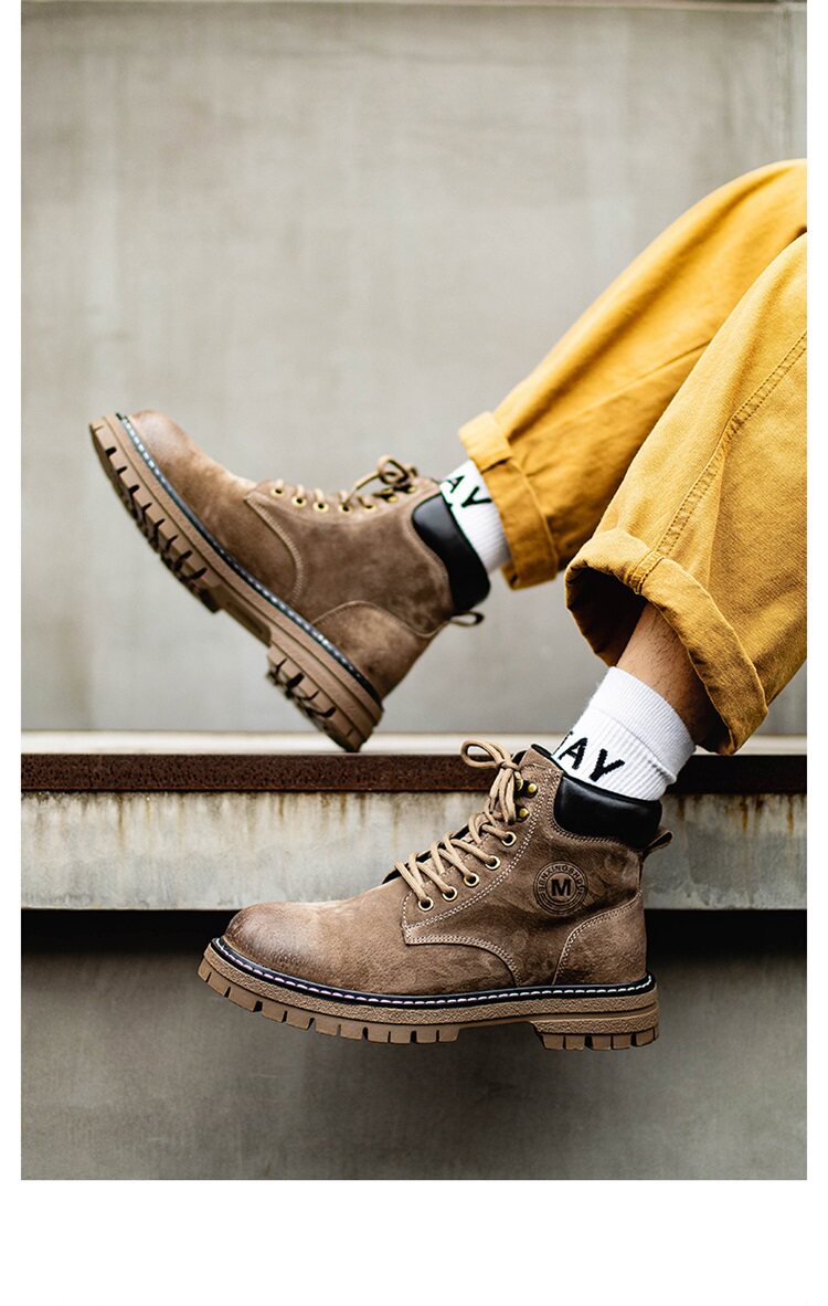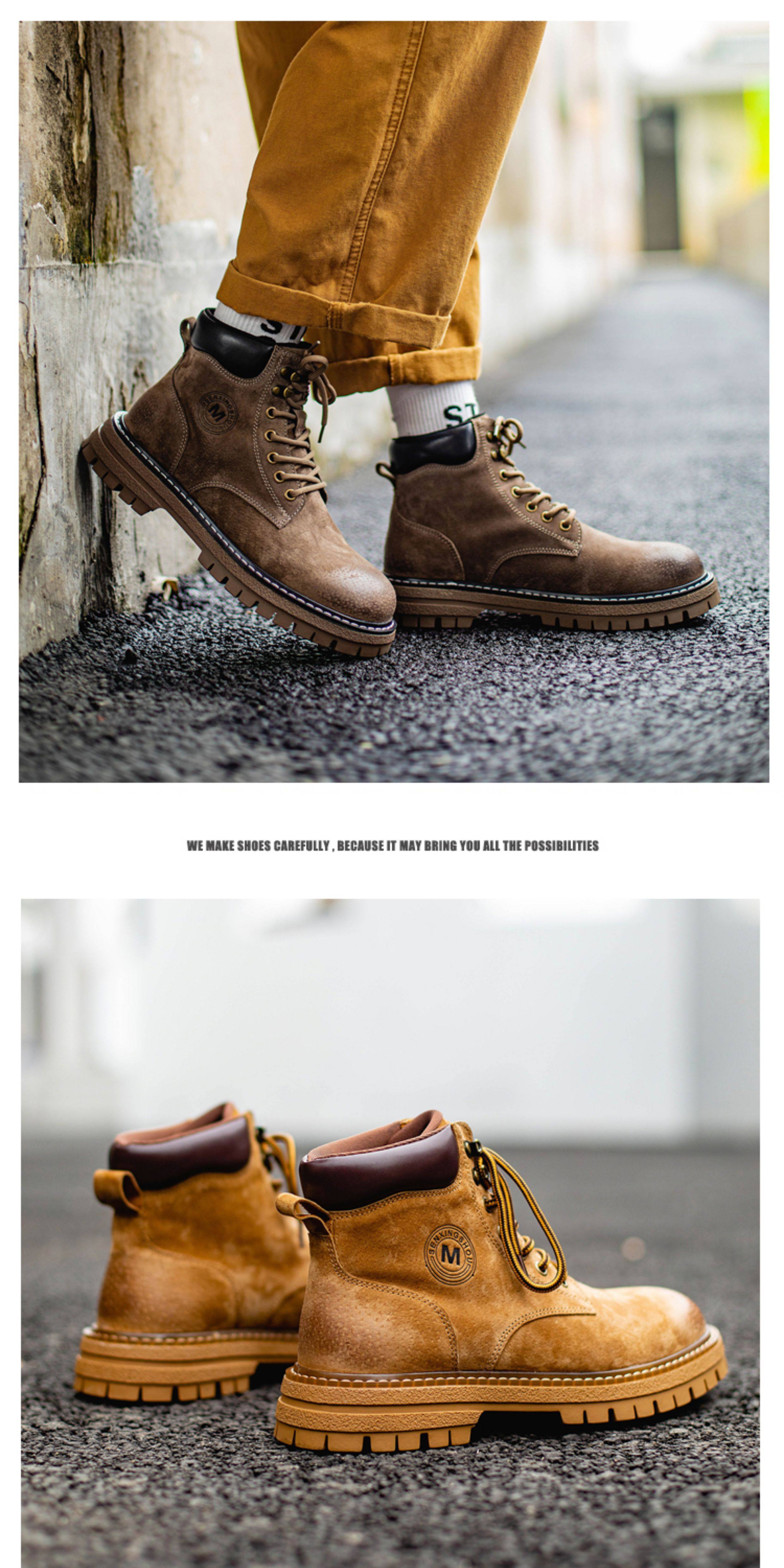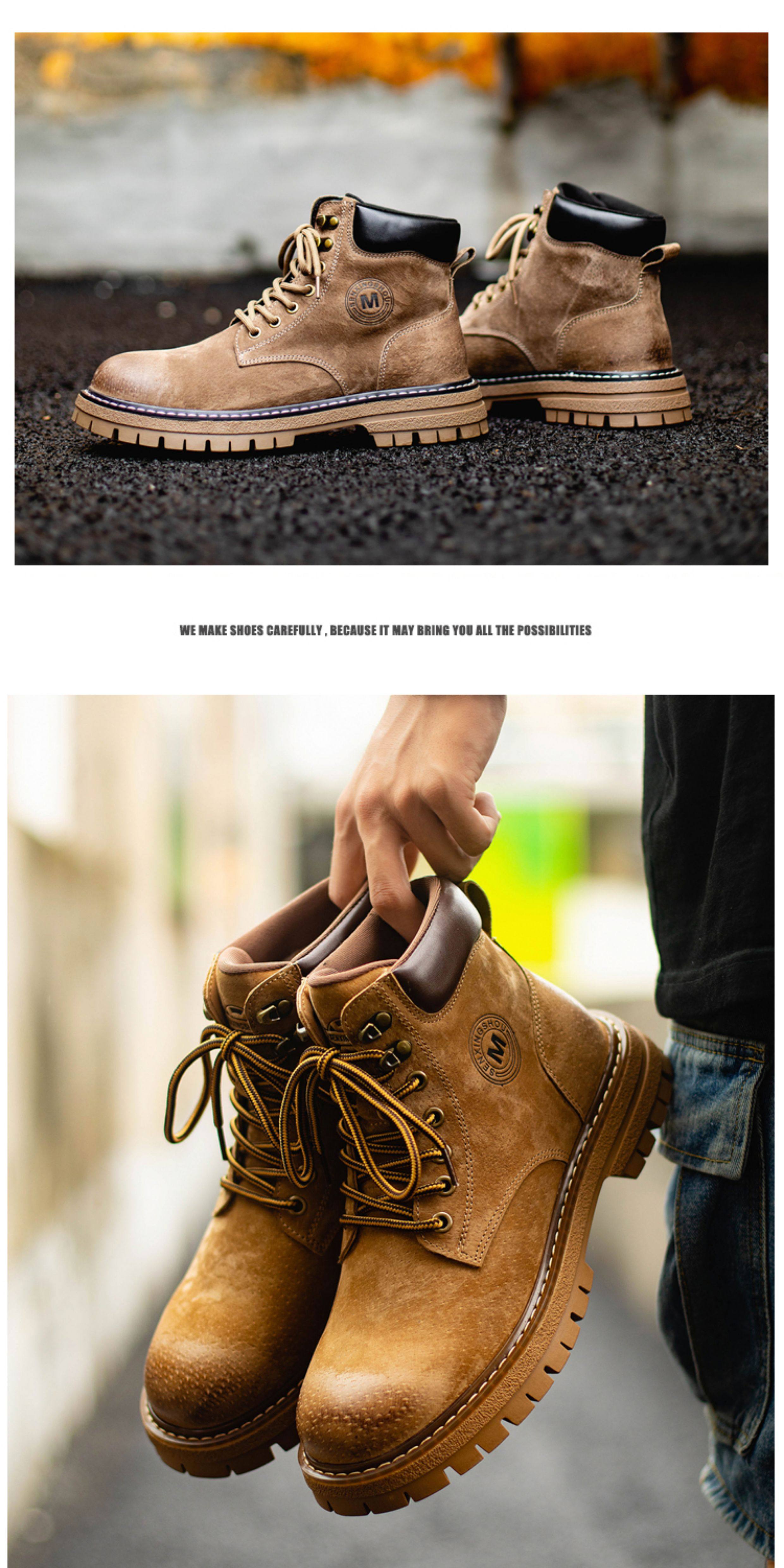 Martin Boots for Men, Winter High-Top, Fleece-Lined, British Style, Genuine Leather, Yellow Boots, Retro Casual Trendy Mid-Top Work Boots