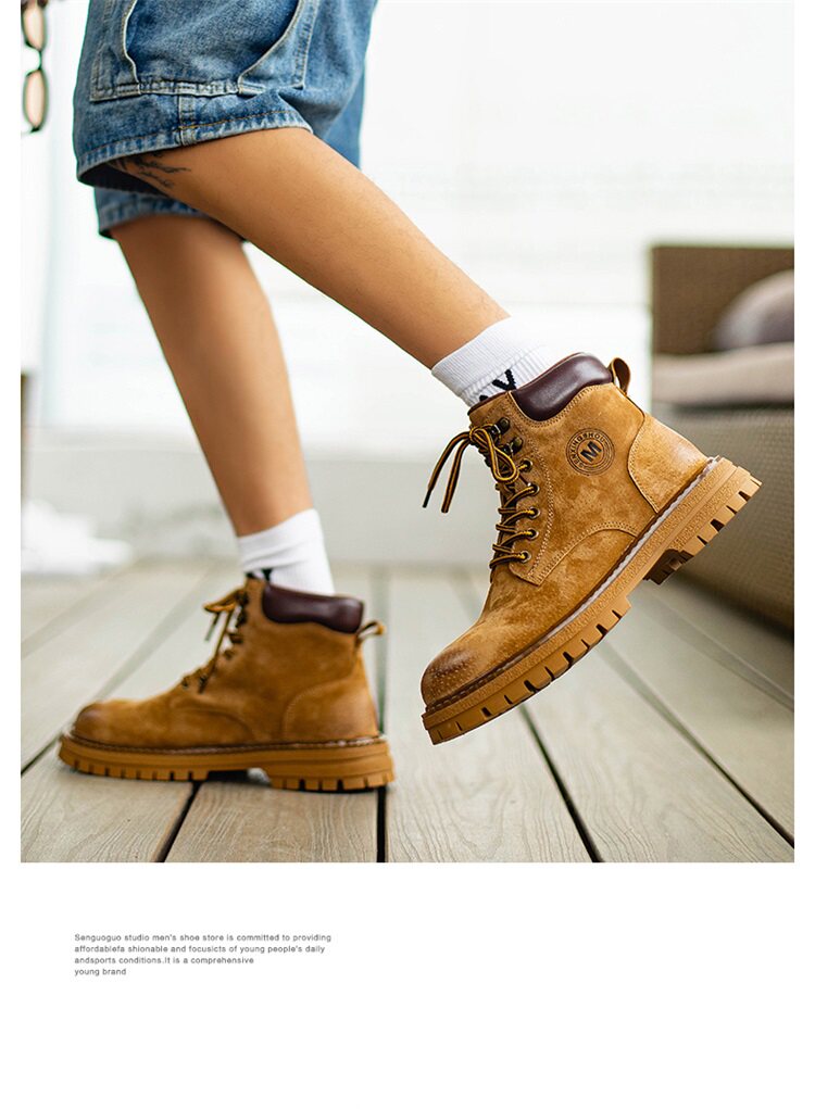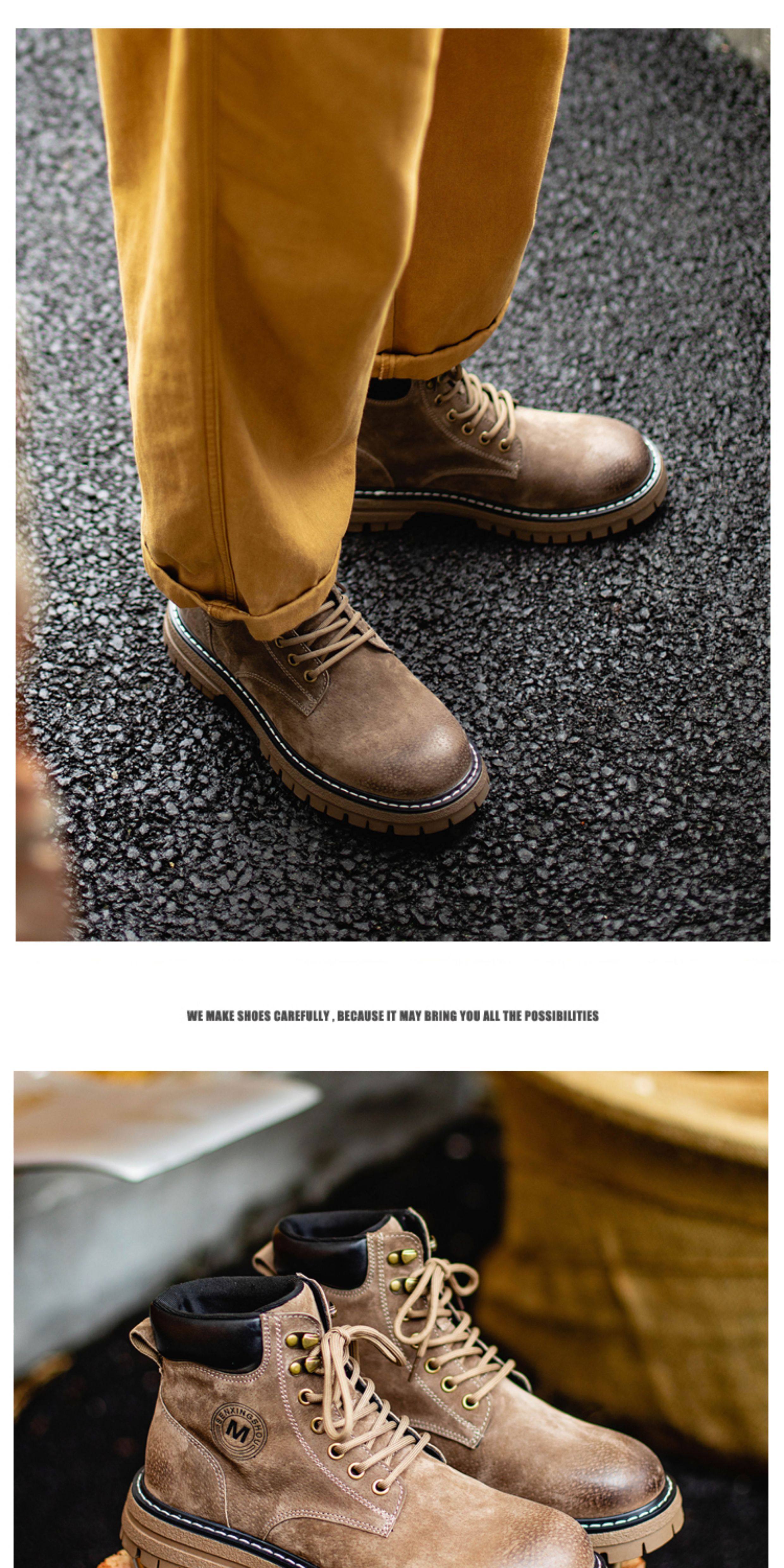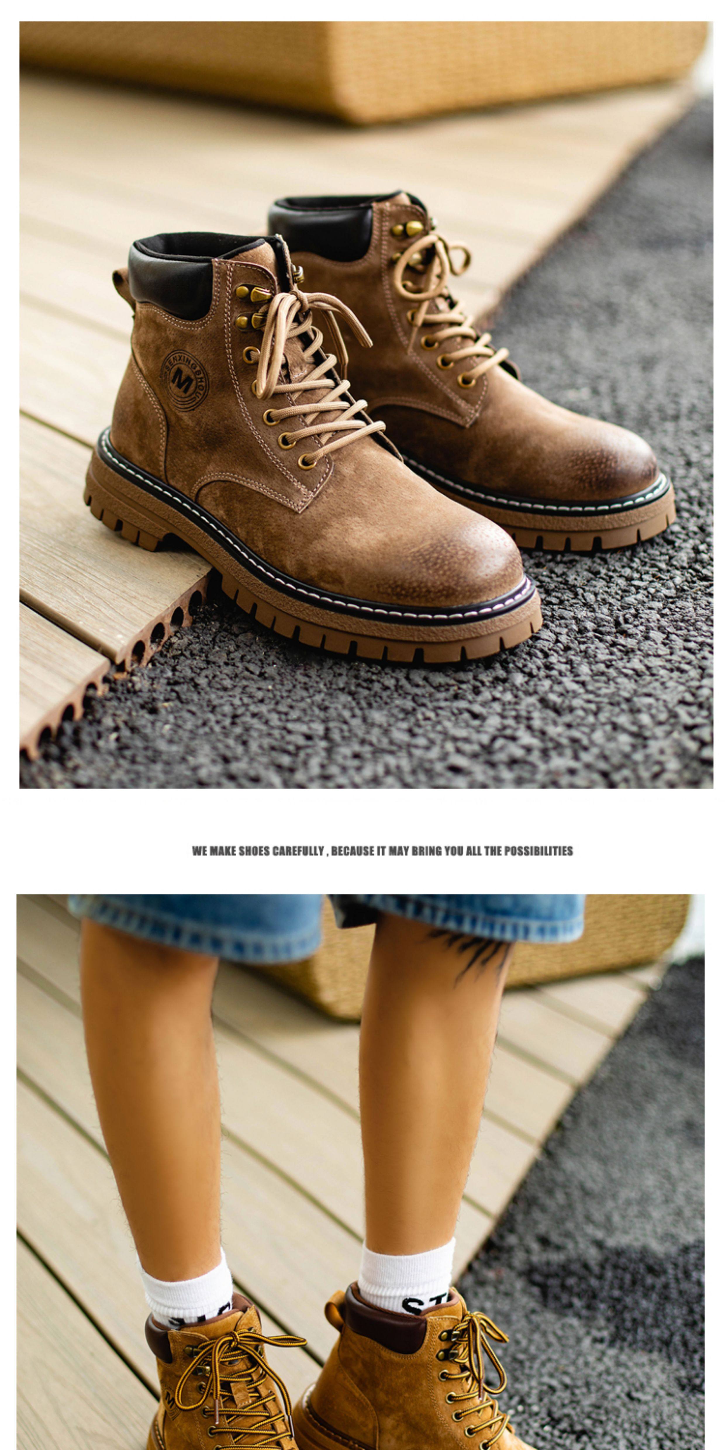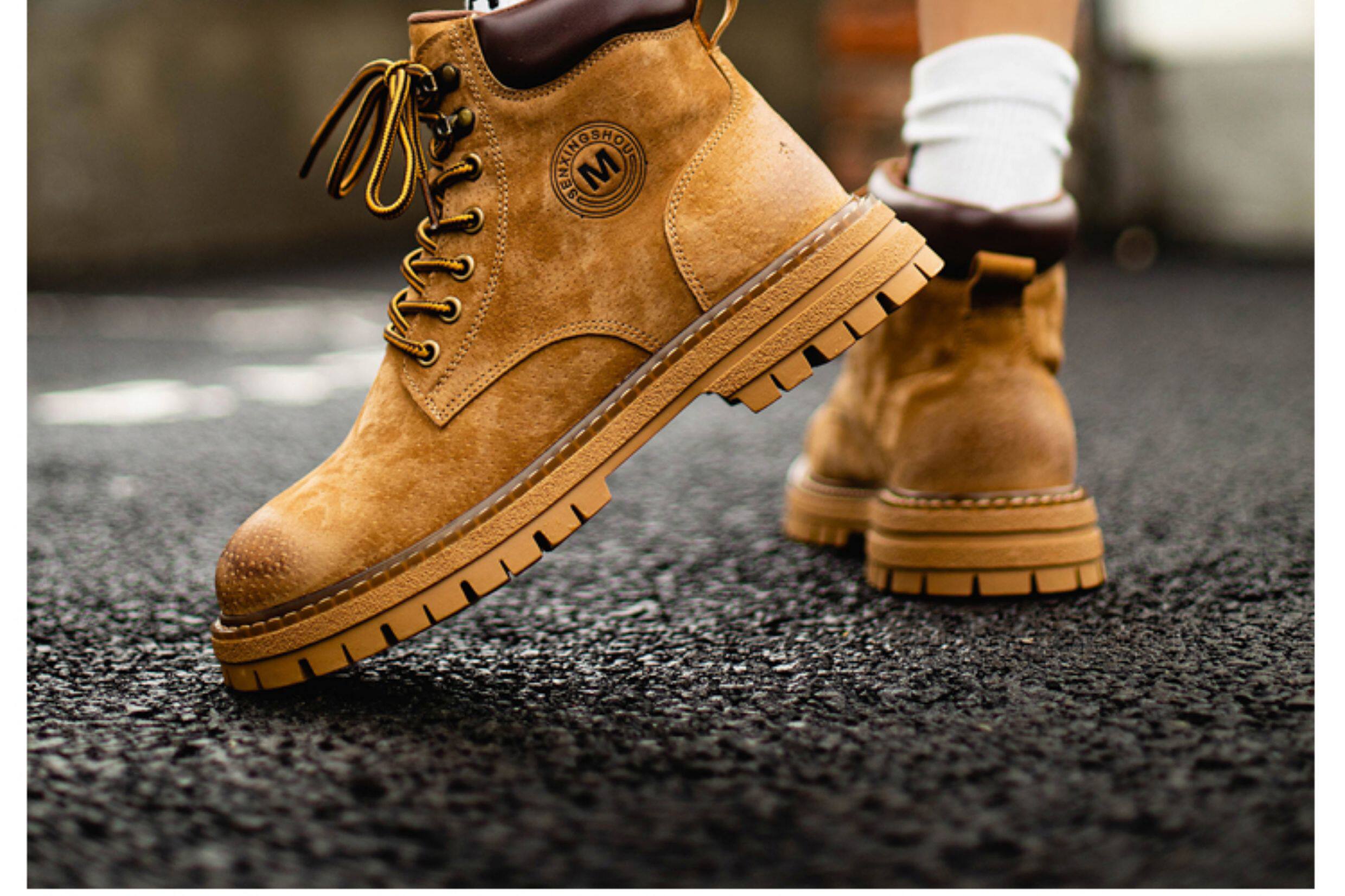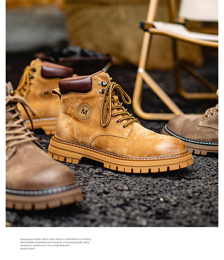 Martin Boots for Men, Winter High-Top, Fleece-Lined, British Style, Genuine Leather, Yellow Boots, Retro Casual Trendy Mid-Top Work Boots