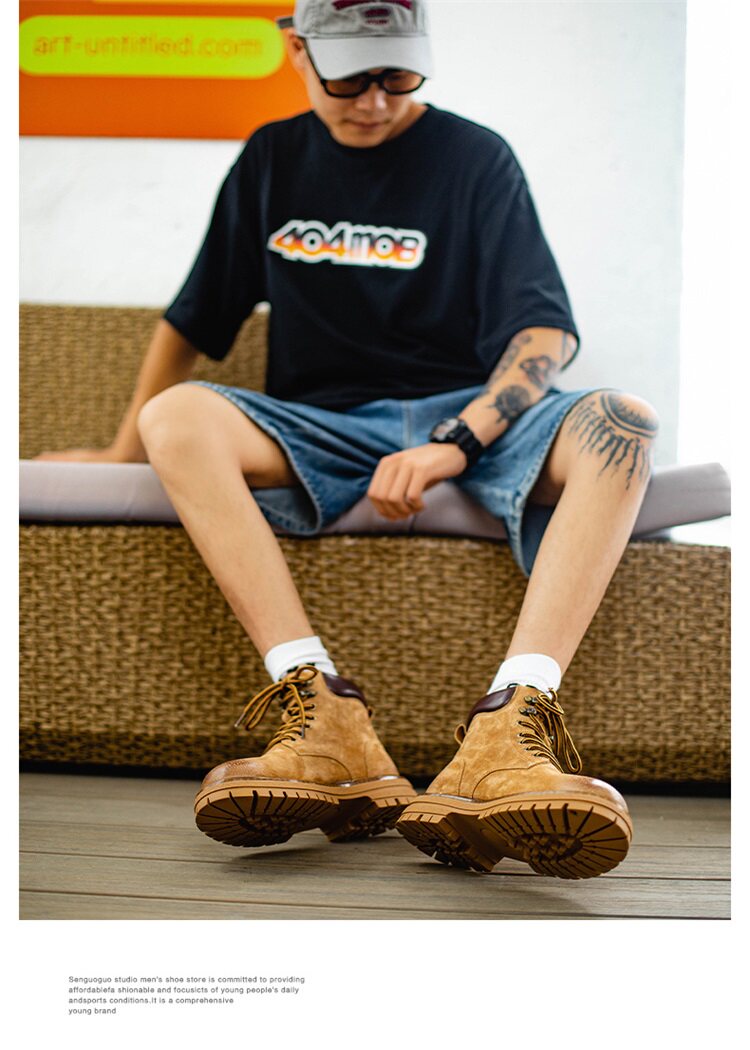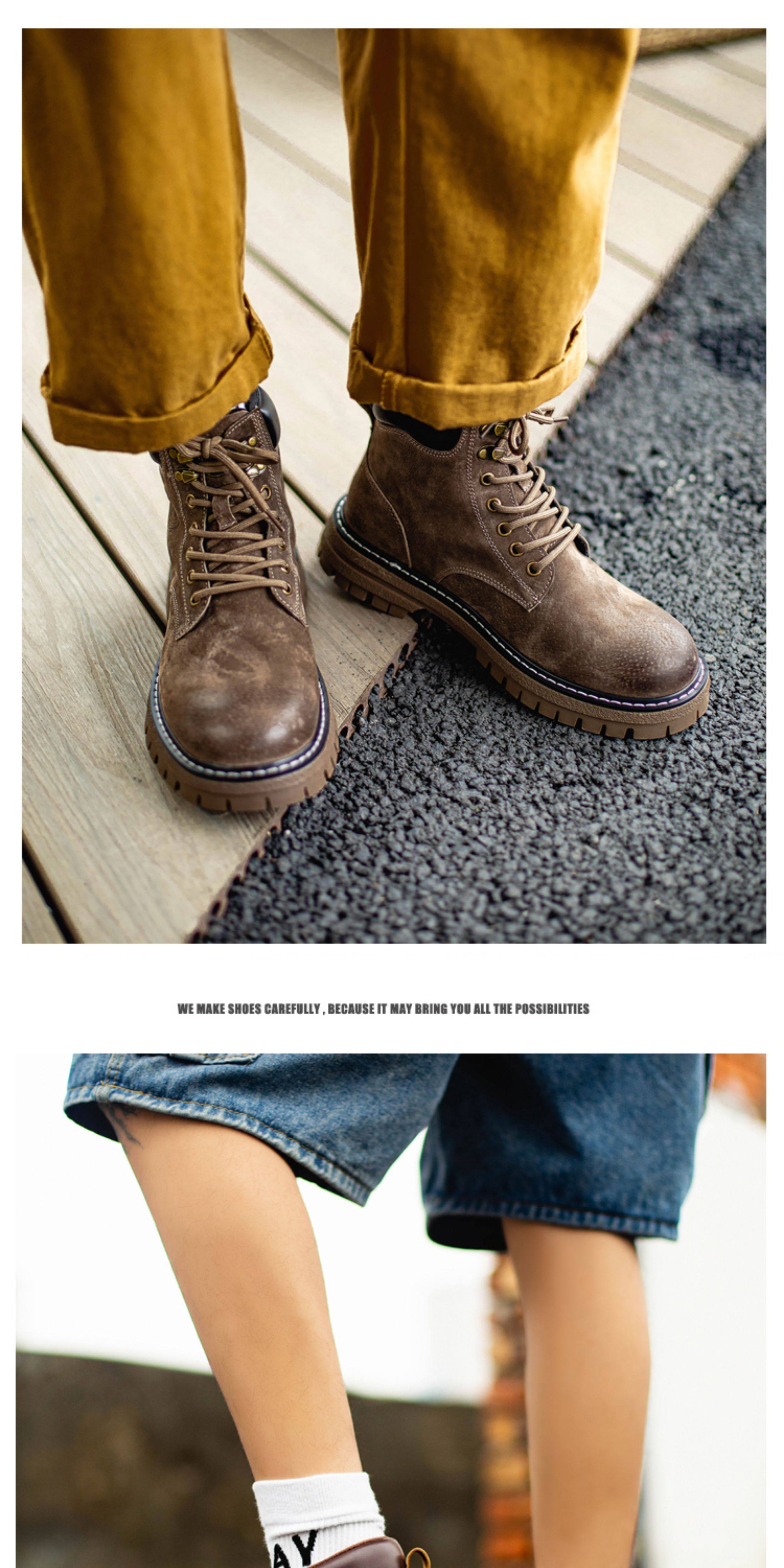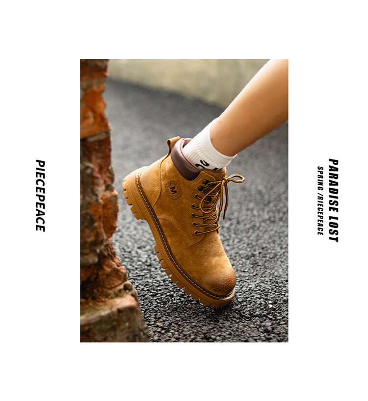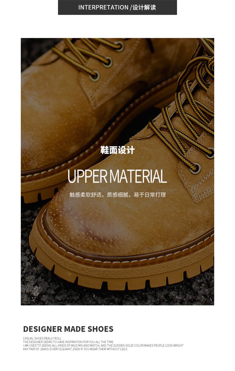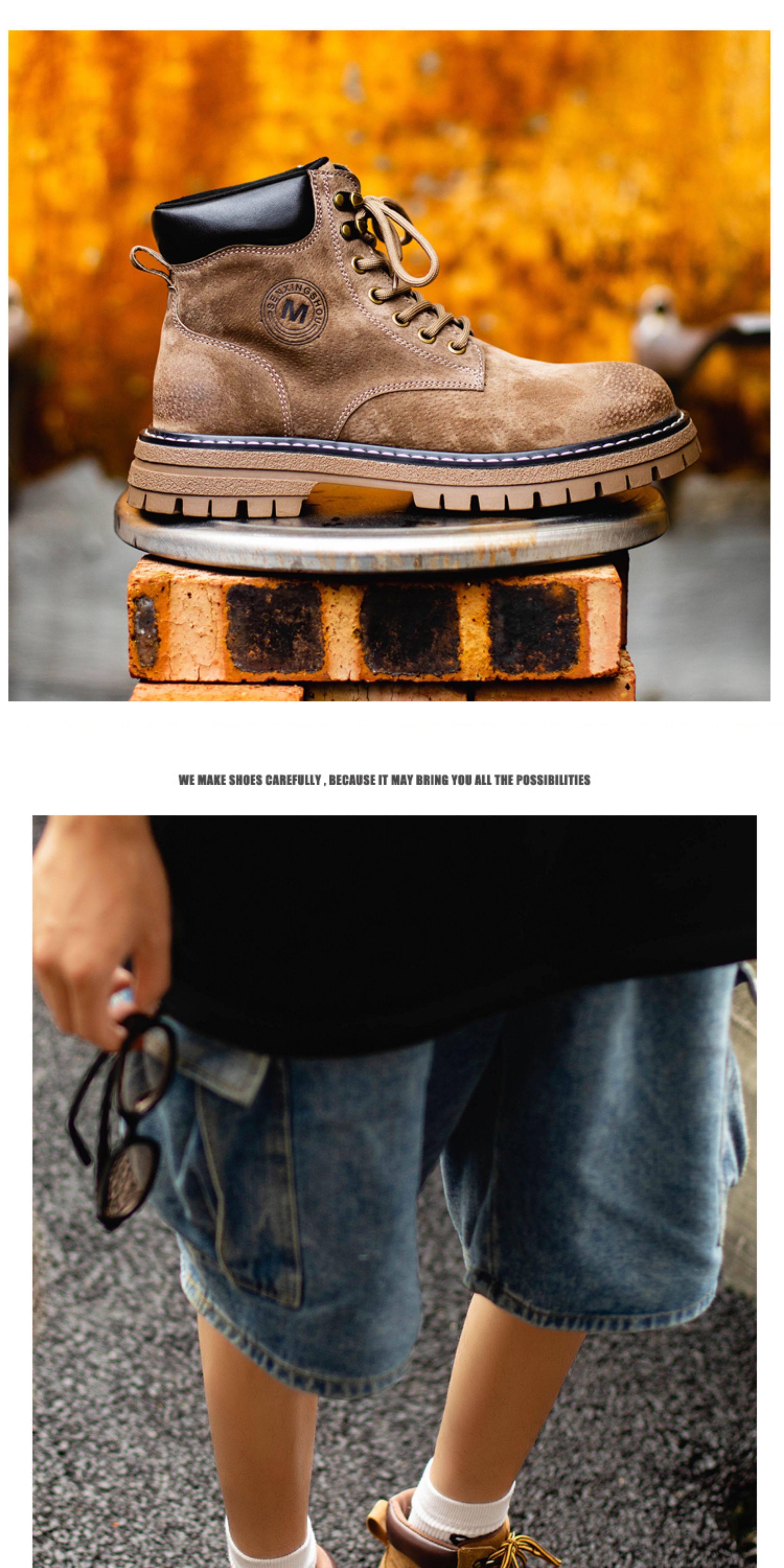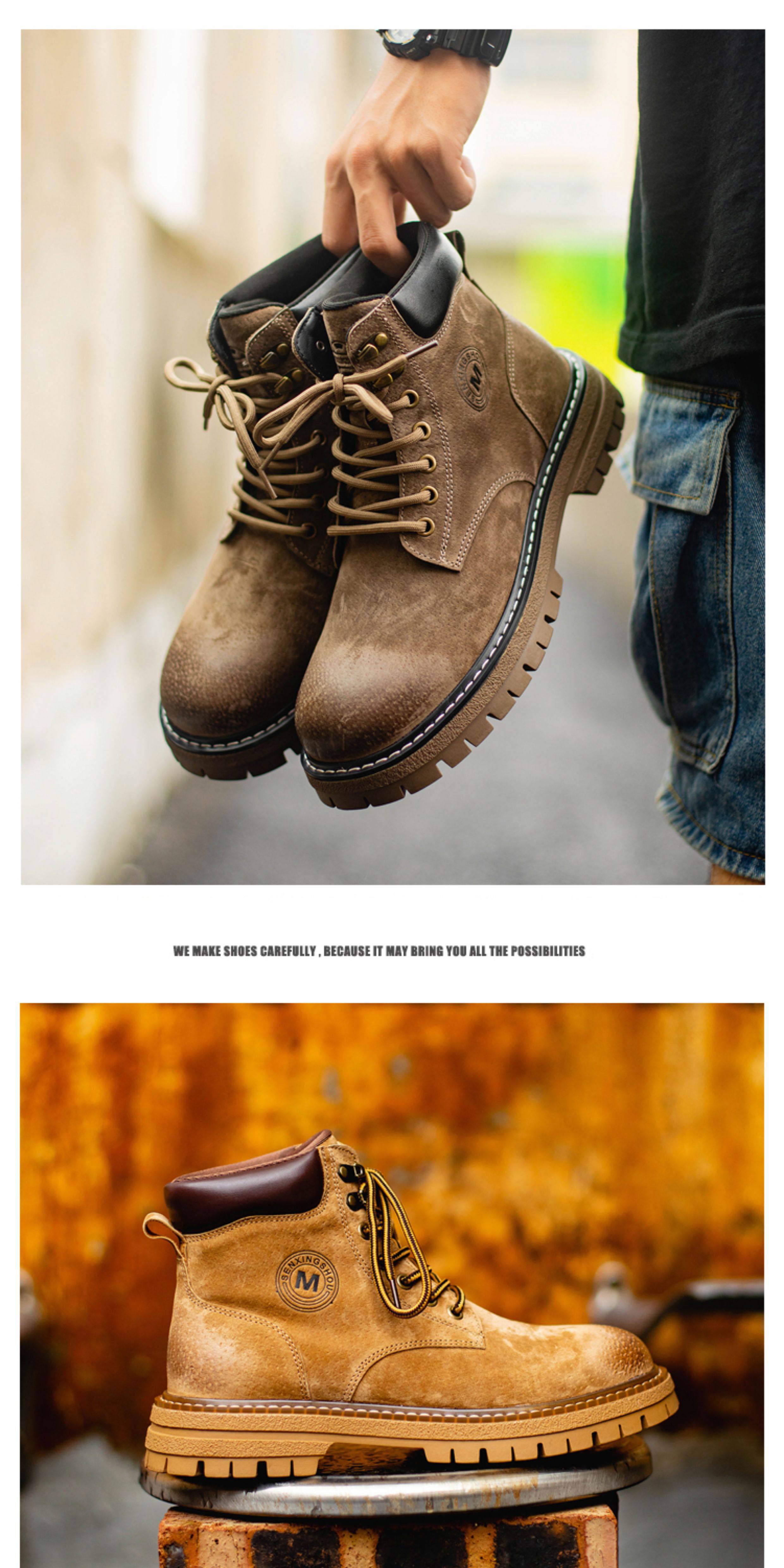 Martin Boots for Men, Winter High-Top, Fleece-Lined, British Style, Genuine Leather, Yellow Boots, Retro Casual Trendy Mid-Top Work Boots