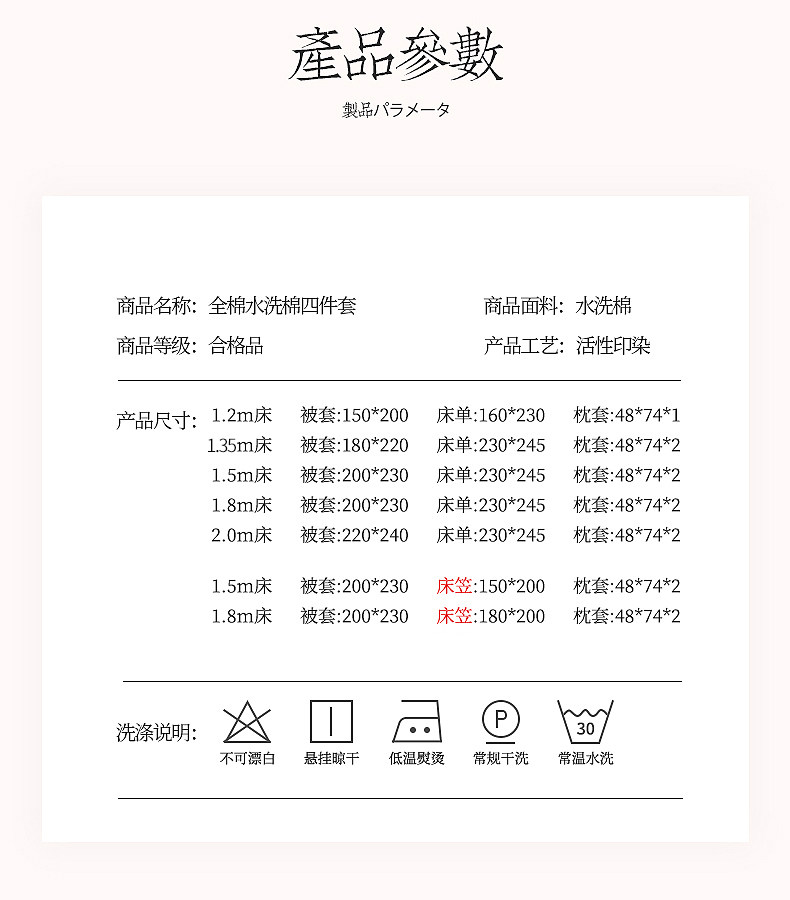 Applicable bed size 1.2m bed bed sheet three-piece set (suitable for 150*200cm quilt core),1.35m bed bed sheet four-piece set (suitable for 180*220cm quilt core),1.5m bed bed sheet four-piece set (suitable for 200*230cm quilt core),1.8m bed, four-piece bed sheet set (suitable for 200*230cm quilt core).,2.0m bed bed sheet set of four (suitable for 220*240cm quilt core).,1.5m bed four-piece fitted sheet set (suitable for 200*230cm quilt core).,1.8m bed fitted sheet set of four (suitable for 200*230cm quilt core).