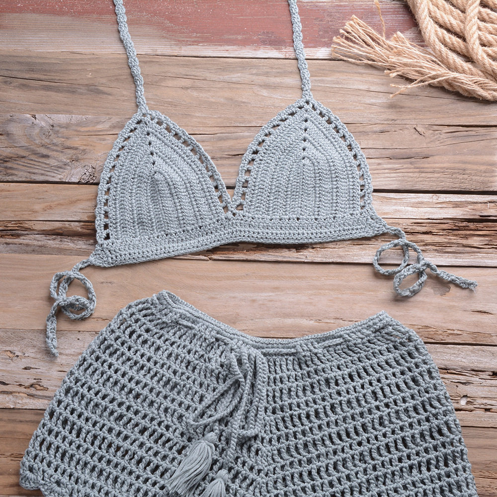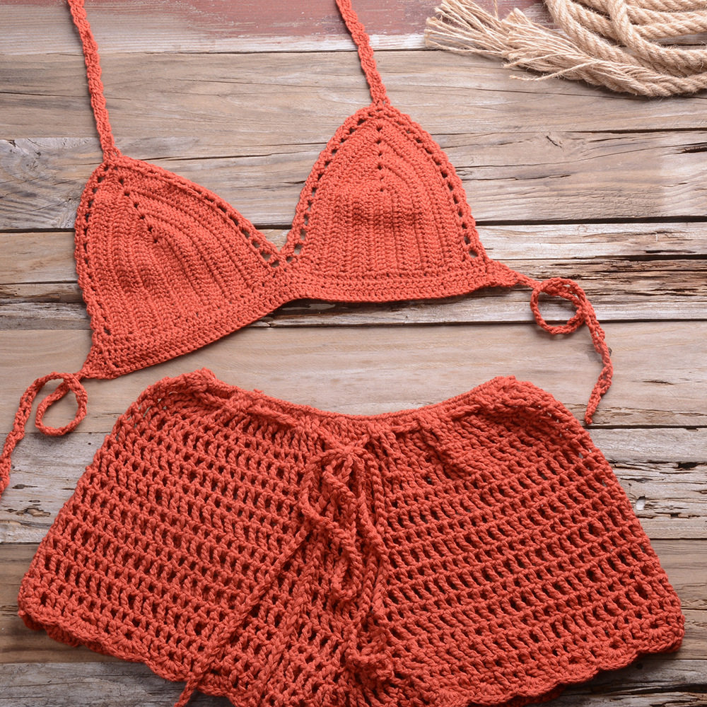 Beach Retro Style Popular Outfit for Women: Solid Color Sexy Hollow-Out Tie-Up Top and Hand-Woven Beach Boxer Shorts