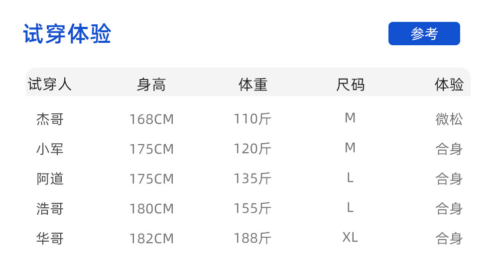 China (cm) 165 / 88-90 170 / 96-98 175 / 108-110 180 / 118-122 185 / 126-130