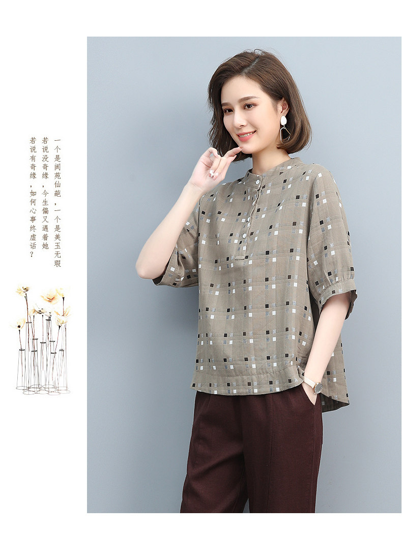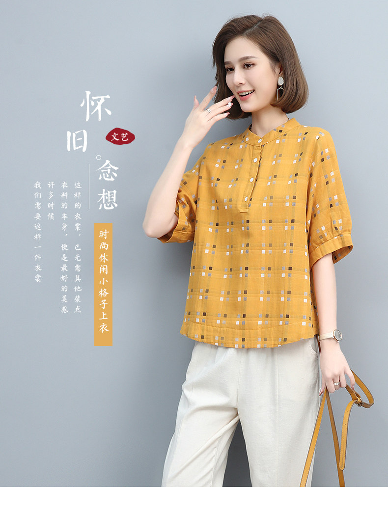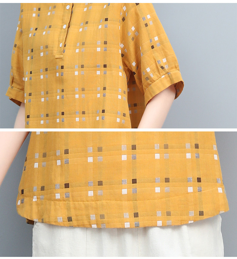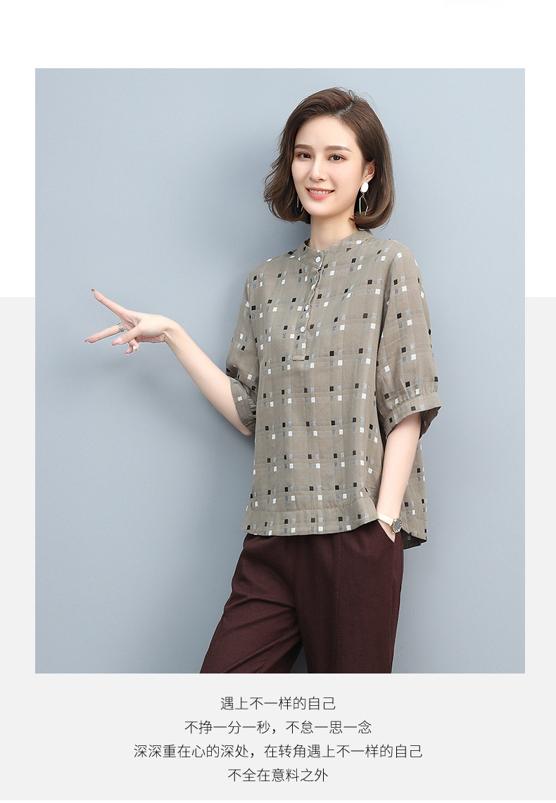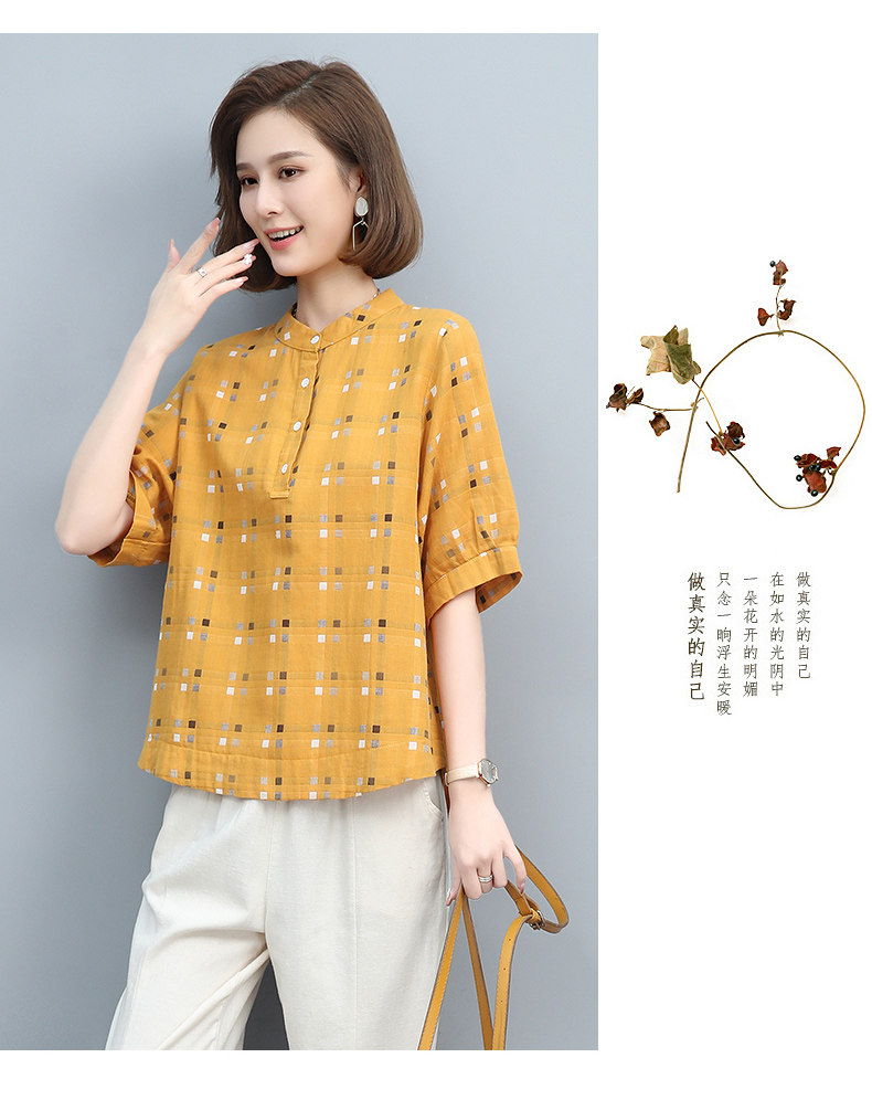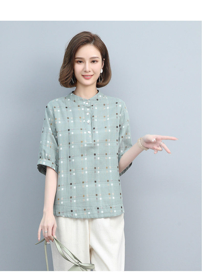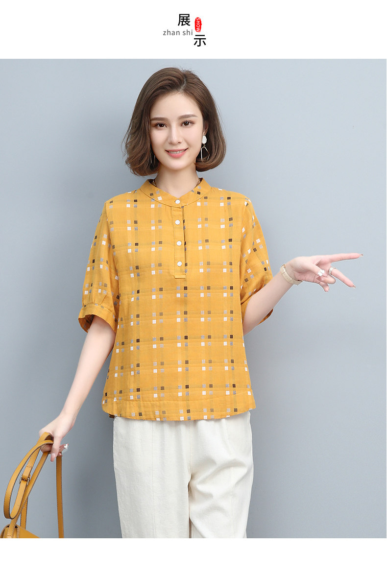 Plaid Shirt for Women, New Summer Style, Loose and Casual, Fashionable Stand-Up Collar Short-Sleeved T-Shirt for Middle-Aged Mothers, Summer Wear, Pure Cotton Top