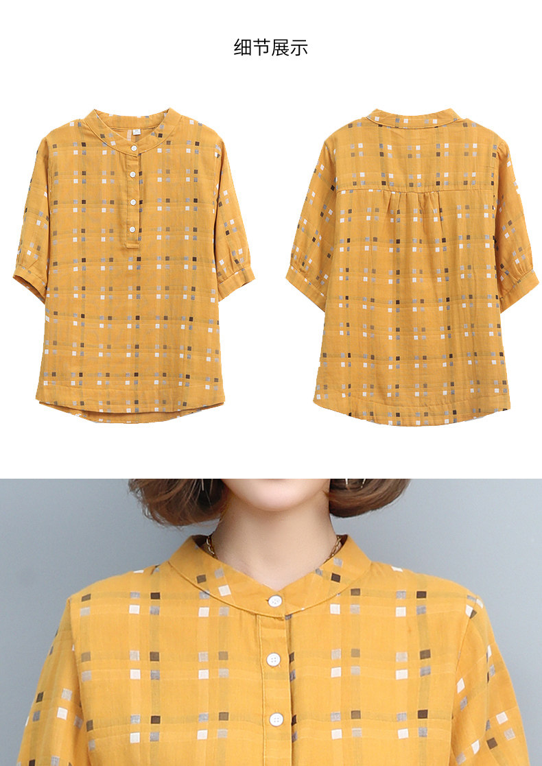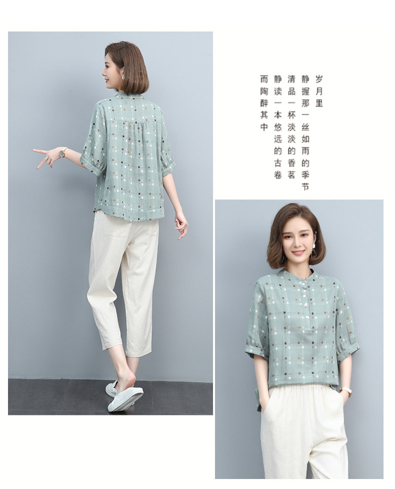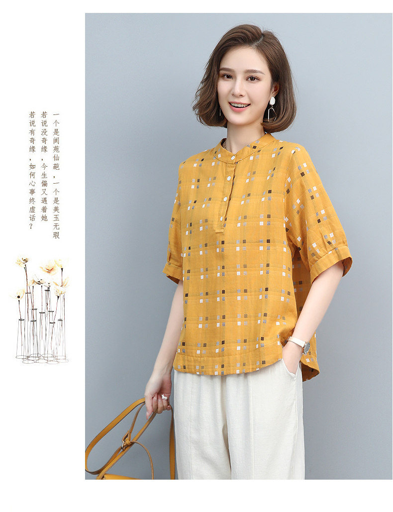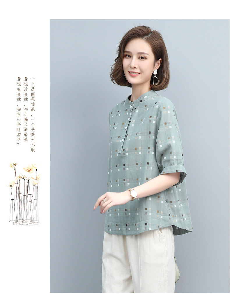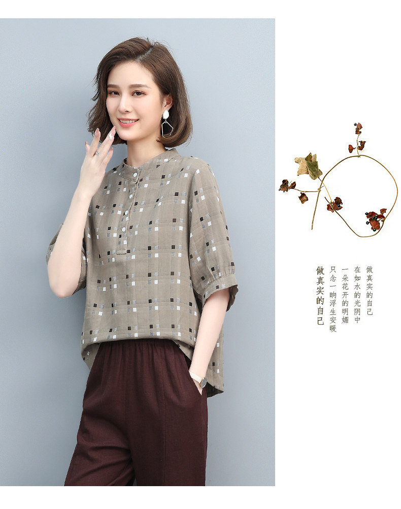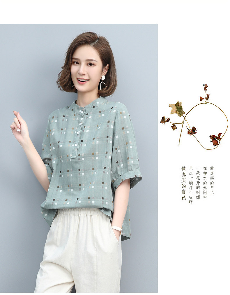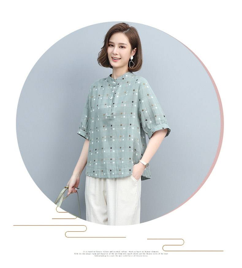 Plaid Shirt for Women, New Summer Style, Loose and Casual, Fashionable Stand-Up Collar Short-Sleeved T-Shirt for Middle-Aged Mothers, Summer Wear, Pure Cotton Top