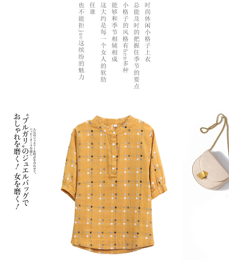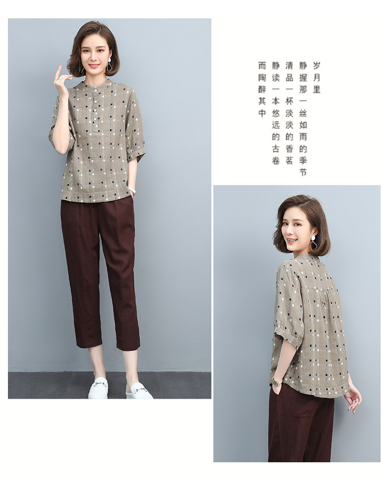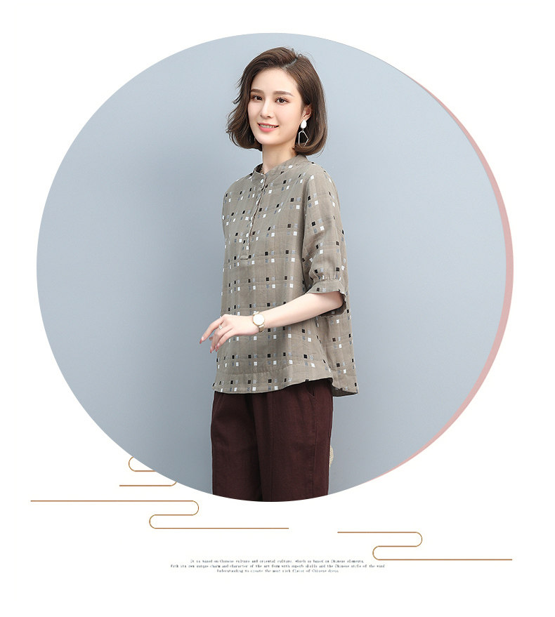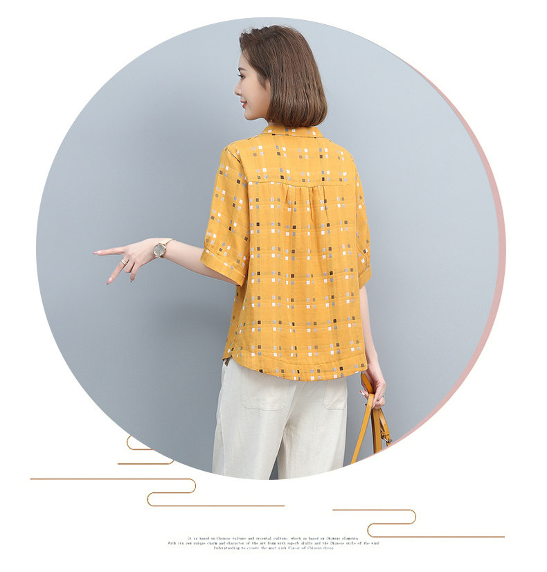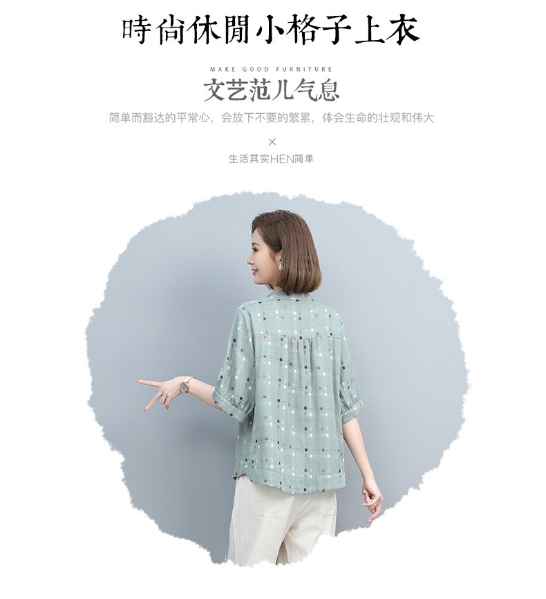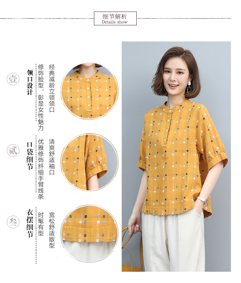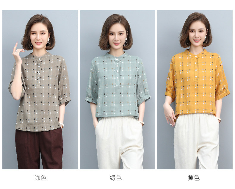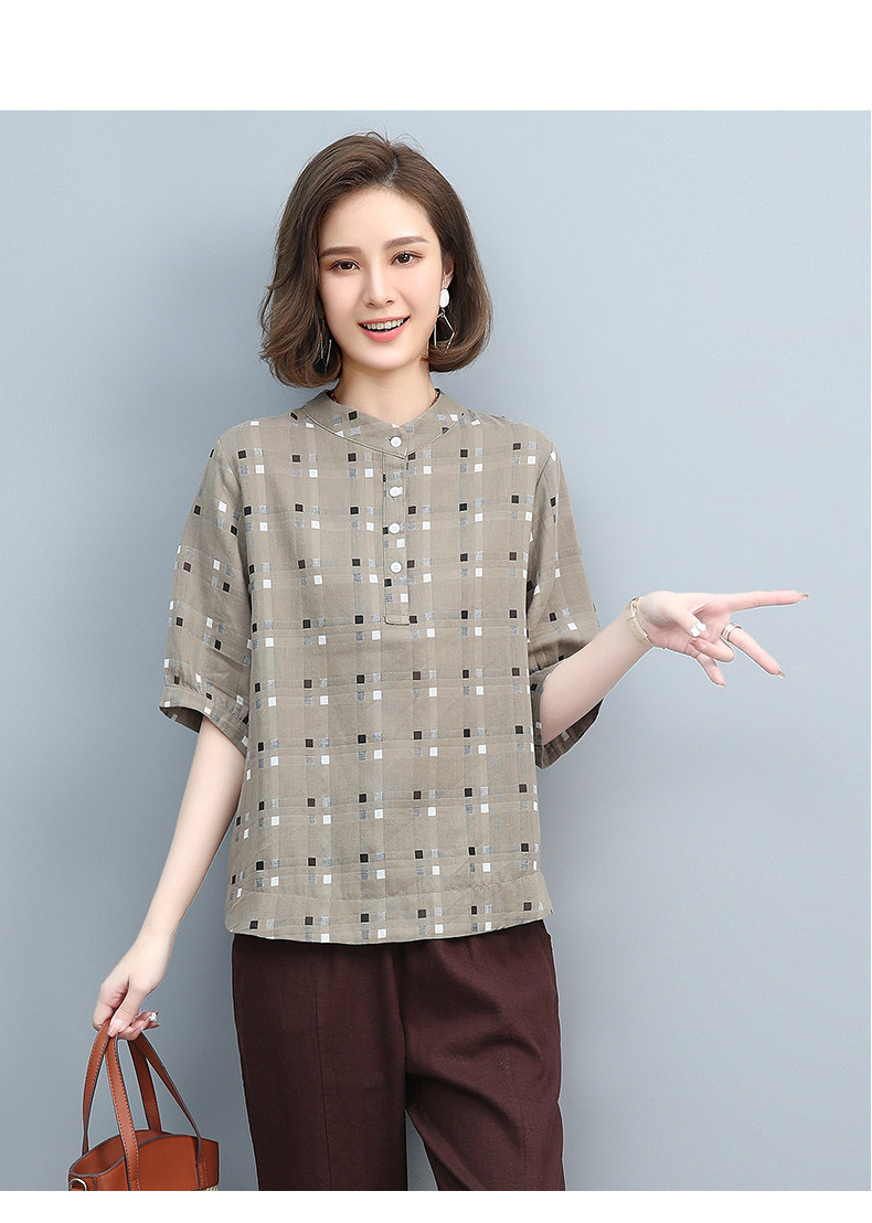 Plaid Shirt for Women, New Summer Style, Loose and Casual, Fashionable Stand-Up Collar Short-Sleeved T-Shirt for Middle-Aged Mothers, Summer Wear, Pure Cotton Top