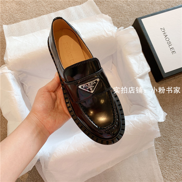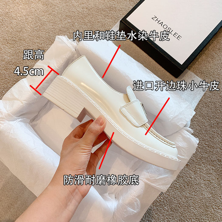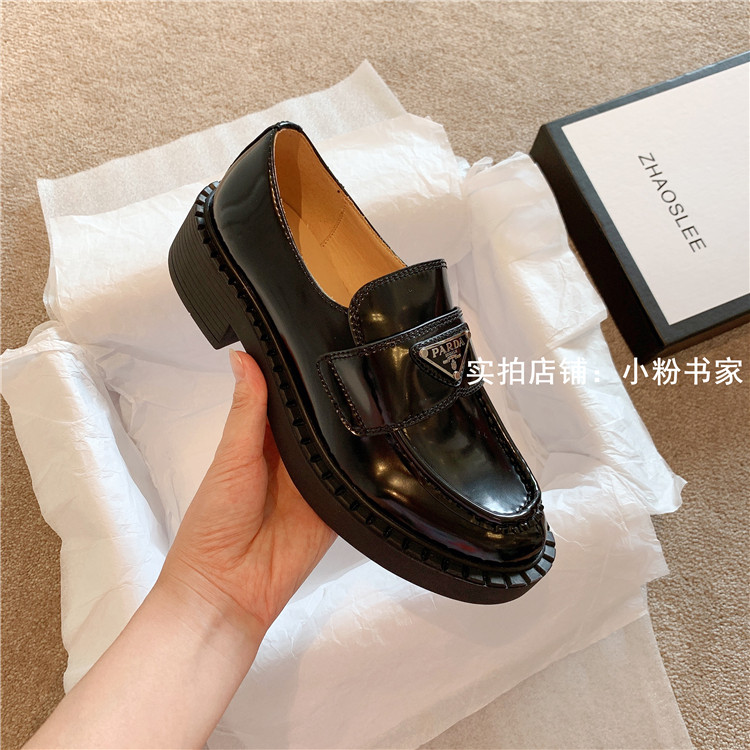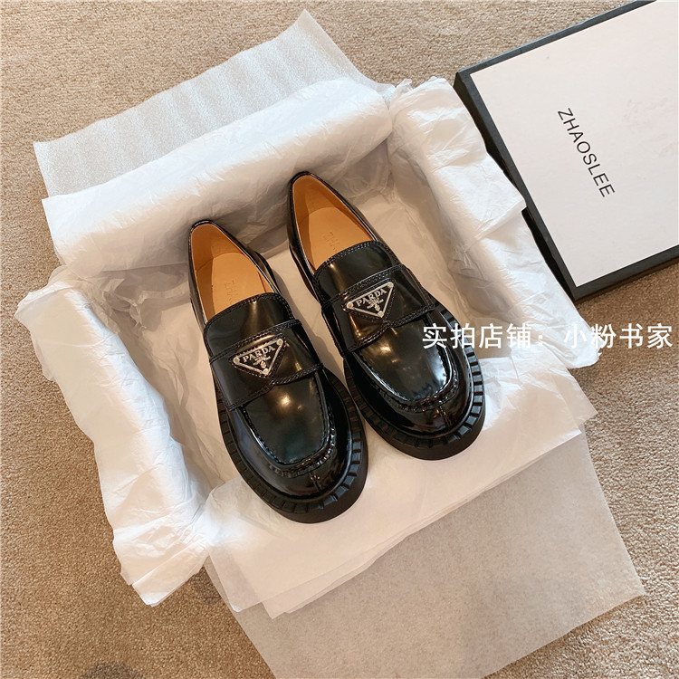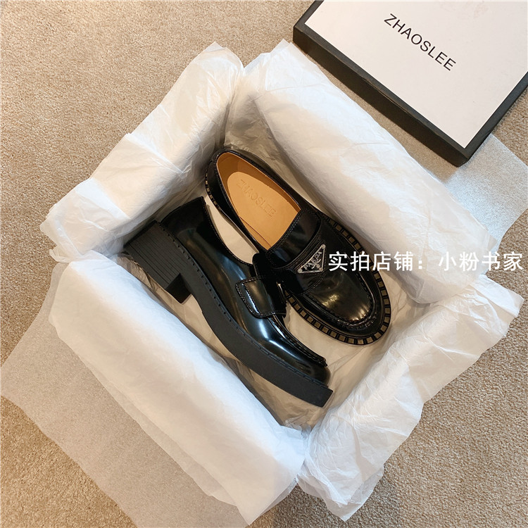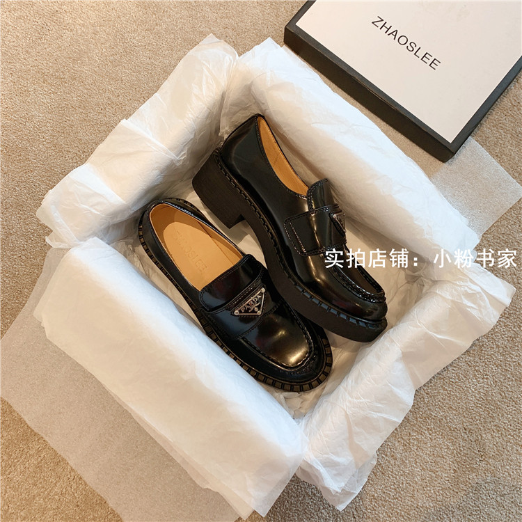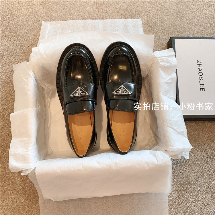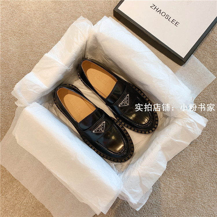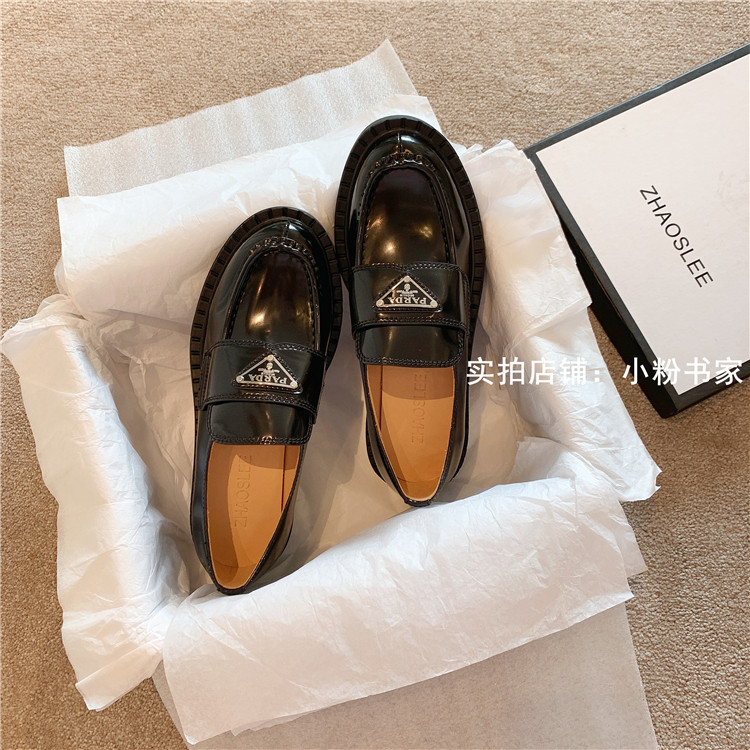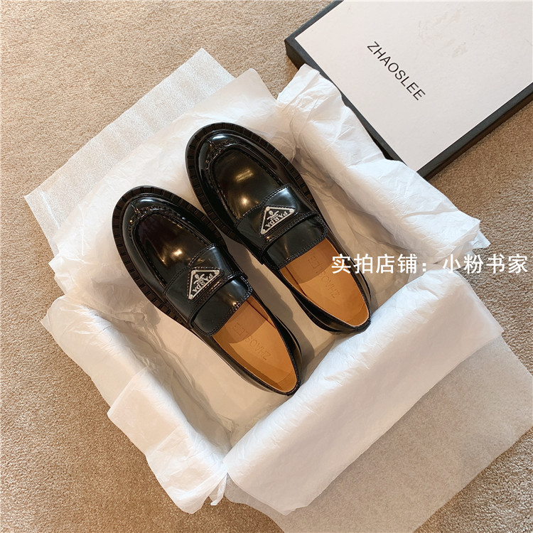 Genuine thick-soled triangular logo loafers for women, spring and autumn black British style small leather shoes, medium heel, thick heel, slip-on shoes