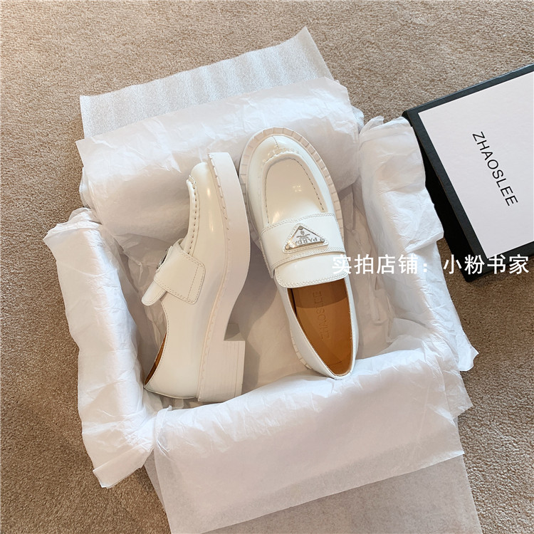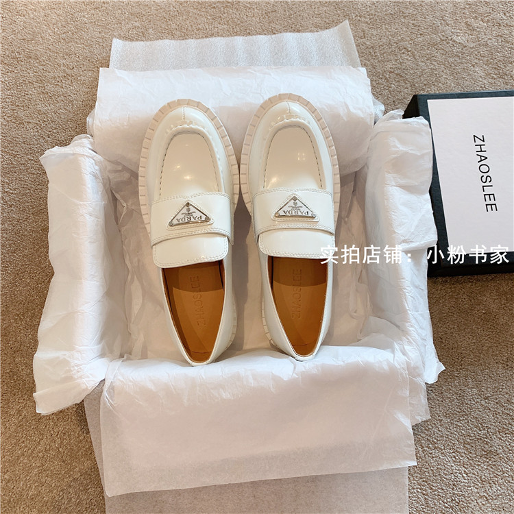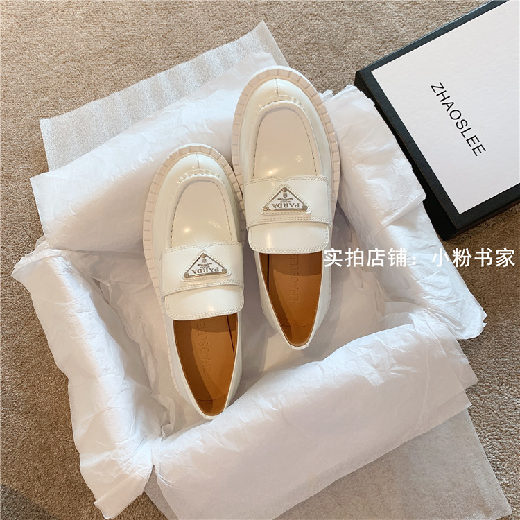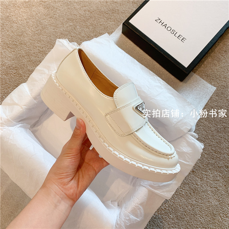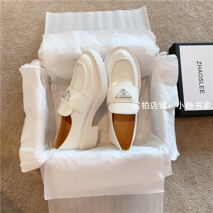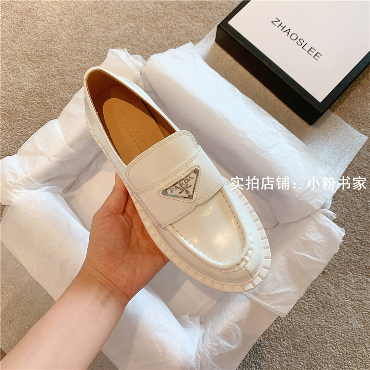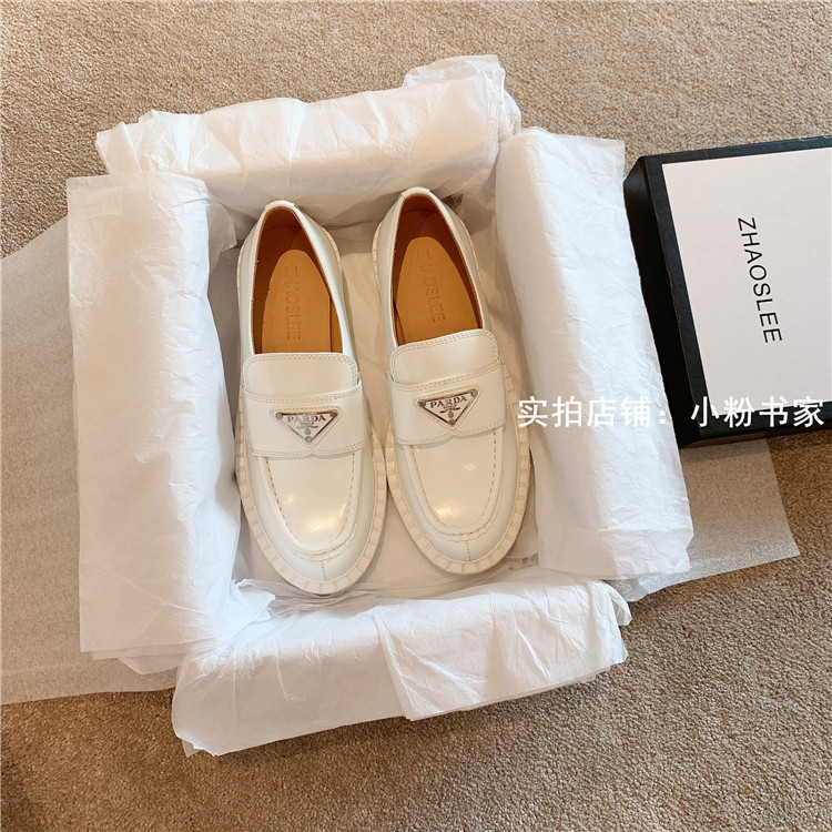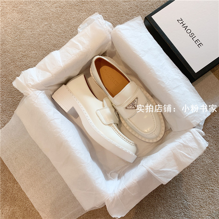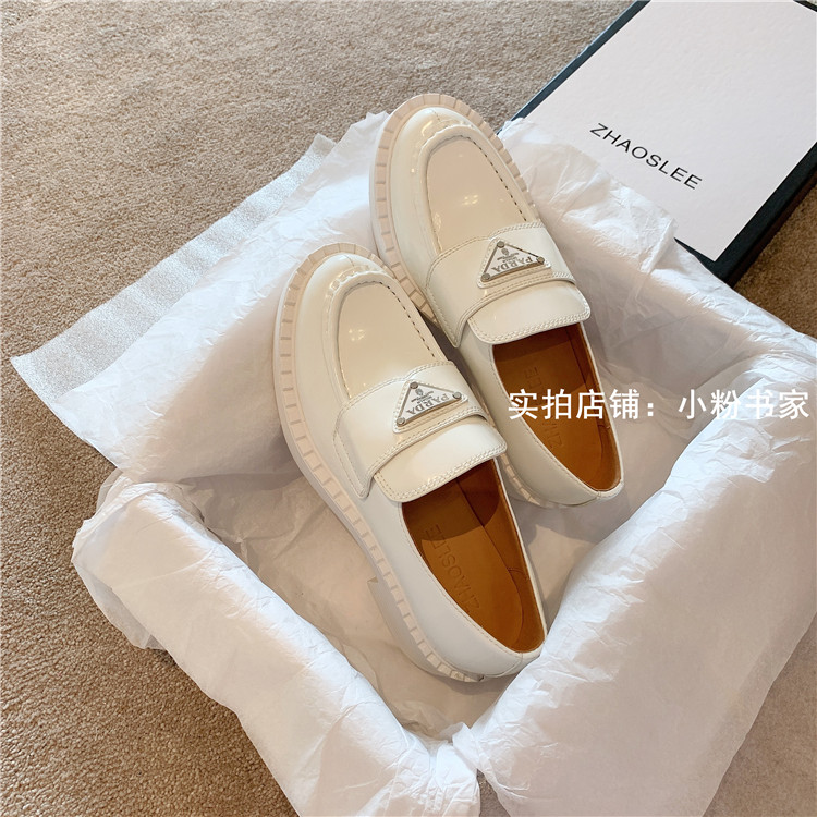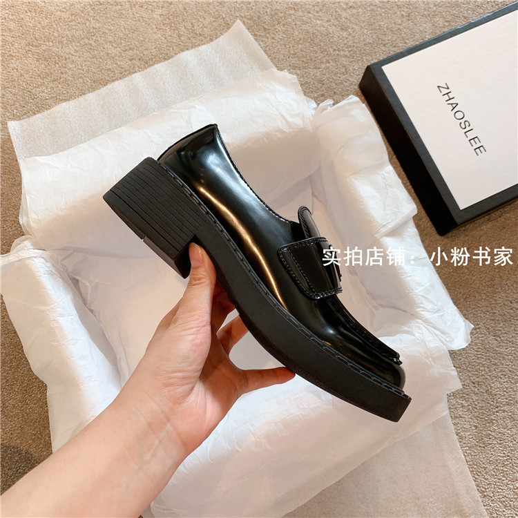 Genuine thick-soled triangular logo loafers for women, spring and autumn black British style small leather shoes, medium heel, thick heel, slip-on shoes