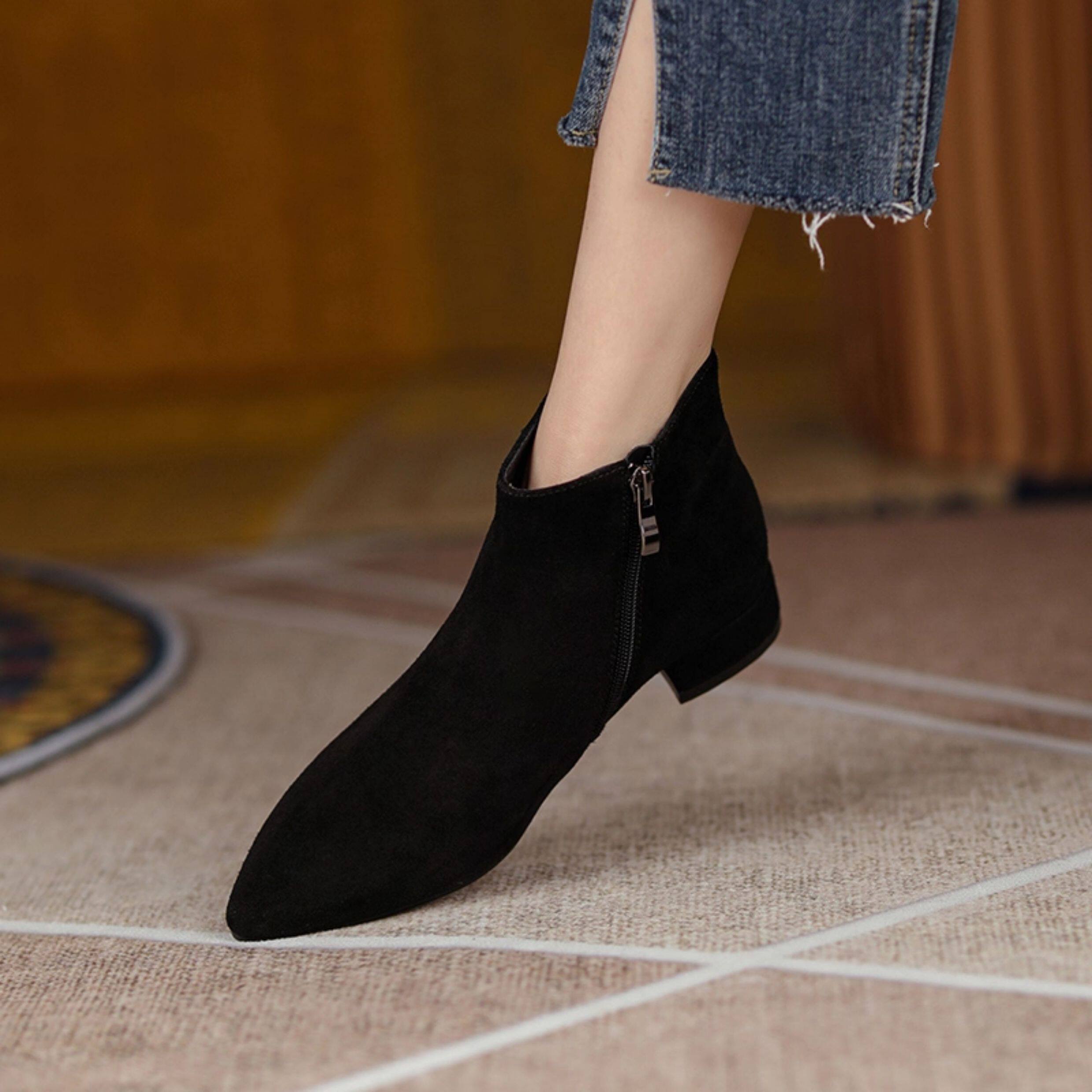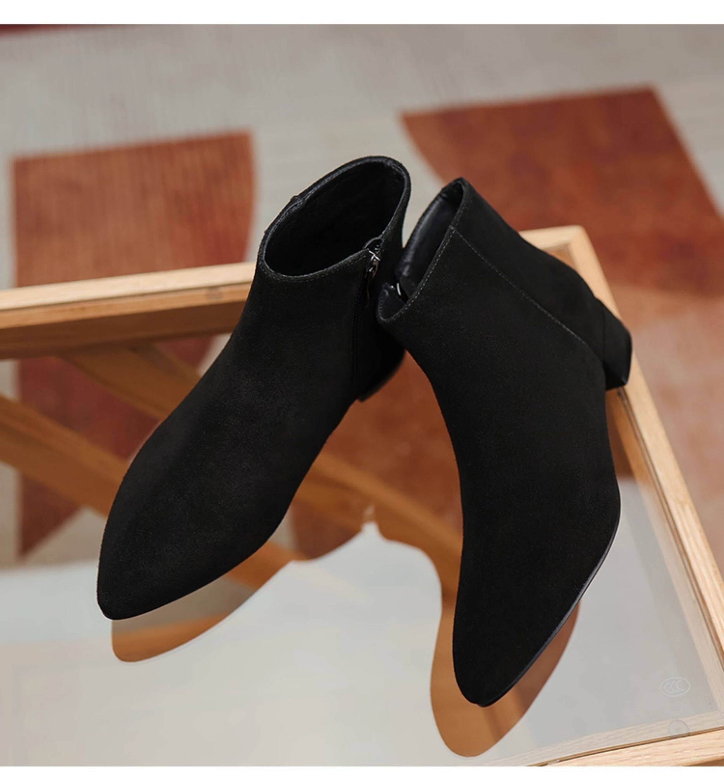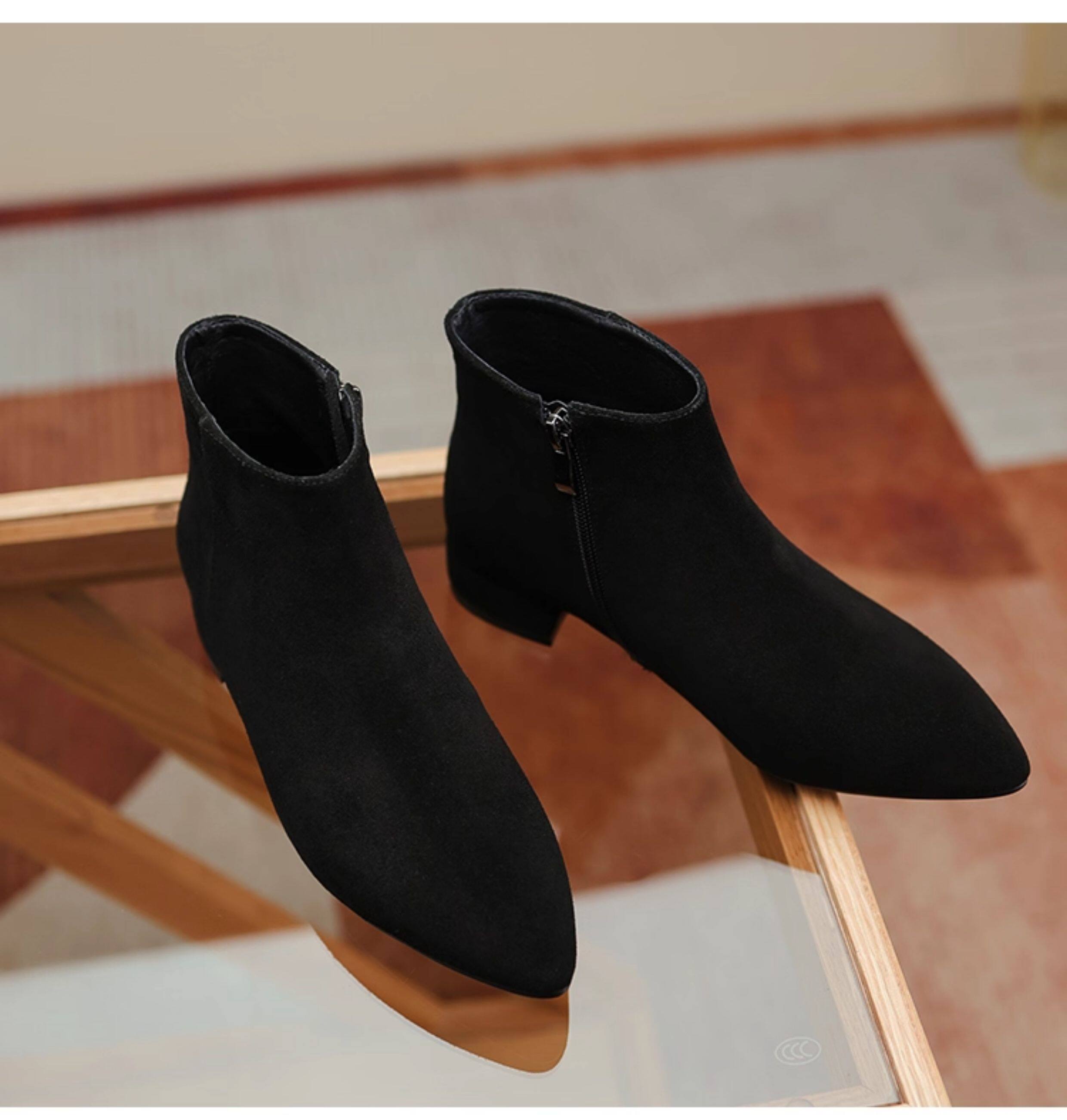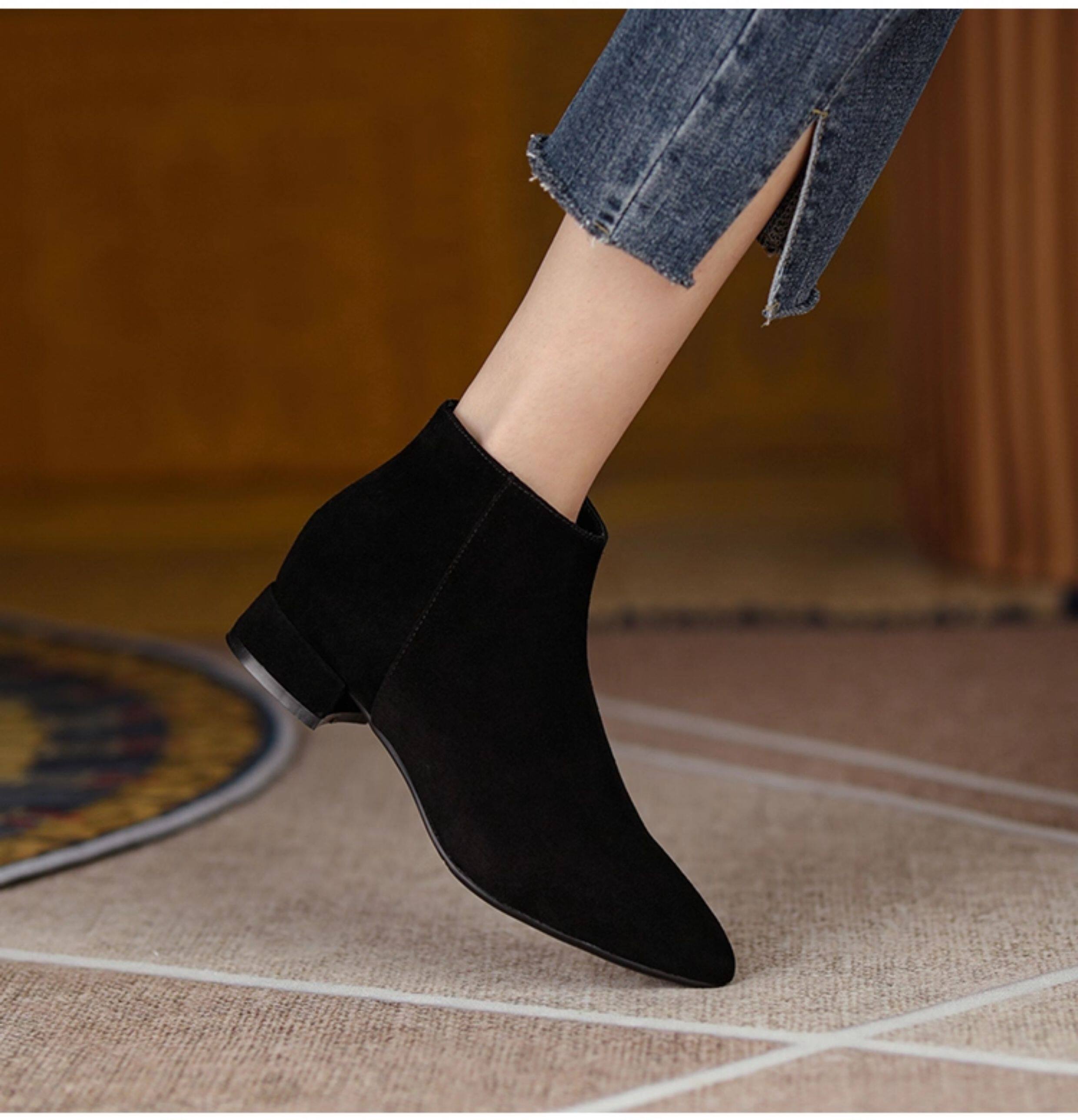 Pointed Toe Ankle Boots, Matte Genuine Leather, Low-Cut Black Commuting Boots, Large Size Women's Boots, Size 41, Medium Heel, Size 43, Chunky Heel Short Boots for Women