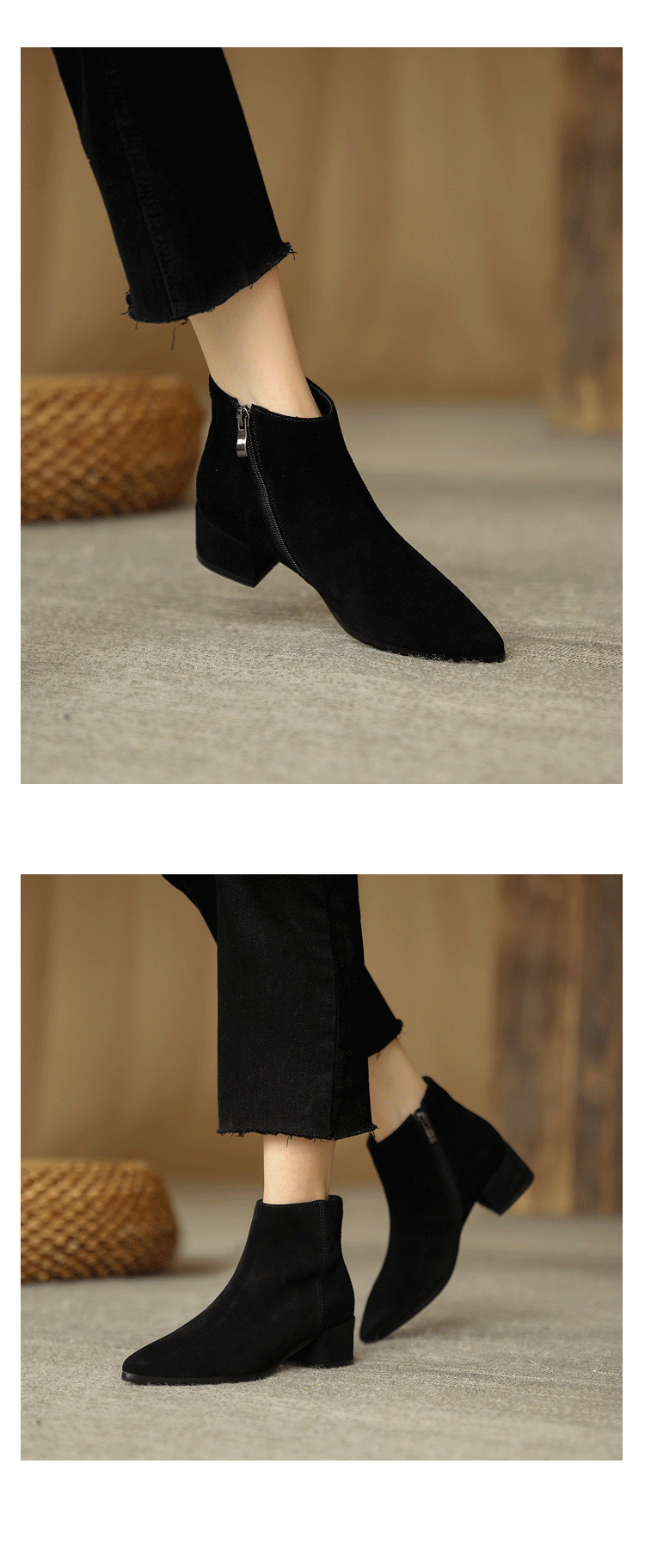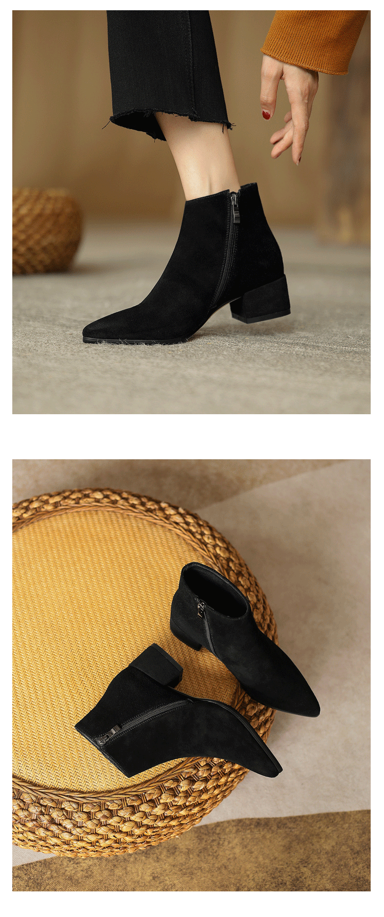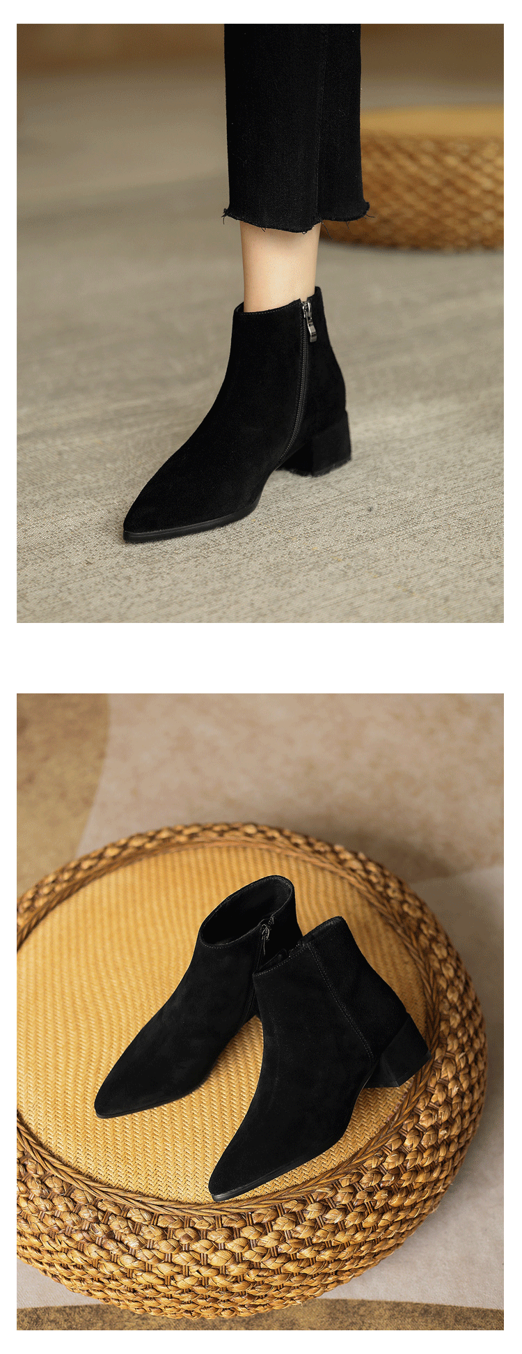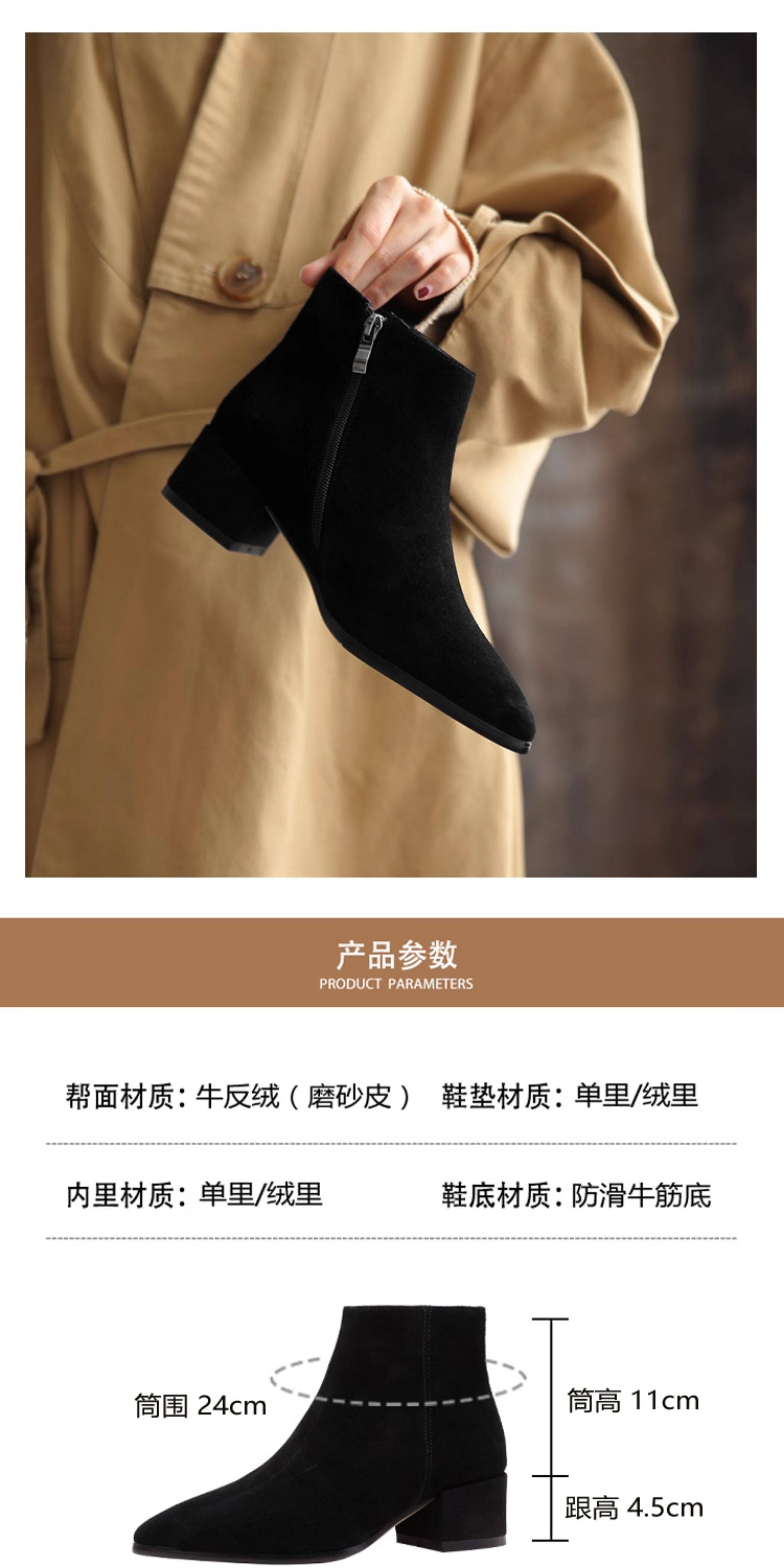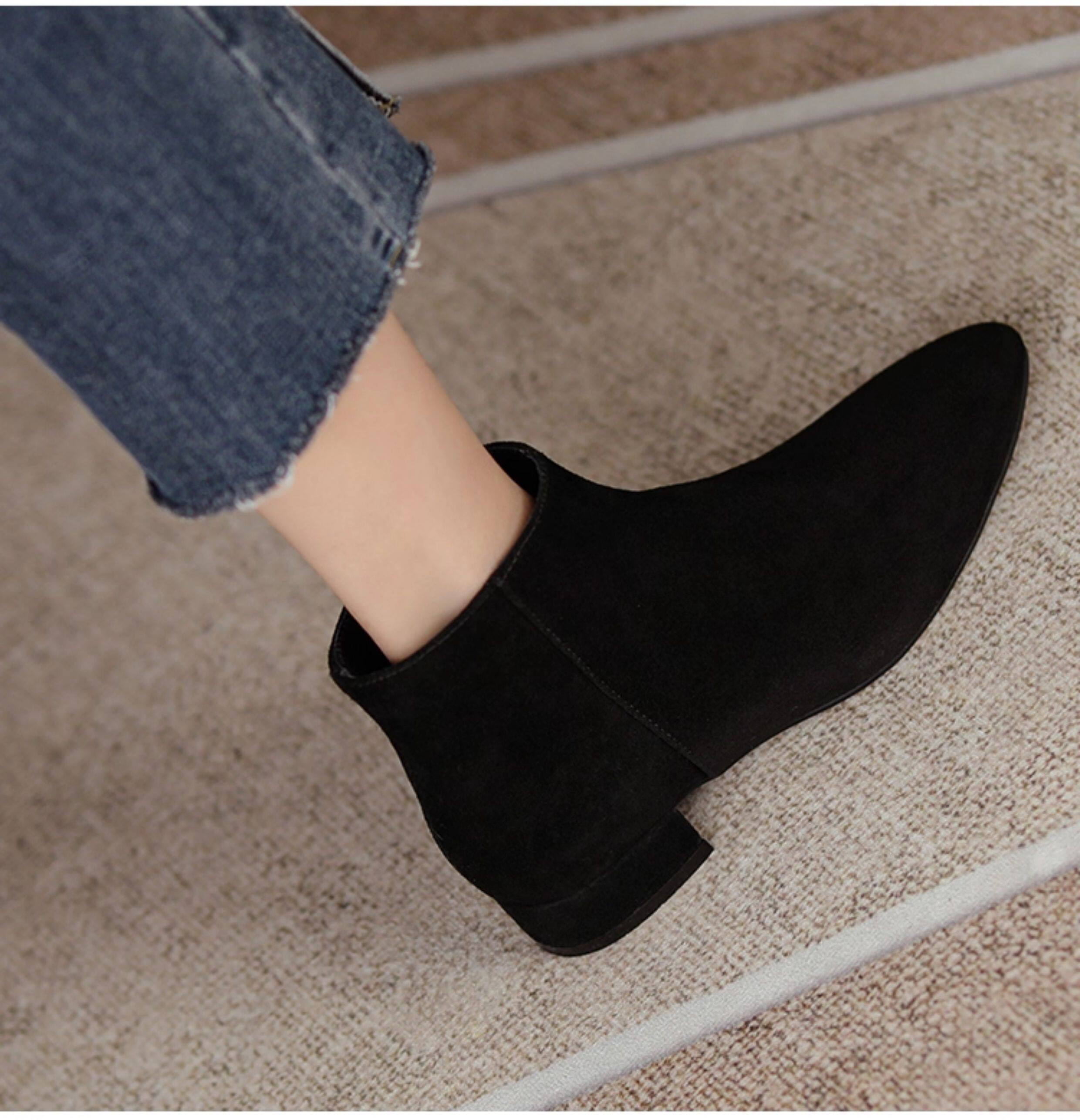 Pointed Toe Ankle Boots, Matte Genuine Leather, Low-Cut Black Commuting Boots, Large Size Women's Boots, Size 41, Medium Heel, Size 43, Chunky Heel Short Boots for Women